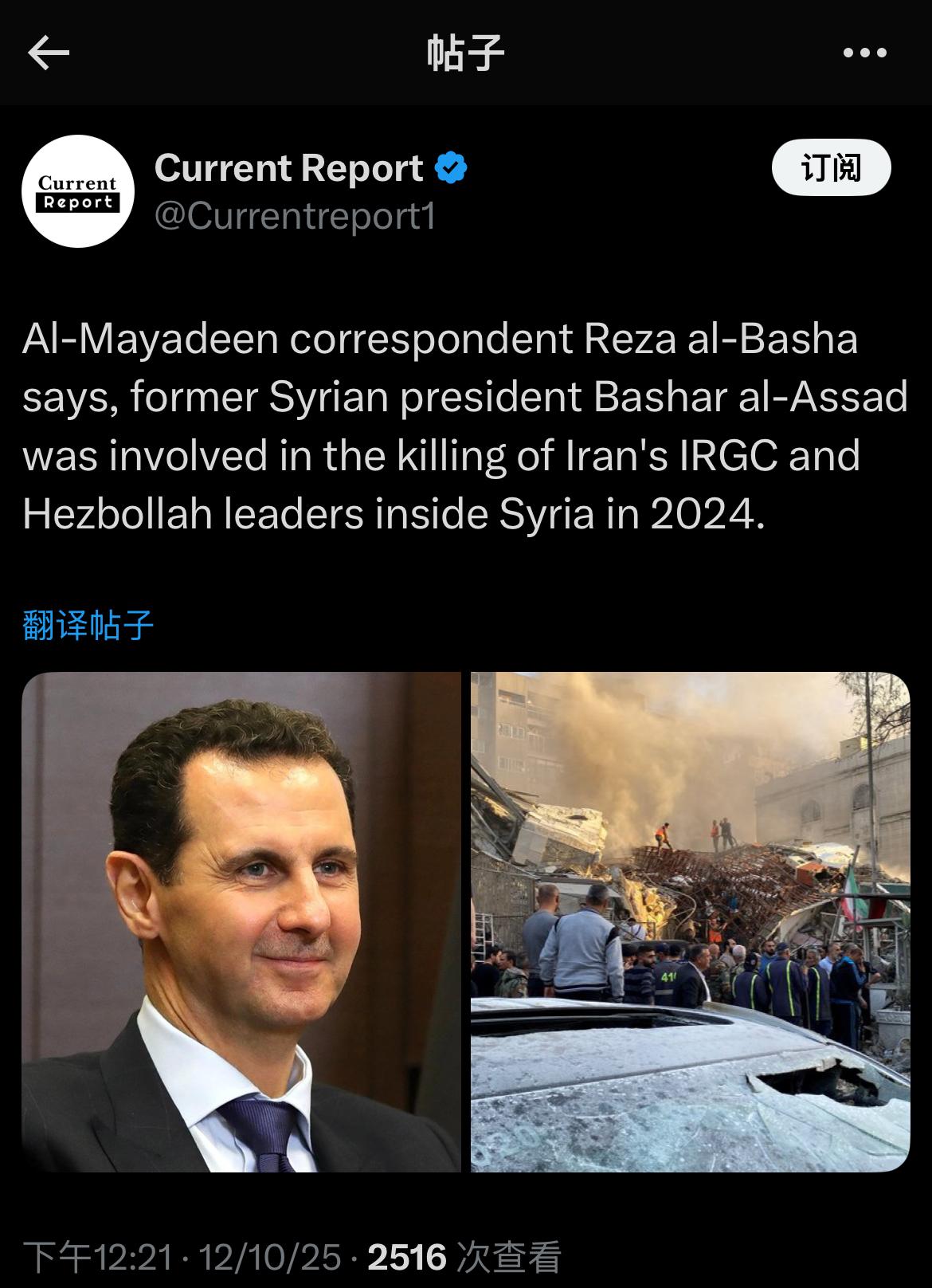 据 Al-Mayadeen 通讯员 Reza al-Basha 称,叙利亚前总统巴沙尔·阿萨德参与了 2024 年在叙利亚境内杀害伊朗伊斯兰革命卫队和真主党领导人的行动。