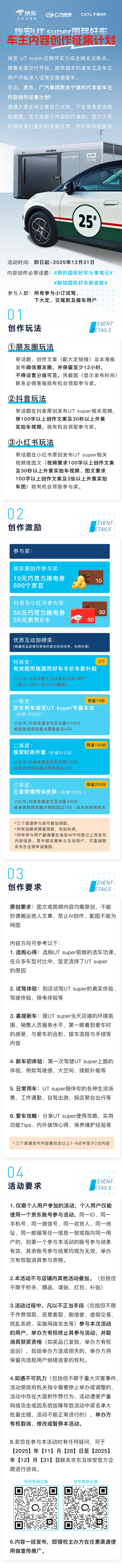 埃安 UT super 国民好车的车主 / 准车主看过来!京东 × 广汽 × 宁德时代联合发起埃安UT super国民好车 车主内容征集计划!带话题发内容就能拿福利,最高赢半价车款补贴!⏰活动时间:即日起 - 2025.12.31🎯参与人群:小定试驾 / 下大定 / 交尾款及提车用户✅创作玩法(3 平台都可参加):朋友圈:带话题 + 文案 + 海报发圈保留 12h,截图领 10 元换电券 + 500 京豆抖音:带话题发 30s + 实拍车视频 + 100 字文案,领 50 元换电券 + 50 元京东 E 卡小红书:带话题发 3 图 / 30s + 实拍车内容 + 100 字文案,同享抖音福利🏆优质内容加码:特等奖(2 名):电池租用版半价车款补贴一等奖(10 名):1599 元专属车衣还有时尚外套、王者皮肤等好礼!内容方向:选车心得 / 试驾体验 / 提车 vlog / 日常用车… 原创实拍即可!详细见下图点击链接参与活动登记:网页链接