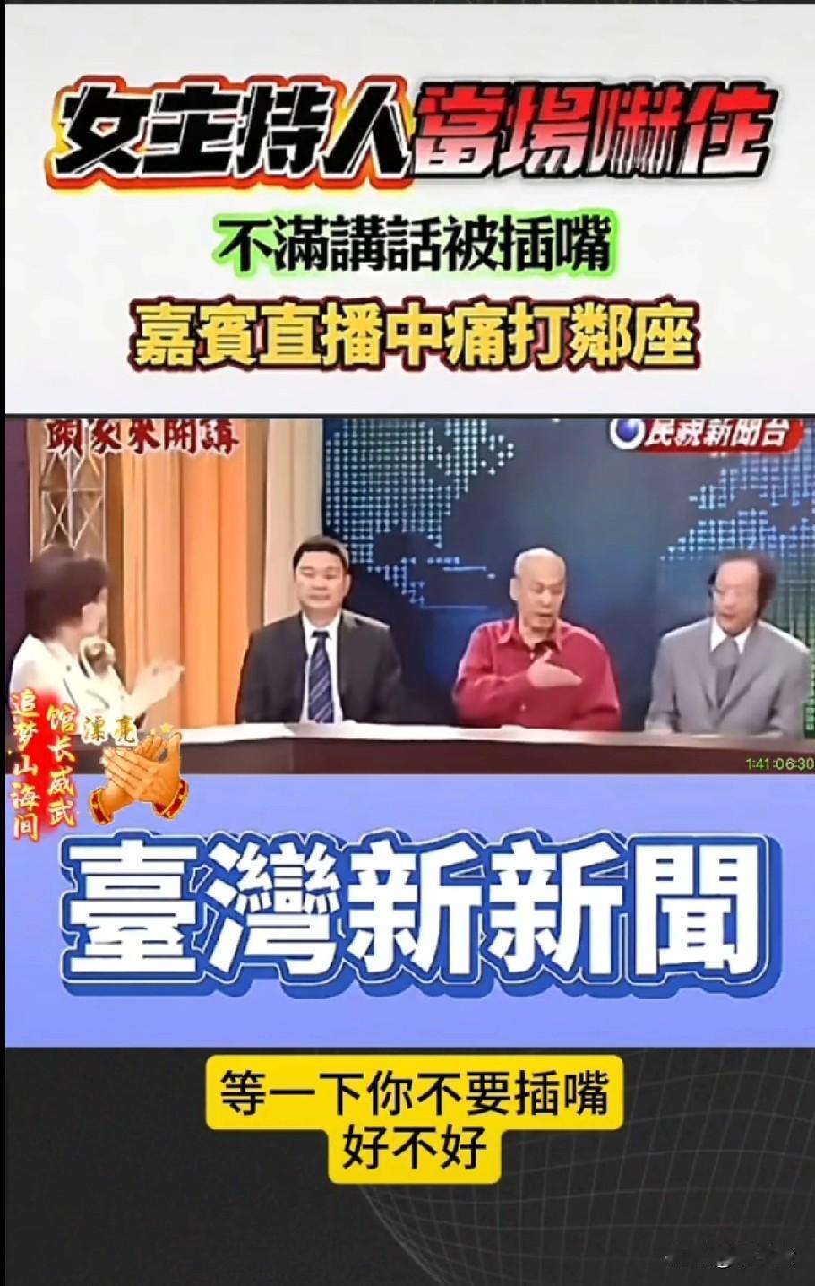 真生猛啊!台湾节目直播嘉宾怒揍邻座,女主持人吓得尖声大叫! 台湾一档节目,女主持人很漂亮,一个老年嘉宾正在专心直播,旁边一个嘉宾一直插话! 然后那个老年嘉宾怒了,直接上去老拳伺候,旁边女主持人吓得尖声惊叫,花容失色! 但是令人诧异的是,两个嘉宾打完后,整理下发型,若无其事又开始直播主持!把旁边女主持人惊呆了! 话说嘉宾真猛啊,这个劲头去对付小日子估计厉害[捂脸]