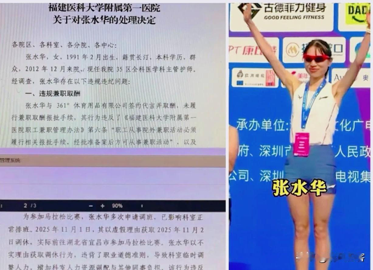 事实证明,鱼和熊掌不可兼得,有知情人士透露,最快女护士张水华已经被医院处分,原因是她之前不仅代言了361°的品牌,调休的理由不真实就去参加宜昌的马拉松比赛。 这则处分决定像一颗投入平静水面的石子,激起的涟漪远超事件本身。我们看到的,是一个普通医护人员的个人追求,与一套庞大严谨的职业规则迎头相撞。 一边是赛道上的风与自由,另一边是病房里的责与生命。这冲突太经典,也太刺痛。网友迅速分成两派:一派怒斥医院“不近人情”,另一派则坚持“无规矩不成方圆”。 但如果我们只停留在这里争吵,就太可惜了。这件事真正戳中的,是这个时代无数“两栖青年”的集体困境。谁不想在格子间之外,拥有另一片绽放自我的天地? 我查了下数据,中国马拉松赛事数量十年间增长了近50倍。奔跑,早已超越运动本身,成为年轻人对抗庸常、确认自我的精神仪式。张水华,或许只是其中跑得比较快的那一个。 医院的逻辑同样坚不可摧。医护行业的特殊性,决定了它必须用最严格的纪律来兜底生命安全。任何“不真实”的调休理由,都可能被视作对这套信任体系的微小侵蚀。 问题出在哪?或许出在那个“不真实”的理由上。当个人发展必须通过“编造理由”才能挤出空间,本身就说明,我们许多行业的刚性管理模式,与个体日益丰富的成长需求之间,出现了巨大的缝隙。 这不是张水华一个人的尴尬。有多少人,一边在朋友圈晒着副业成果,一边小心翼翼对领导屏蔽?我们习惯了在双重身份间闪转腾挪,却很少被鼓励光明正大地,成为一个“完整的人”。 体制需要稳定可控,人心向往星辰大海。这二者,难道天生就是一场零和博弈?我看未必。去年,苏州某医院就公开支持职工参与马拉松赛事,并视为医院活力的体现。 管理的最高境界,从来不是把人管“死”,而是激发人的潜能与认同。当一名护士在赛道上为医院赢得赞誉,那份自豪感带回病房,会不会转化为更饱满的工作状态? 处分一个人很简单,难的是创造一个能让“张水华们”不必说谎的环境。需要改变的,或许不是奔跑的脚步,而是我们看待“职业人”的狭隘定义。 真正的进步,是让每一个在专业赛道和人生赛道上奋力奔跑的人,都能昂首挺胸,无需伪装。鱼和熊掌,或许本就该能兼容于一个更开阔、更人性化的时代餐盘之中。