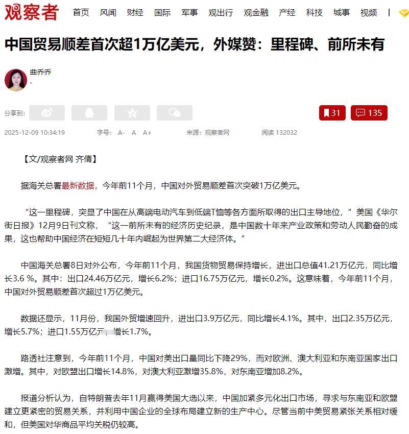 中国首次突破!美国媒体争相报道! 海关总署刚公布的数据显示,今年前11个月,咱国家外贸顺差头一回超过1万亿美元。这可不是小数目,是中国外贸史上实打实的大里程碑事件。 美国《华尔街日报》也说,这么罕见的纪录,能看出来中国不管是高端电动汽车,还是便宜T恤,出口都占优势。 这都是几十年产业政策攒下的家底,再加上咱老百姓实打实的辛苦付出,也正因为这样,中国才在短短几十年里变成了世界第二大经济体。 作为中国人,看到这成就,心里真挺自豪的,这可不只是数字好看,更说明咱中国的产业有硬实力,经济扛风险的本事也强。 可能有人不明白,顺差超万亿到底是啥概念?说白了,就是前11个月咱卖给全世界的货,比买回来的多赚了1万亿美元。 现在全球经济都不景气,还有不少国家故意设置贸易障碍,能做到这一点特别不容易。核心原因就一个:咱的东西好,全世界都愿意买。 不管是高端货还是便宜货,咱中国的都好卖。高端制造里,新能源汽车和芯片最出彩。 汽车出口比去年多了不少,现在国外很多街头都能看到比亚迪这些中国电动车,就连汽车强国德国,咱的车也凭着便宜好用、新能源技术过硬占了不少市场。 芯片出口也涨了很多,这东西以前大多靠进口,现在咱自己能造还能大量出口,都是科研人员和工人拼出来的结果。 不光高端货,日常穿的T恤、玩的玩具、家里用的家居用品,也都是出口的主力。 这些东西虽然便宜,但质量靠谱、价格实在,全世界老百姓都离不开。从这些也能看出来,咱中国的产业体系特别全,啥都能造。 能赚这么多,还有个关键原因是咱的出口市场越来越广了。以前有人觉得咱出口主要靠美国市场,今年的数据却打了脸。 前11个月对美出口降了不少,但对欧盟出口涨了8.1%,对东盟涨了13.7%,这两个市场的增长正好补上了美国市场的下降。 更让人惊喜的是非洲市场,出口大增26.3%,成了新的增长点。专家都说,非洲市场对咱出口的拉动作用翻了好几倍,这就是咱多找市场的好处。 另外还有个容易忽略的点:今年原油、煤炭这些工业原料的进口价格降了不少,买同样多的原料花的钱少了,也帮着扩大了顺差。 但这不是主要原因,核心还是咱的东西好卖——要是没人买,原料再便宜也白搭。 可能有人会问,现在很多国家搞贸易保护,美国还特意加关税,咱的东西为啥还这么好卖? 其实答案很简单:咱的东西性价比高、实用,全世界都需要。德国媒体也说,中国出口企业扛风险的本事强,出口还是中国经济的重要增长点。 而且咱总能提前猜到全球需要啥,然后赶紧准备产能,比如现在全球都在搞新能源,咱早就布局了电动车、光伏产品,正好满足大家的需求。 很多外国媒体都承认,中国在全球供应链里是缺不了的。这不是凭空来的,是几十年产业政策发力,再加上咱老百姓辛苦付出换来的。 以前咱可能靠劳动力便宜,现在靠的是技术、完整的产业链,还有多找市场的思路。而且咱不只是靠卖货赚钱,还对外投资帮着其他国家一起发展。 这个1万亿美元的顺差,是里程碑更是底气,那些说中国货不行、外贸不行的话,在实打实的成绩面前根本站不住脚。 作为中国人,咱有理由骄傲,也相信未来中国外贸还能创造更多好成绩,经济会越来越红火。