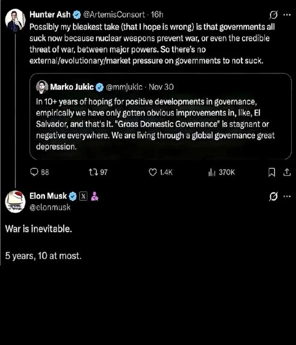 马斯克凌晨3点不睡觉,突发警告,给全世界浇了盆冷水: 未来5到10年,战争无法避免! 理由直击要害:全球性债务危机、持续走低的生育率,这俩都是历史上战争的“老诱因”。更要命的是,飞速发展的AI还可能添柴助燃。 大人物盯着全球趋势,普通人却还在为三餐四季奔波。网友感慨:清醒着担心未来太痛苦,糊涂过日子又不安,到底该咋选?