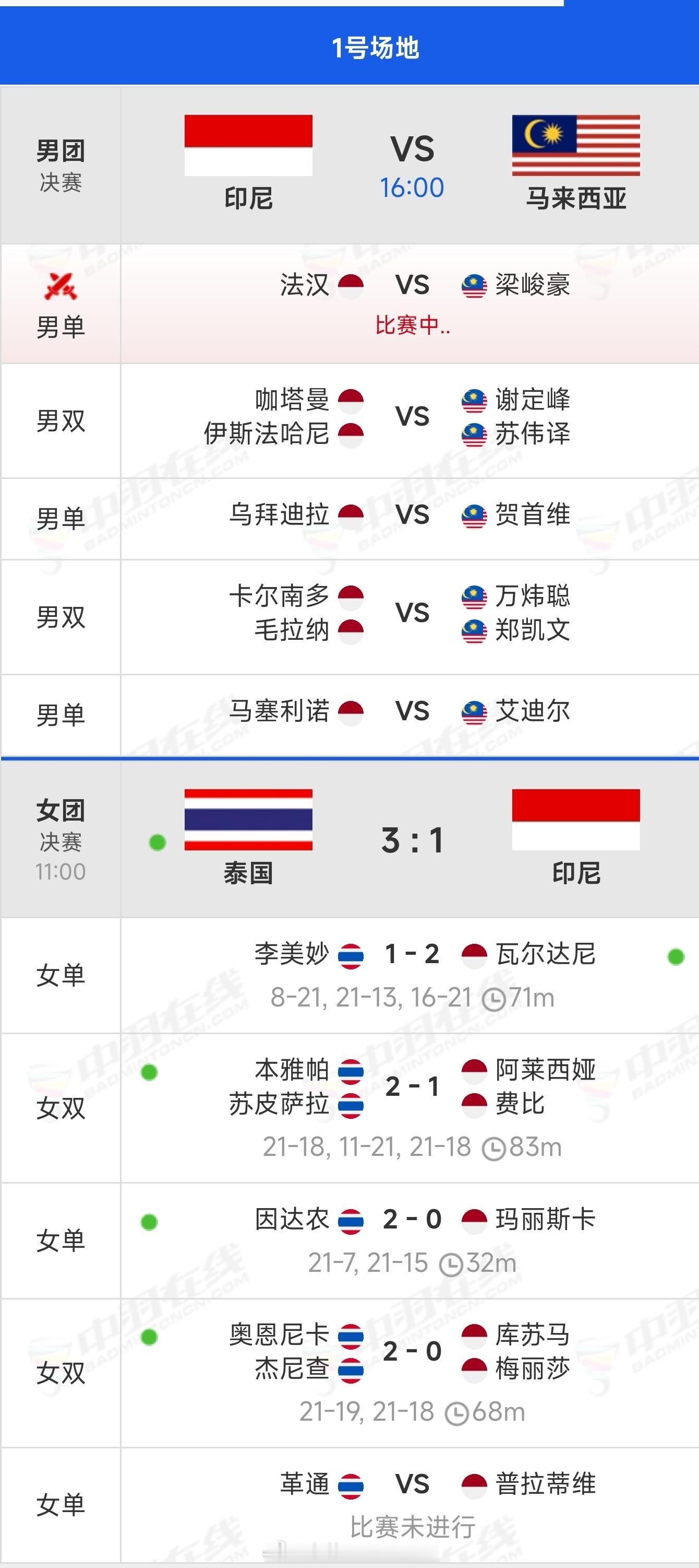2025年东南亚运动会羽毛球🏸男女团决赛赛况如下图女团决赛:泰国🇹🇭🏆 3️⃣:1️⃣ 🥈印尼🇮🇩男团决赛:印尼🇮🇩 进行中 马来西亚🇲🇾羽毛球