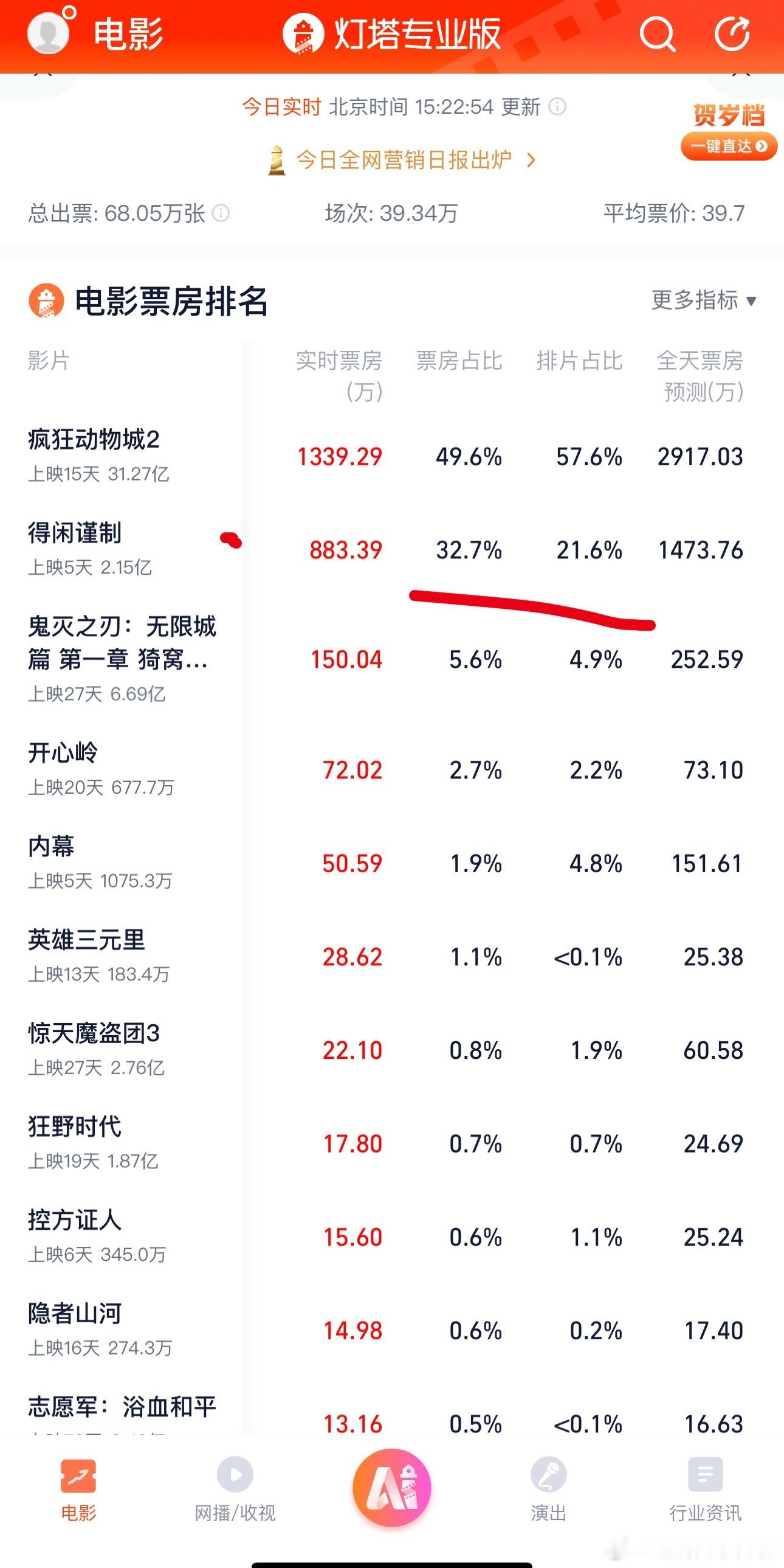 得闲谨制今天表现挺稳,最新票房占比32.7%,不止跑赢了排片,都倍超啥样了