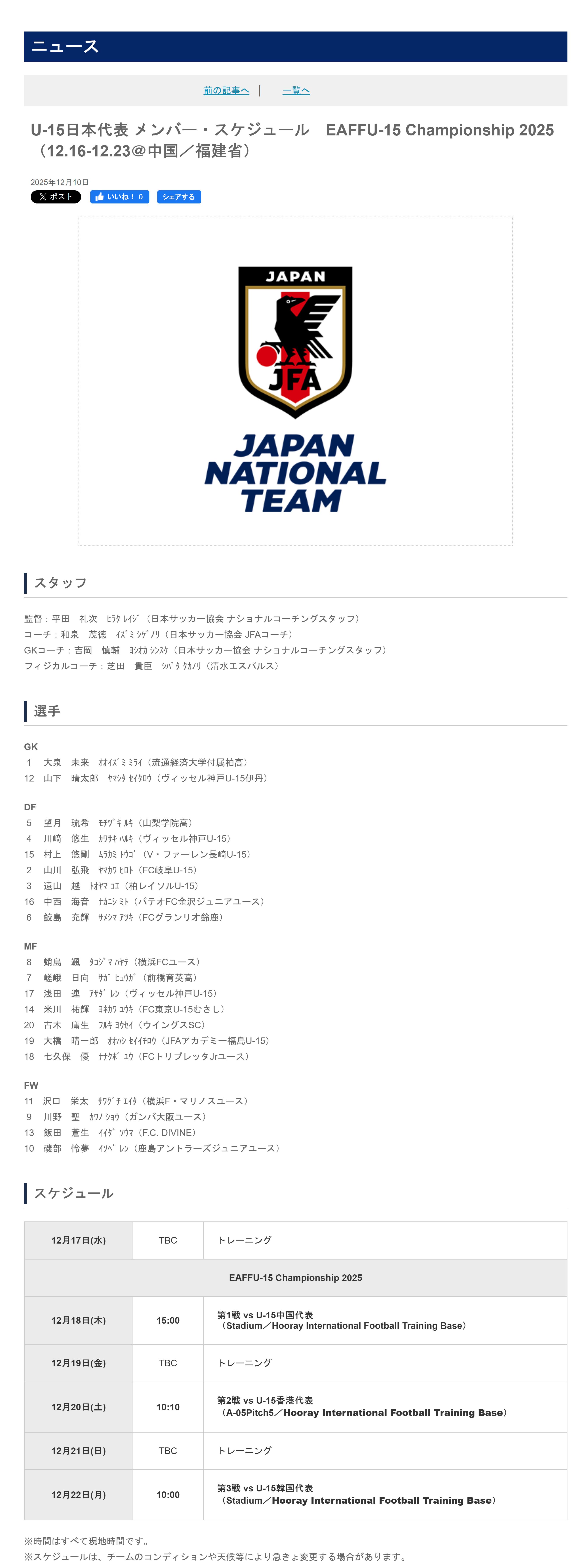 育成年代(891):12月10日,日本足协公布了即将参加于12月18日至22日在中国福建省举行的2025年东亚足联U-15锦标赛(EAFF U-15 Championship 2025)的 成员名单和赛程表。(*表示今年首次入选)【赛程表】A组第1戦12月18日15:00KO, Stadium/Hooray International Football Training Base: vs U15中国国家队A组第2戦12月20日10:10KO, A-05Pitch5/Hooray International Football Training Base: vs U15中国香港队A组第3戦12月22日10:00KO, Stadium/Hooray International Football Training Base: vs U15韩国国家队【工作人员】監督:平田 礼次(公益財団法人日本足球協会 国家教练组)教练:和泉 茂徳(日本足球協会 JFA教练)守门员教练:吉岡 慎輔 (公益財団法人日本足球協会 国家教练组)体能教练:芝田 貴臣(株式会社S-Pulse)【選手】守门员GK1 大泉 未来(OIZUMI Mirai, 流通経済大学付属柏高)12 山下 晴太郎(YAMASHITA Seitaro,Vissel神戸伊丹U-15)后卫DF5 望月 琉希(MOCHIZUKI Ruki, 山梨学院高)*4 川﨑 悠生(KAWASAKI Haruki, Vissel神戸U-15)*15 村上 悠剛(MURAKAMI Togo, V・Varen長崎U-15)*2 山川 弘飛(YAMAKAWA Hiroto, FC岐阜U-15)3 遠山 越(TOYAMA Koe, 柏Reysol U-15)16 中西 海音(NAKANISHI Mito, Pateo FC金沢Junior Youth)*6 鮫島 充輝(SAMESHIMA, FC GRANRIO鈴鹿)中场MF8 蛸島 颯(TAKOJIMA Hayate, 横浜FC Youth)*7 嵯峨 日向(SAGA Hyuga, 前橋育英高)17浅田 連(ASADA Ren, Vissel神戸U-15)*14米川 祐輝(YONEKAWA Yuki, FC東京U-15武蔵)20古木 庸生(FURUKI Yosei, WINGS SC)19大橋 晴一郎(OHASHI Seiichiro, JFA学院福島U-15)*18七久保 優(NANAKUBO Yu,東京都渋谷区·FC Toripletta Jr Youth)*前锋FW11 沢口 栄太(SAWAGUCHI Eita, 横浜F・Marinos Youth)9 川野 聖(KAWANO Sho, Gamba大阪Youth)*13 飯田 蒼生(IIDA Soma, 愛知県江南市·FC Divine)10 磯部 怜夢(ISOBE Ren, 鹿島Antlers Junior Youth)*