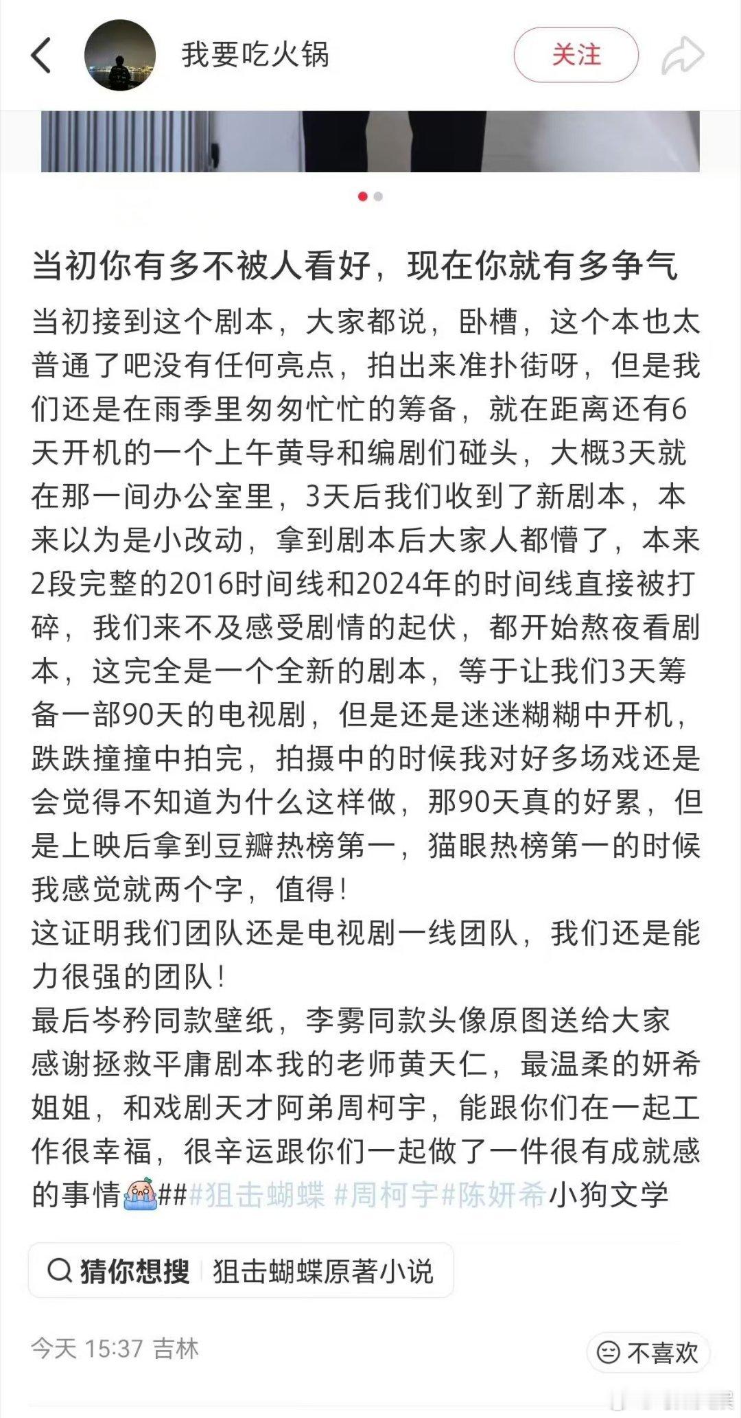 狙击蝴蝶编剧黄天仁狙击蝴蝶剧组工作人员发文狙击蝴蝶剧组工作人员发文,哇塞,