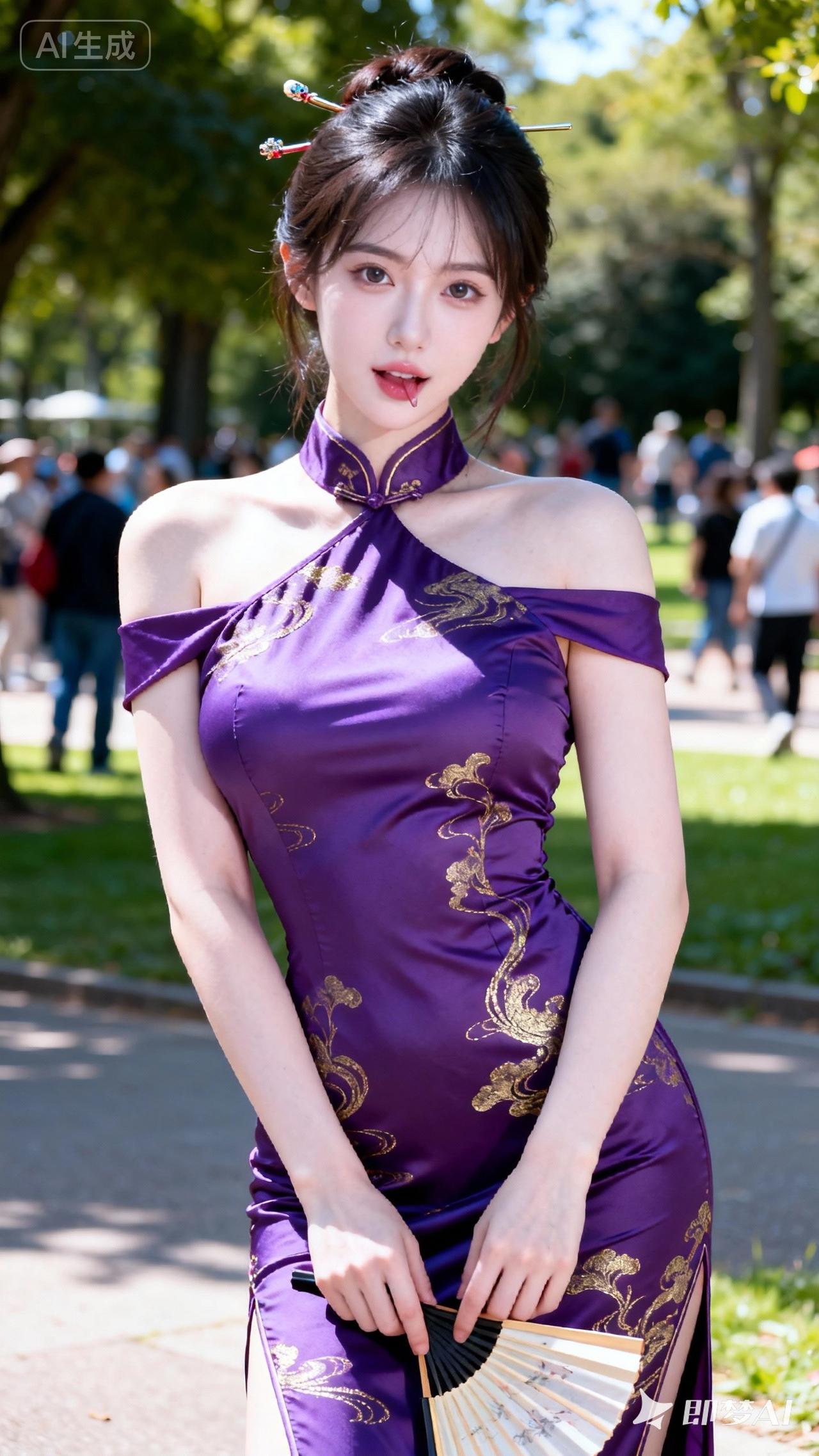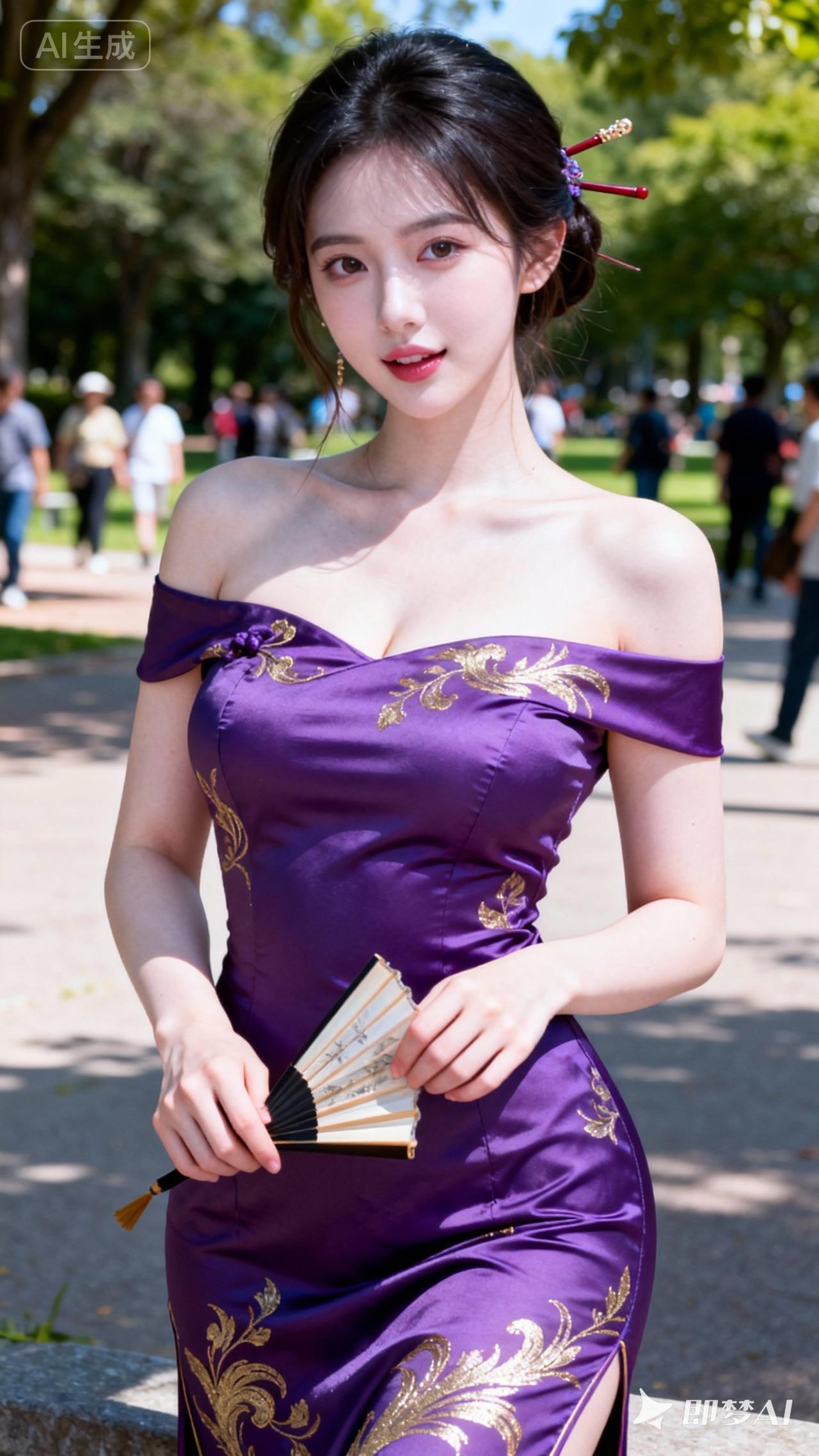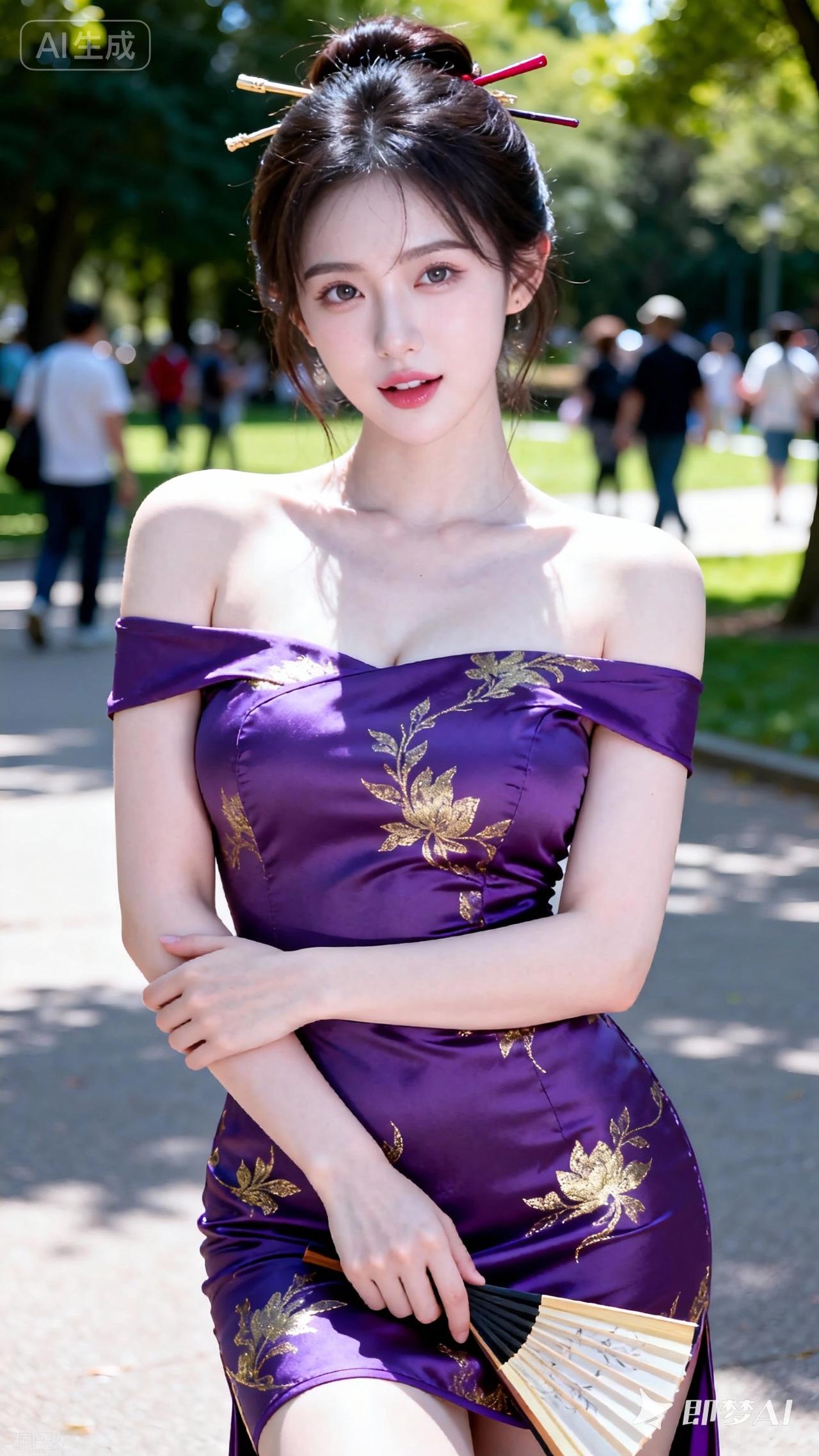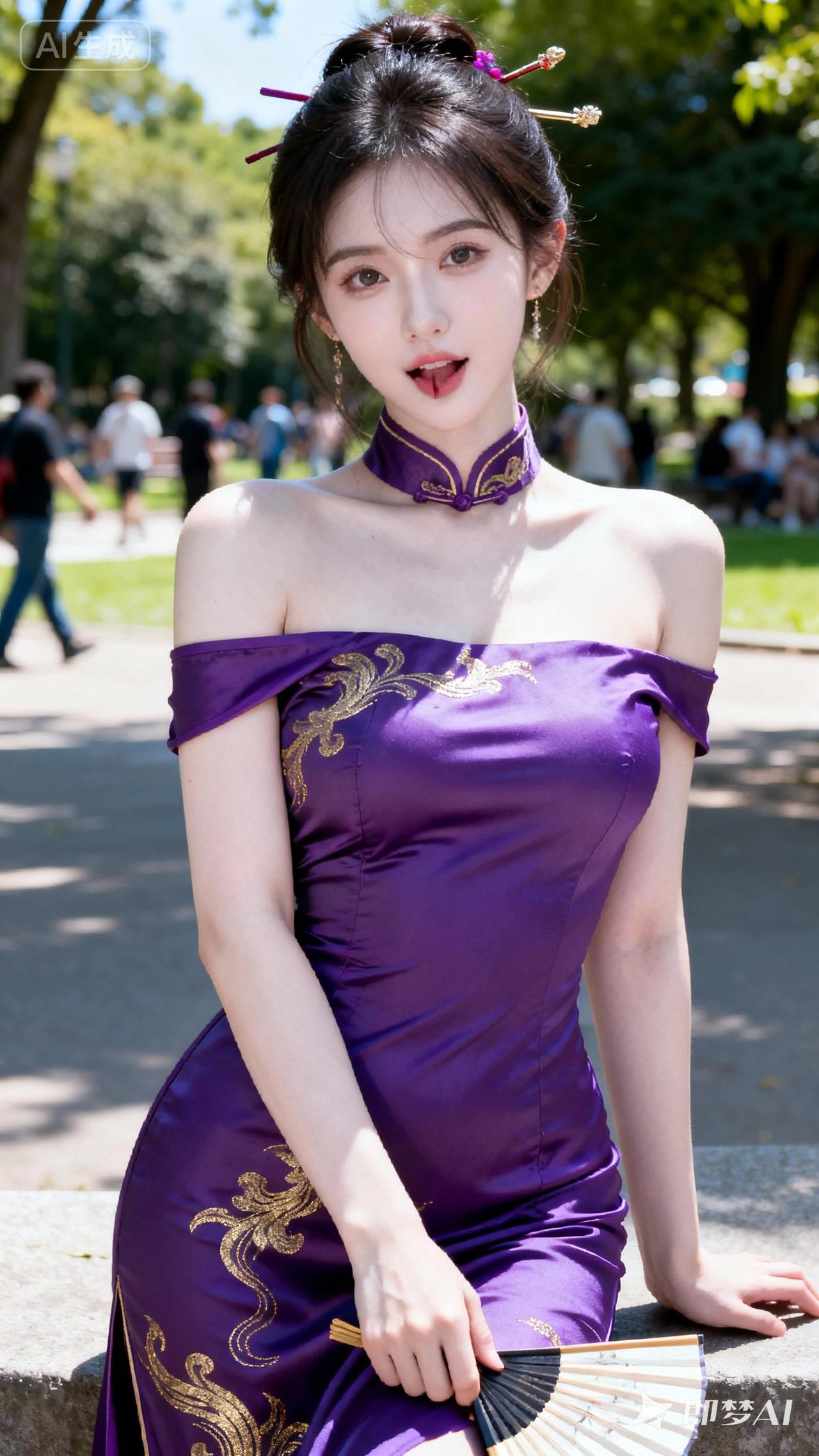 紫衣美人,扇影生姿。