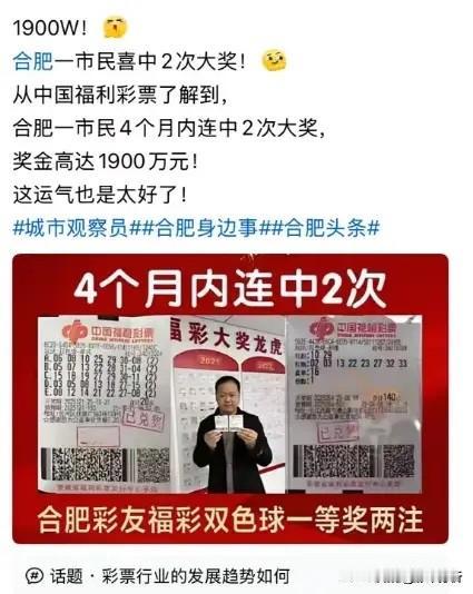 有人称安徽同一彩友今年6月和10月各中头奖,金额分别是725万和1175万,总奖金高达1900万以上,看似很唬人但一直关注中奖新闻的我却从没找到来源,而且说的最近一次中奖是今年10月,距今过去俩月突然提起来似乎也奇怪,总之同一人4个月内两次中头奖概率实在太低,还是等等其他消息来源共同佐证吧!
