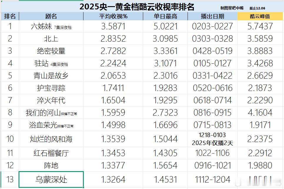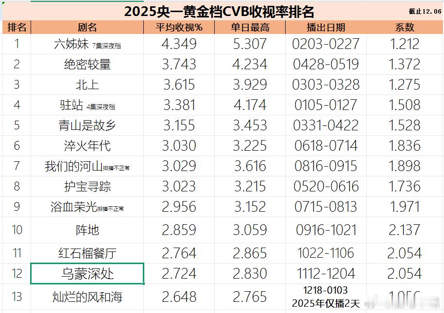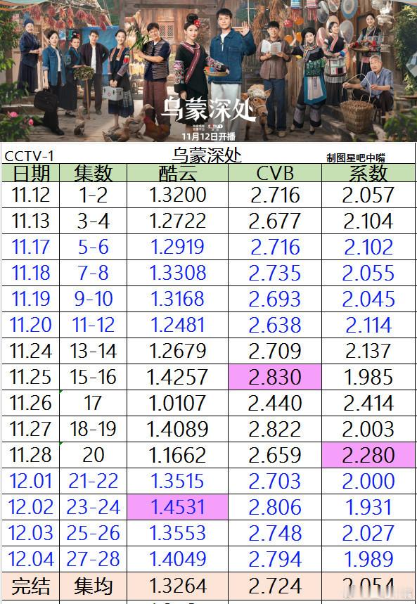 毛晓彤秦俊杰《乌蒙深处》央一收官战报,来看排名酷云集均1.3264,暂列13/13CVB集均2.724, 暂列12/13乌蒙深处