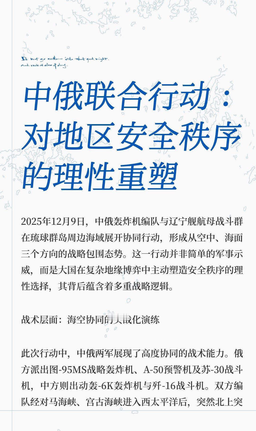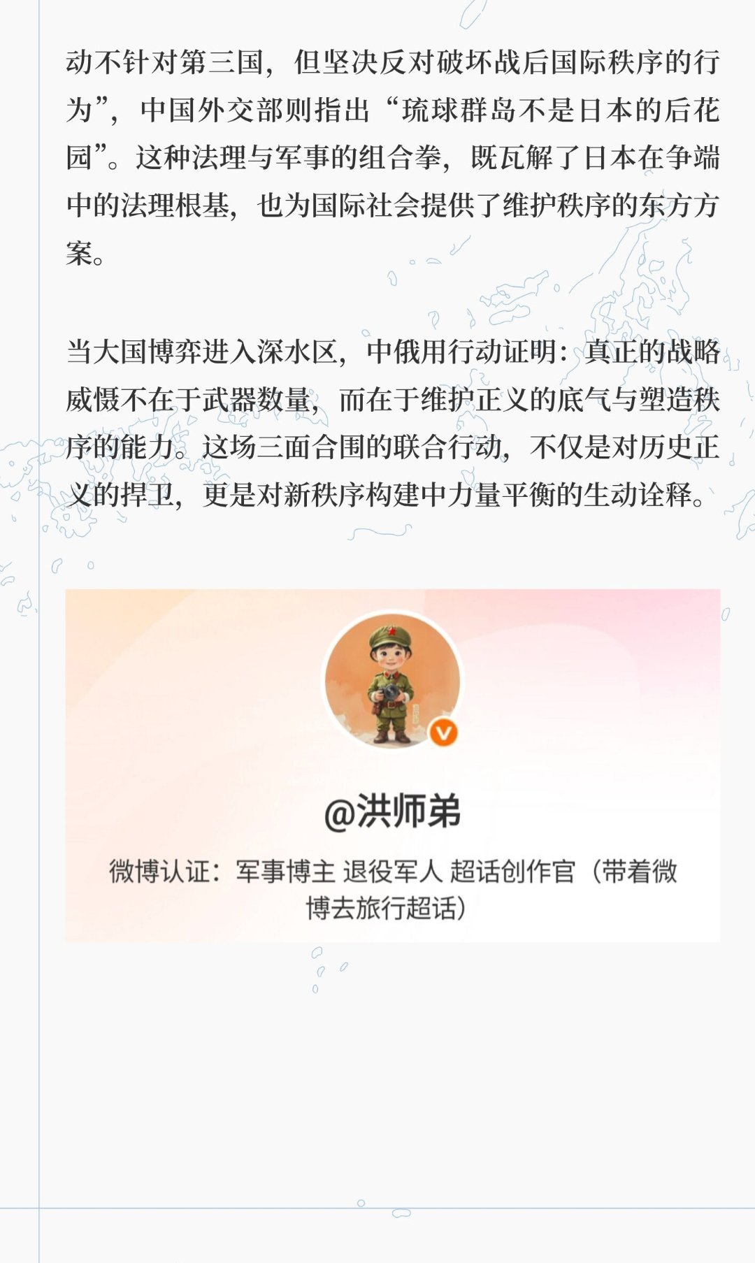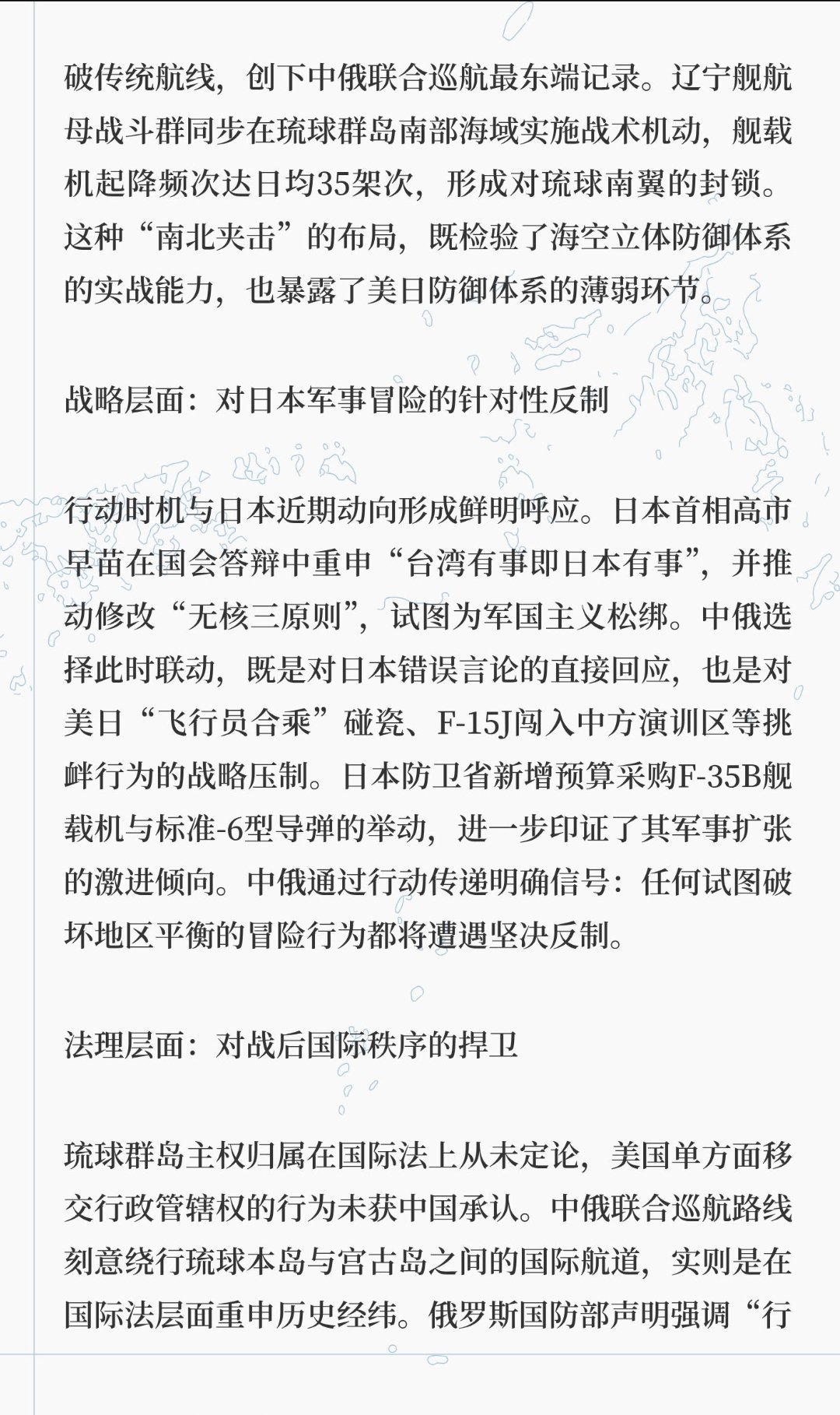 | 2025年12月9日,中俄轰炸机编队与辽宁舰航母战斗群在琉球群岛周边海域展开协同行动,形成从空中、海面三个方向的战略包围态势。此次行动中,中俄两军展现了高度协同的战术能力。俄方派出图-95MS战略轰炸机、A-50预警机及苏-30战斗机,中方则出动轰-6K轰炸机与歼-16战斗机。双方编队经对马海峡、宫古海峡进入西太平洋后,突然北上突破传统航线,创下中俄联合巡航最东端记录。辽宁舰航母战斗群同步在琉球群岛南部海域实施战术机动,舰载机起降频次达日均35架次,形成对琉球南翼的封锁。这种“南北夹击”的布局,既检验了海空立体防御体系的实战能力,也暴露了美日防御体系的薄弱环节。行动时机与日本近期动向形成鲜明呼应。日本首相高市早苗在国会答辩中重申“台湾有事即日本有事”,并推动修改“无核三原则”,试图为军国主义松绑。中俄选择此时联动,既是对日本错误言论的直接回应,也是对美日“飞行员合乘”碰瓷、F-15J闯入中方演训区等挑衅行为的战略压制。日本防卫省新增预算采购F-35B舰载机与标准-6型导弹的举动,进一步印证了其军事扩张的激进倾向。中俄通过行动传递明确信号:任何试图破坏地区平衡的冒险行为都将遭遇坚决反制。琉球群岛主权归属在国际法上从未定论,美国单方面移交行政管辖权的行为未获中国承认。中俄联合巡航路线刻意绕行琉球本岛与宫古岛之间的国际航道,实则是在国际法层面重申历史经纬。俄罗斯国防部声明强调“行动不针对第三国,但坚决反对破坏战后国际秩序的行为”,中国外交部则指出“琉球群岛不是日本的后花园”。这种法理与军事的组合拳,既瓦解了日本在争端中的法理根基,也为国际社会提供了维护秩序的东方方案。当大国博弈进入深水区,中俄用行动证明:真正的战略威慑不在于武器数量,而在于维护正义的底气与塑造秩序的能力。这场三面合围的联合行动,不仅是对历史正义的捍卫,更是对新秩序构建中力量平衡的生动诠释。