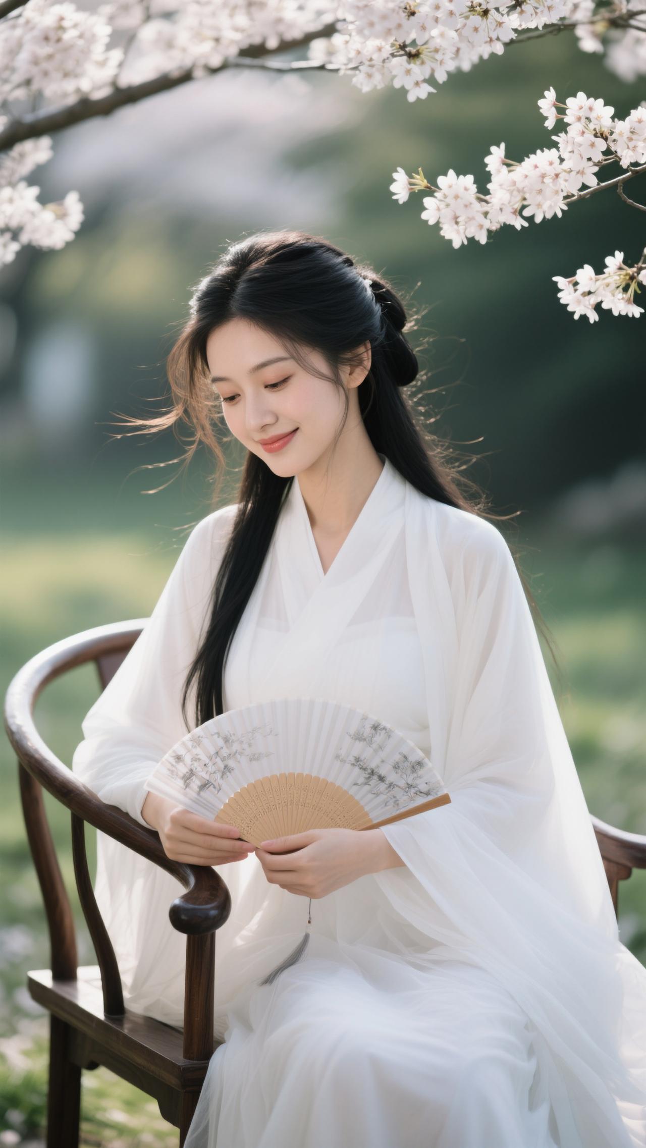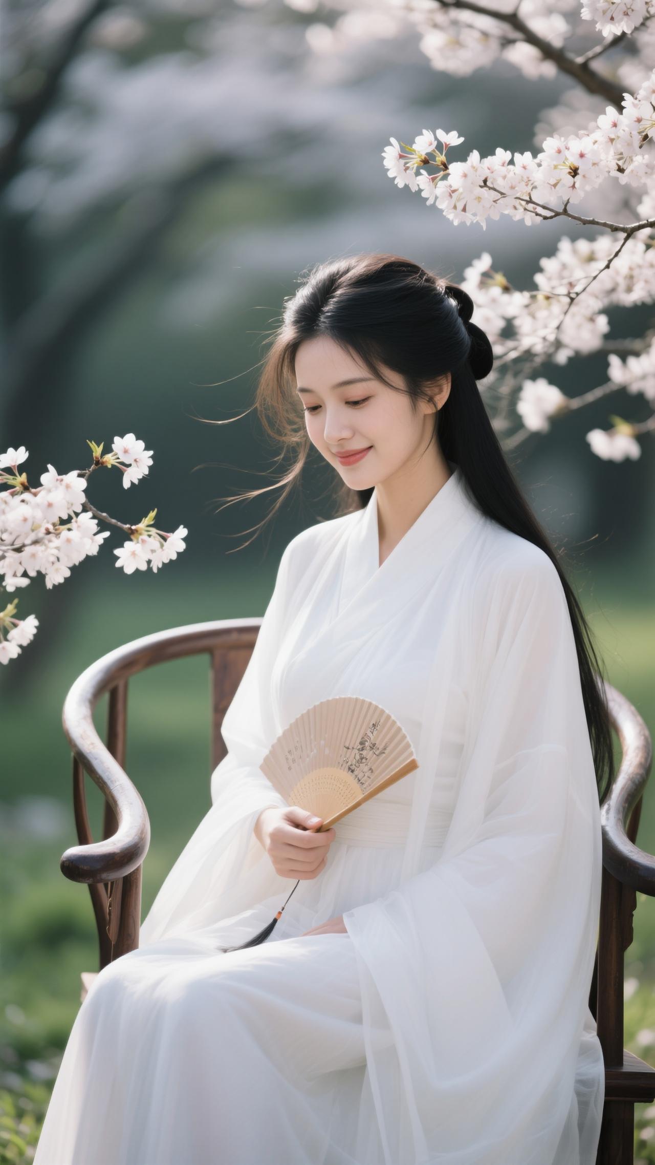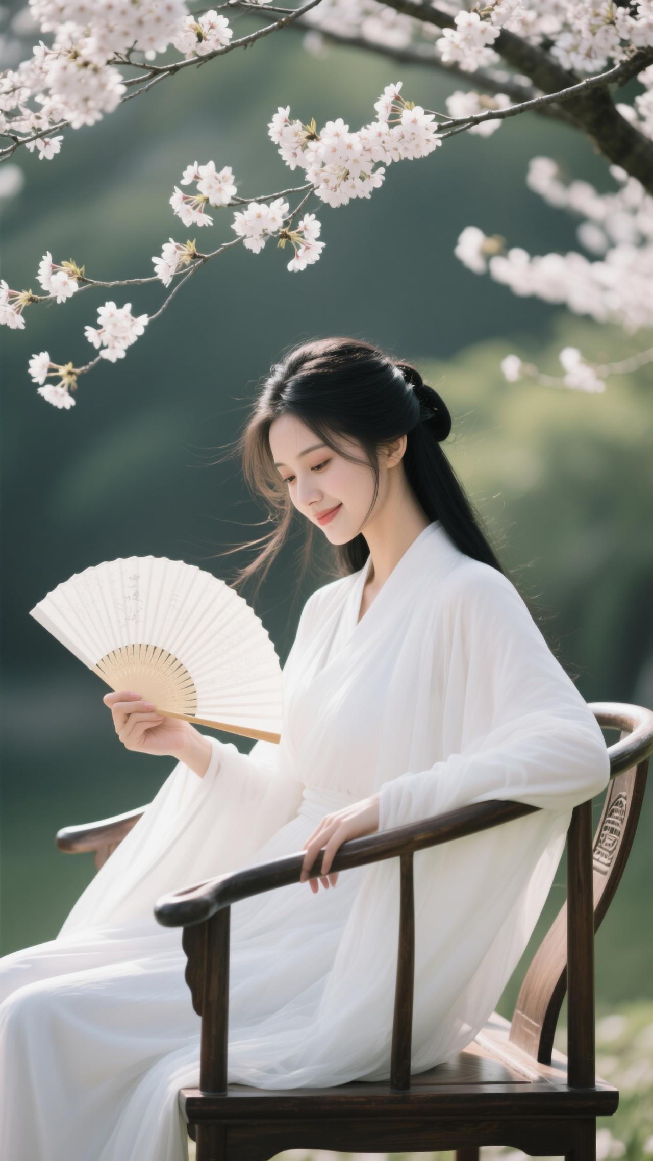 《眼儿媚·樱扇》 樱云垂处柳风柔,白袂惹香浮。 扇开轻素,鬓簪晴色,笑入春流。 闲凭竹椅听花坠,软絮落肩头。 半襟云气,一怀晴暖,都作清愁。