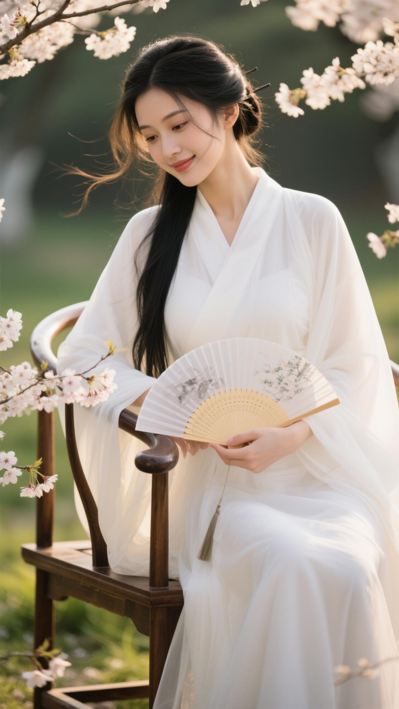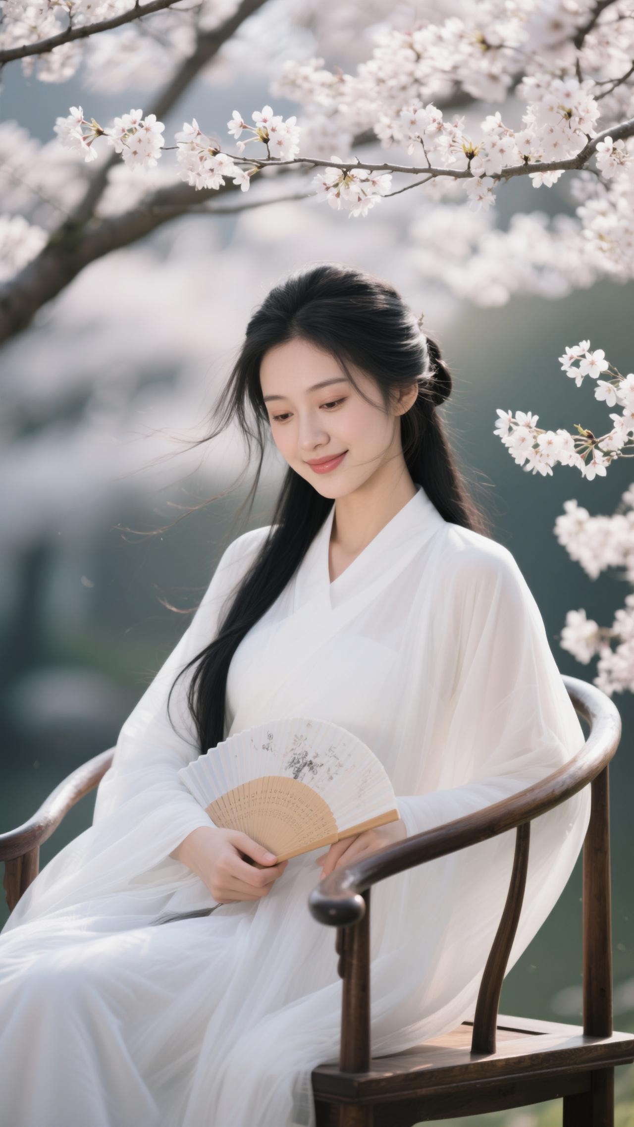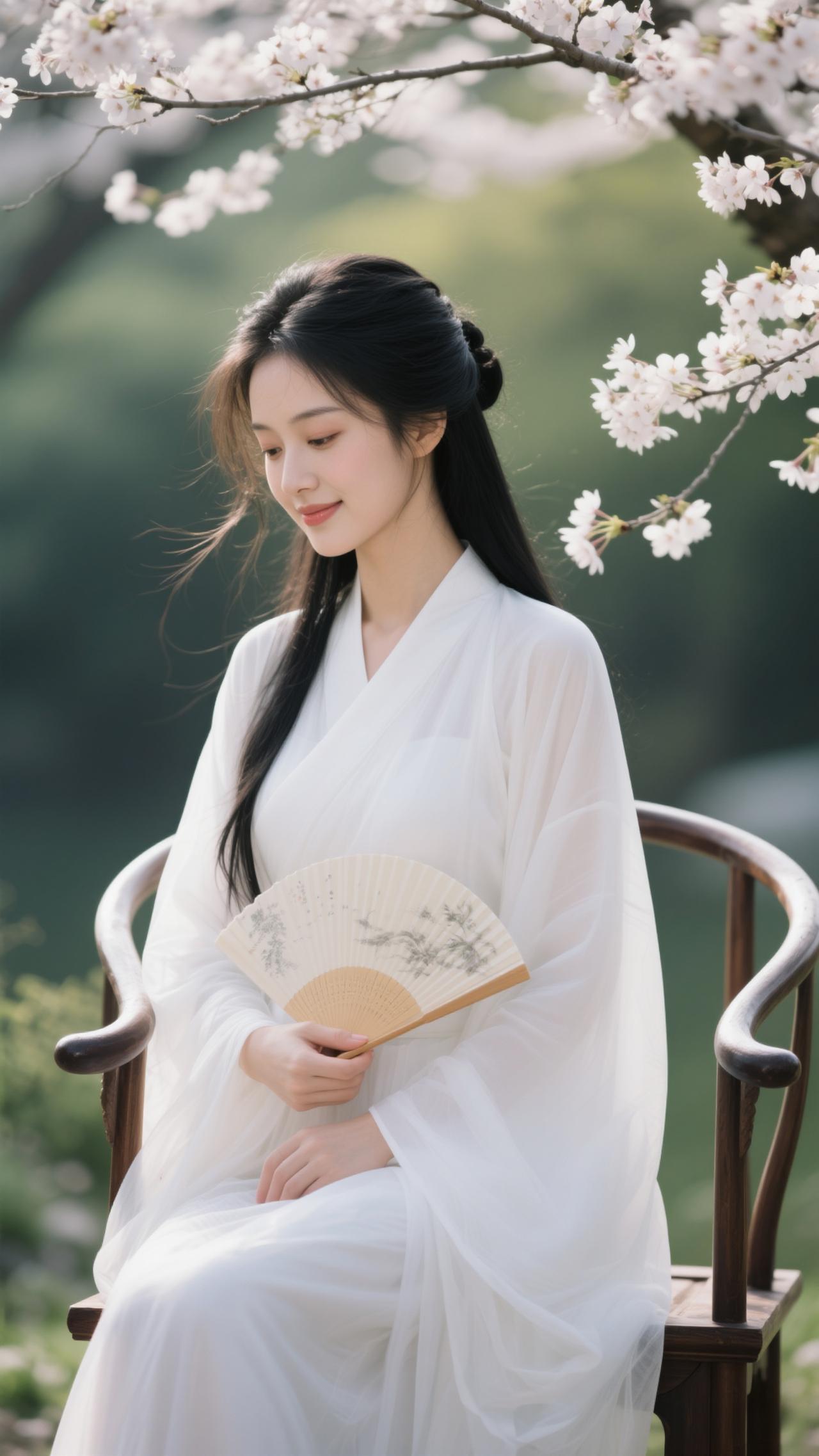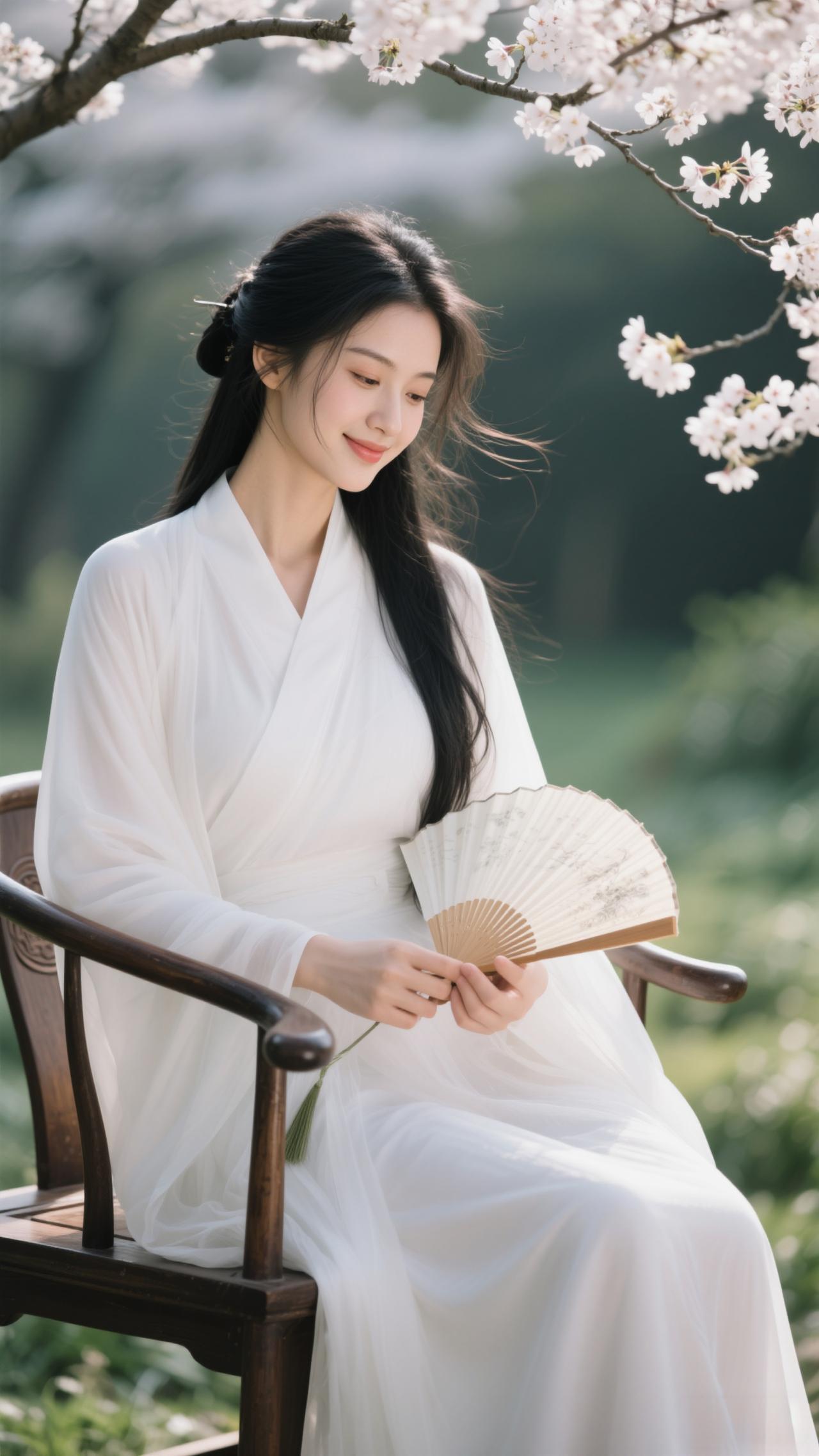 《眼儿媚·樱扇》 樱云垂处柳风柔,白袂惹香浮。 扇开轻素,鬓簪晴色,笑入春流。 闲凭竹椅听花坠,软絮落肩头。 半襟云气,一怀晴暖,都作清愁。