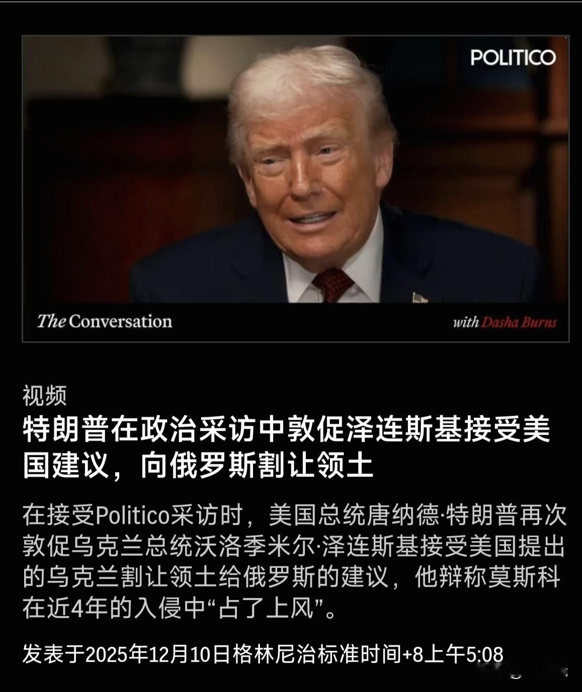 特朗普在今日政治采访中再次敦促泽连斯基接受美国建议,向俄罗斯割让领土 特朗普说,俄军在冲突中“占上峰”,乌克兰拖下去会失去更多领土,要“及时止损”——通过压服乌方割让领土(承认俄控克里米亚、乌东四州),快速达成停火,避免乌方“损失更大”。 他认为俄军比乌军强大许多,施压泽连斯基比施压普京更容易成功。如果停火协议达成,便解除对俄制裁,让美国企业抢先重返俄罗斯能源、稀土等项目(如埃里克森美孚,“萨哈林1号”天然气项目),排除欧洲竞争对手;特朗普规划要求乌克兰重建资金(含俄冻结资产)的50%收益归美国企业,同时推动美俄合作项目,让资本集团从中攫利。