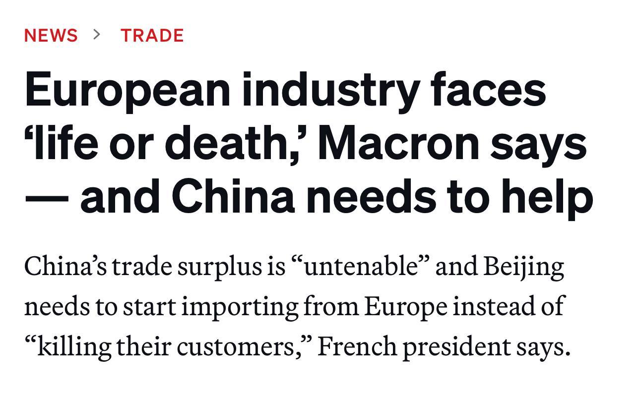 据Politico报道,法国总统马克龙表示,欧洲工业正面临“生死攸关”的时刻,并称中国巨额贸易顺差“难以为继”。 他指责北京过度向欧洲供应产品,而进口量却严重不足,从而损害了自身客户的利益。他警告说,除非中国企业加大对欧洲的投资,否则欧盟可能会采取加征关税的措施。问题是,有安世前车之鉴,如何去投资?海外新鲜事热点现场全网热点共创计划