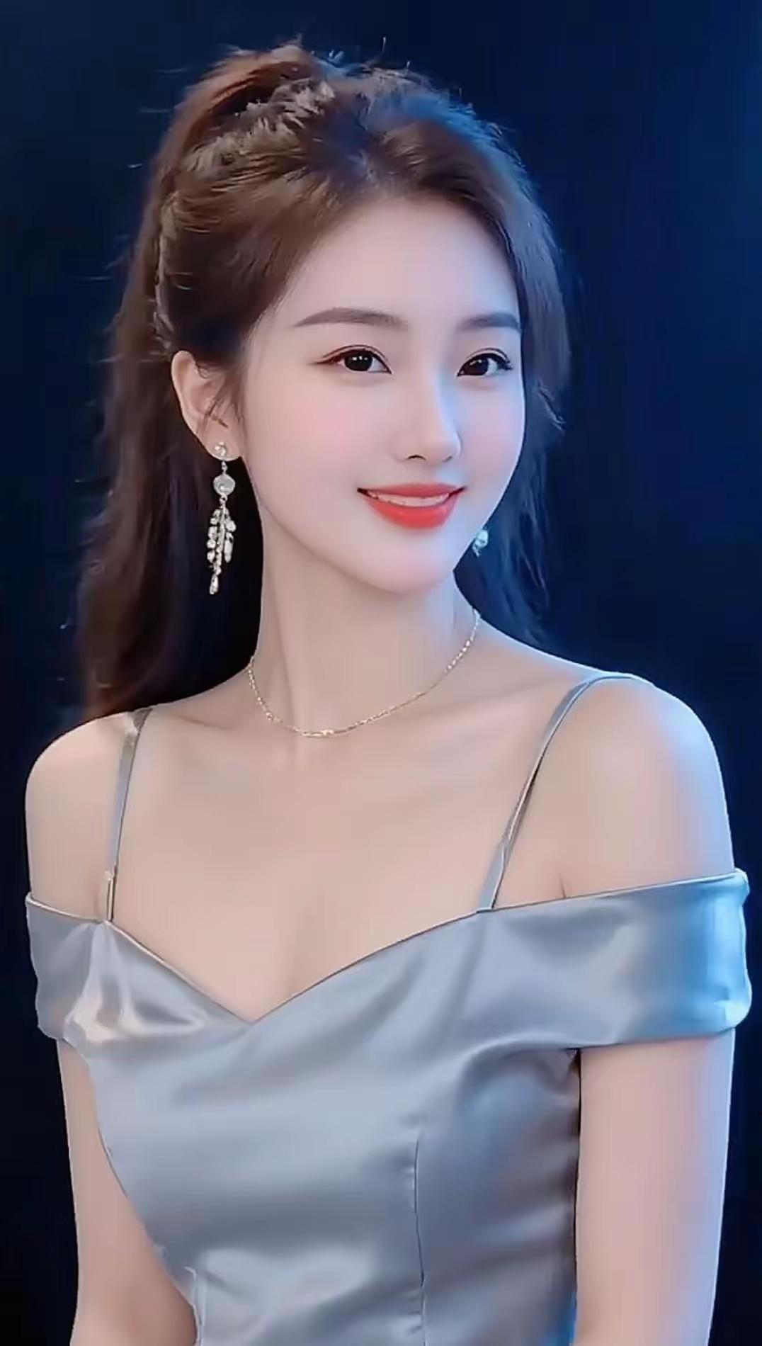 优雅气质,浅蓝色丝质露肩裙,搭配珍珠项链和流苏耳环,尽显女性魅力。