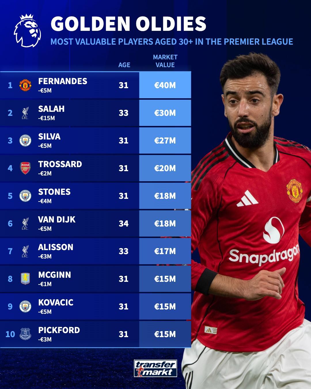 虎扑12月10日讯德转更新了英超球员最新身价,并盘点联赛中30岁以上球员身价榜。