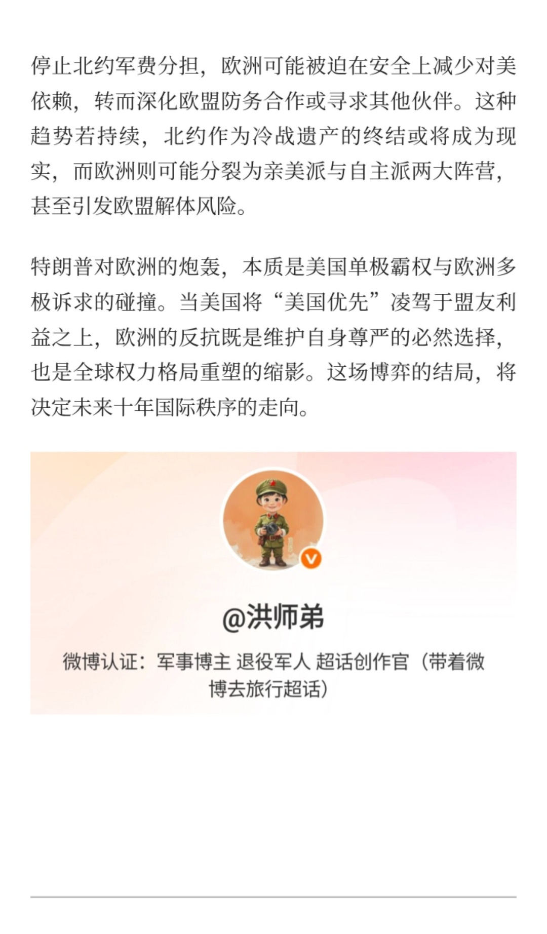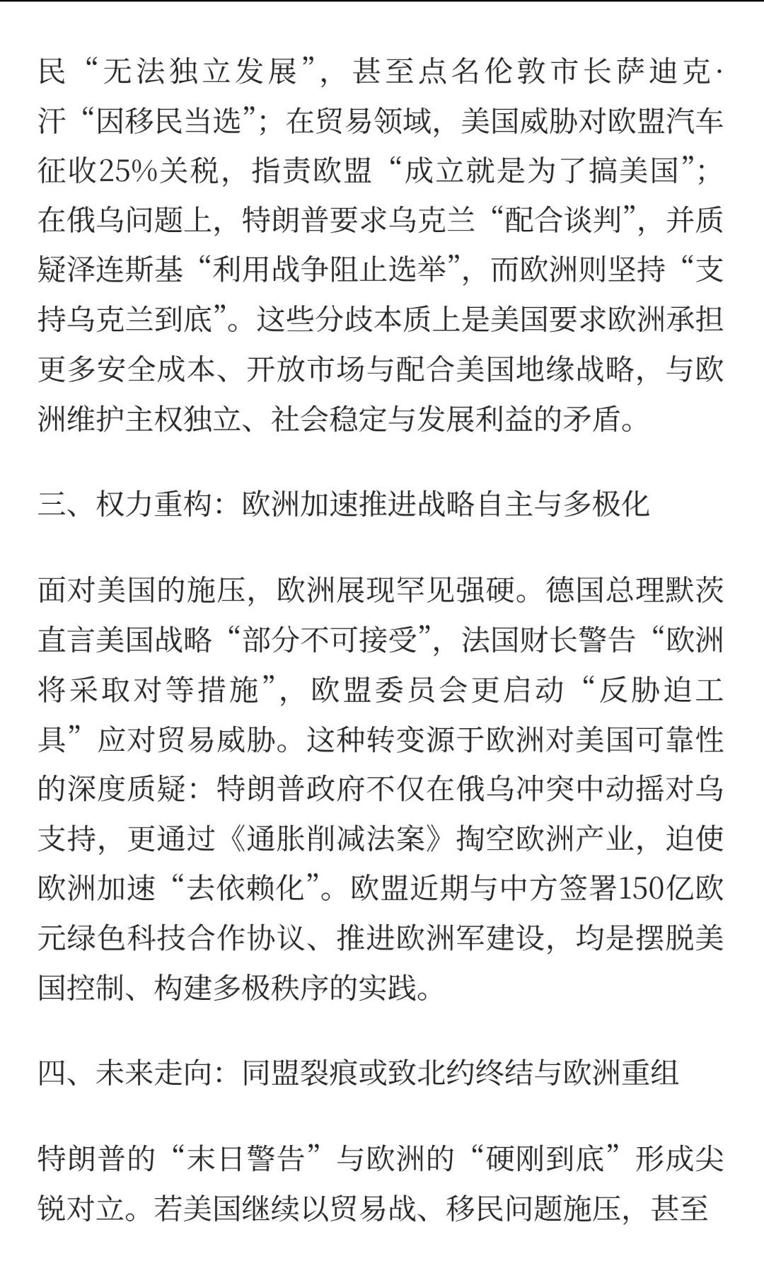 | 2025年12月,美国总统特朗普连续多日对欧洲发起猛烈抨击,称欧洲“正在衰落”、领导人“软弱无能”,甚至将矛头指向具体国家与政要。这场舆论风暴并非孤立事件,而是美欧同盟关系加速裂解的集中爆发。特朗普政府发布的国家安全战略报告仅用两页半篇幅提及欧洲,直言“20年后欧洲将失去强大经济与军队”,并指责其移民政策导致“文明灭绝”。这种表述与美国此前将欧洲视为“跨大西洋共同体支柱”的定位形成鲜明对比。更值得关注的是,美国将欧洲与俄罗斯、中国并列,但措辞明显温和,甚至暗示俄罗斯“掌握俄乌冲突主动权”。这种战略定位的调整,暴露出美国试图将欧洲从全球战略核心圈层剥离,转而聚焦西半球与印太地区的意图。特朗普的批评直指欧洲三大痛点:移民政策失控、对美贸易顺差、俄乌冲突僵局。他声称伦敦等城市因移民“无法独立发展”,甚至点名伦敦市长萨迪克·汗“因移民当选”;在贸易领域,美国威胁对欧盟汽车征收25%关税,指责欧盟“成立就是为了搞美国”;在俄乌问题上,特朗普要求乌克兰“配合谈判”,并质疑泽连斯基“利用战争阻止选举”,而欧洲则坚持“支持乌克兰到底”。这些分歧本质上是美国要求欧洲承担更多安全成本、开放市场与配合美国地缘战略,与欧洲维护主权独立、社会稳定与发展利益的矛盾。面对美国的施压,欧洲展现罕见强硬。德国总理默茨直言美国战略“部分不可接受”,法国财长警告“欧洲将采取对等措施”,欧盟委员会更启动“反胁迫工具”应对贸易威胁。这种转变源于欧洲对美国可靠性的深度质疑:特朗普政府不仅在俄乌冲突中动摇对乌支持,更通过《通胀削减法案》掏空欧洲产业,迫使欧洲加速“去依赖化”。欧盟近期与中方签署150亿欧元绿色科技合作协议、推进欧洲军建设,均是摆脱美国控制、构建多极秩序的实践。特朗普的“末日警告”与欧洲的“硬刚到底”形成尖锐对立。若美国继续以贸易战、移民问题施压,甚至停止北约军费分担,欧洲可能被迫在安全上减少对美依赖,转而深化欧盟防务合作或寻求其他伙伴。这种趋势若持续,北约作为冷战遗产的终结或将成为现实,而欧洲则可能分裂为亲美派与自主派两大阵营,甚至引发欧盟解体风险。特朗普对欧洲的炮轰,本质是美国单极霸权与欧洲多极诉求的碰撞。当美国将“美国优先”凌驾于盟友利益之上,欧洲的反抗既是维护自身尊严的必然选择,也是全球权力格局重塑的缩影。这场博弈的结局,将决定未来十年国际秩序的走向。