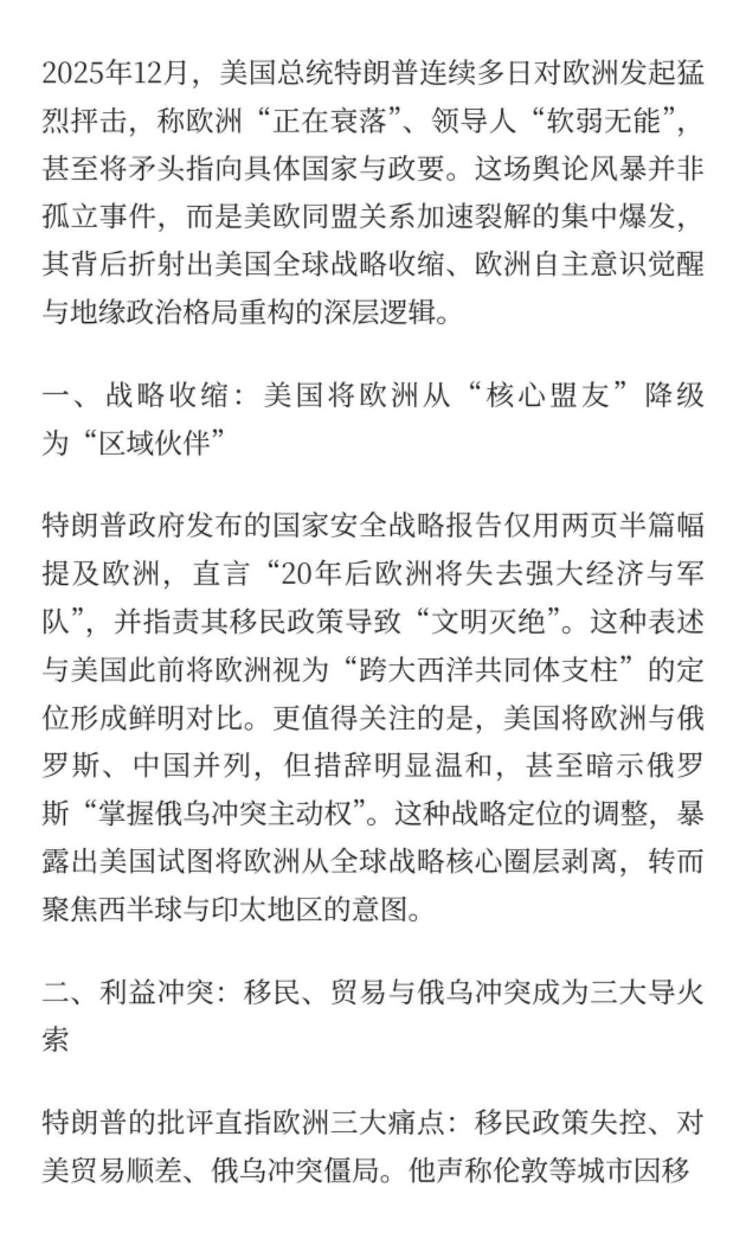 |2025年12月,美国总统特朗普连续多日对欧洲发起猛烈抨击,称欧洲“正在衰落