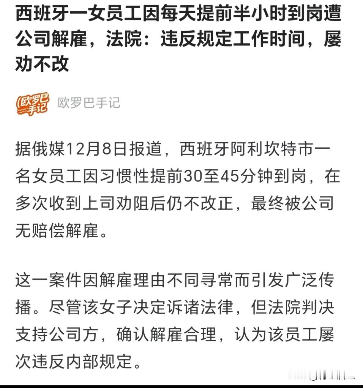 [笑哭]第一次见到上班太积极被开除的。 西班牙一22岁的女子在快递公司工作,每天正式上班时间是7点半,可她经常在6点45到7点之间到公司。主管多次提醒女子不要早到,但是她却仍然坚持每天天没亮就到办公室。最后她的领导失去耐心,以严重不当行为将女子解雇。 这姑娘简直是“天选打工人”啊。要是在咱们这,估计老板做梦都要笑醒,当模范员工来培养,开会都得点名表扬[捂脸]。牛马 天选打工人 社会新闻