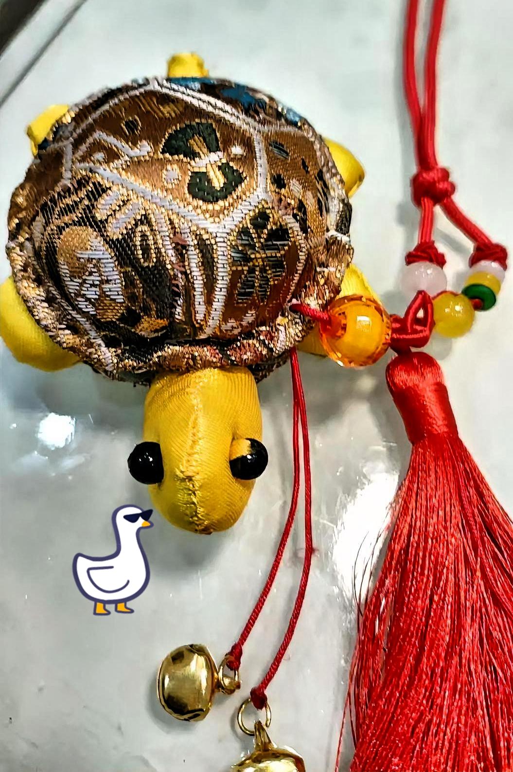 家人们快看这个布艺小乌龟挂饰,也太可爱了吧!龟壳是那种带花纹的织锦布料,棕金色的纹路看着特别精致,龟身是明黄色的布艺,小黑珠子做的眼睛圆溜溜的,呆萌得很。挂绳是大红色的,还串着黄的、红的、绿的珠子,下面坠着红色流苏,还有两个小金铃铛,一晃悠就叮铃铃响,特别讨喜。这小物件看着就讨彩头,乌龟寓意长寿吉祥,挂在家里或者车里都合适,摸起来软软的,做工也挺细致,摆哪儿都能添点喜庆劲儿,越看越喜欢! 欢迎大家点赞评论!