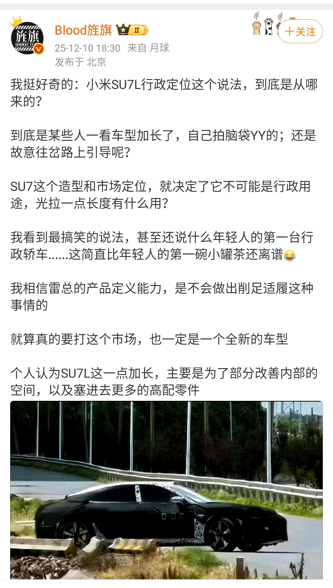 艹老师:我挺好奇的小米SU7L行政定位这个说法,到底是从哪来的? 小编也觉得按照小米汽车的逻辑,不会推出加长版的小米SU7,如果是更长版本的车型,一定是会被命名为更高级别的车型,针对不同用户推出不同的车型。 明年也是小米汽车的产品大年,有多款产品推出,明年春季的时候,大家可以看看小米的相关发布会,什么时候开发布会,这要取决于小米汽车工厂什么时候正式投产。 各位是怎么看的?欢迎评论区留言。