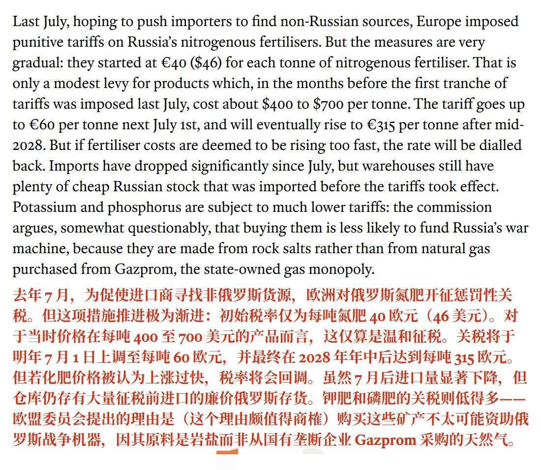 欧盟为了制裁俄罗斯,拒绝使用俄罗斯的天然气。这直接导致了一个后果:欧洲本土的化肥生产成本暴增。因为制造化肥,特别是氮肥,需要消耗大量天然气,能源成本能占到总成本的七成以上。 能源价格一飞冲天,欧洲许多化肥厂就撑不住了。超过五十家大型工厂不得不停产或减产,整个行业的产能损失了将近一半。自家生产的化肥变得非常昂贵,在市场上失去了竞争力。 那农业需要化肥怎么办?欧洲的选择是:进口。而进口的主要来源之一,恰恰就是俄罗斯。俄罗斯用自己便宜的天然气生产出化肥,再卖给欧洲。结果形成了一个讽刺的循环:欧洲放弃的俄罗斯天然气,被俄罗斯做成了化肥,又卖回了欧洲。 数据显示,欧洲从俄罗斯进口的氮肥量近年来大幅增长。光是今年六月,单月进口量就达到了一百万吨,创下了十年来的最高纪录。俄罗斯尿素占了欧洲进口总量的四成,成了难以替代的供应来源。 欧洲不是没想过找别的卖家。但从阿尔及利亚、摩洛哥等地进口的化肥,价格更高,加上运输成本,完全没有竞争力。欧盟内部对此也有分歧,一些内陆国家强烈反对能源禁令,认为这会极大推高民众的生活成本。 更让人头疼的是,欧盟为了限制俄罗斯,又打算对俄罗斯化肥加征关税。但这个措施很可能起反效果。因为化肥是农业的必需品,没有足够的替代来源,加税只会让进口成本更高。这部分增加的成本,最终会转嫁到农产品价格上,由农民和消费者买单。 事实上,欧洲农民已经计划在布鲁塞尔发起抗议了。他们感到自己被夹在中间:一边是能源政策导致的生产成本飙升,另一边是可能的关税带来的进口成本上涨。 从更广的视角看,这个困境暴露了欧洲能源转型和地缘战略中的结构性矛盾。切断俄罗斯天然气,并未真正解决对外依赖,只是把能源进口换成了化肥进口。俄罗斯通过出口化肥,某种程度上回收了能源收入,削弱了制裁的效果。而美国则成为能源禁令的赢家,欧洲转而高价购买美国的液化天然气。 同时,环保目标也受到了冲击。本土减产迫使欧洲接受碳足迹更高的俄罗斯化肥,这与碳中和的初衷相悖。一些能源密集型产业,比如化工,也面临外迁的风险。 说到底,这是一个在价值观与现实需求之间艰难权衡的案例。欧洲想通过制裁削弱俄罗斯,却不得不为保证自己的农业和民生而妥协。这个“自断能源、反哺对手”的循环,最终的成本,很大程度上是由欧洲自己的农业和消费者承担了。政策的效果,有时会以意想不到的方式反弹回来。