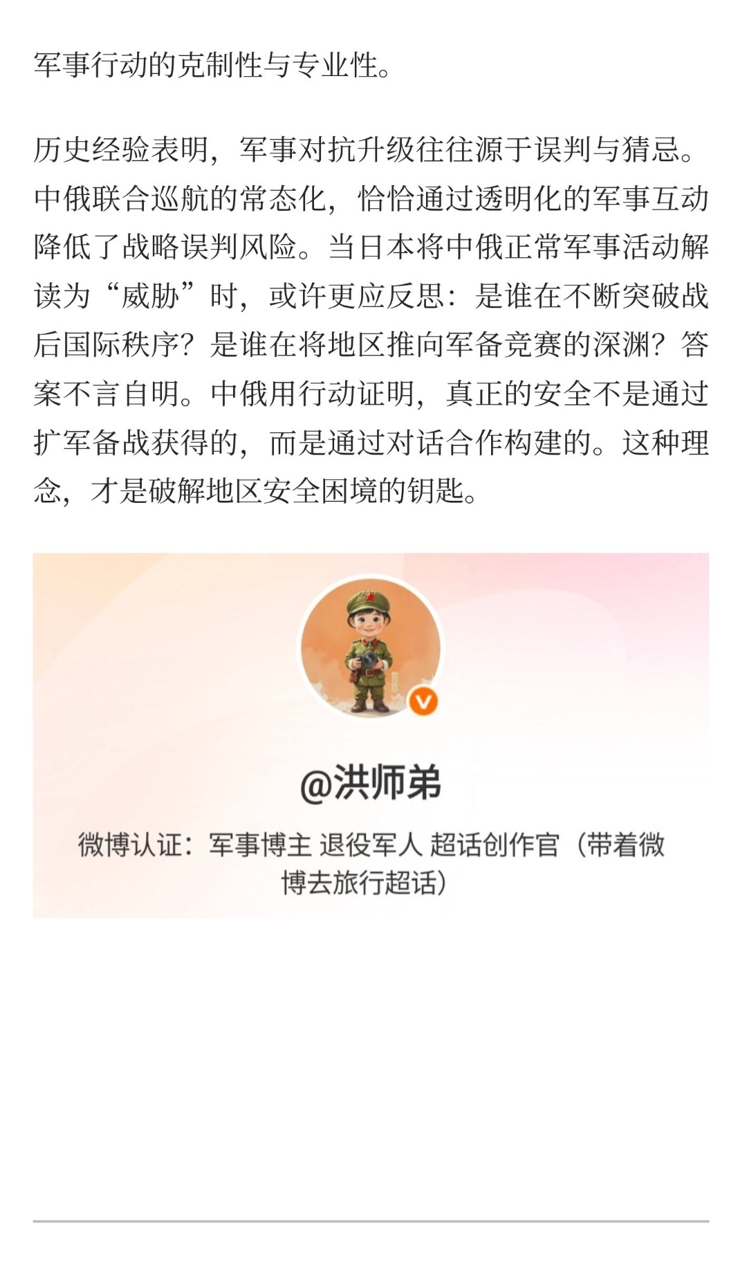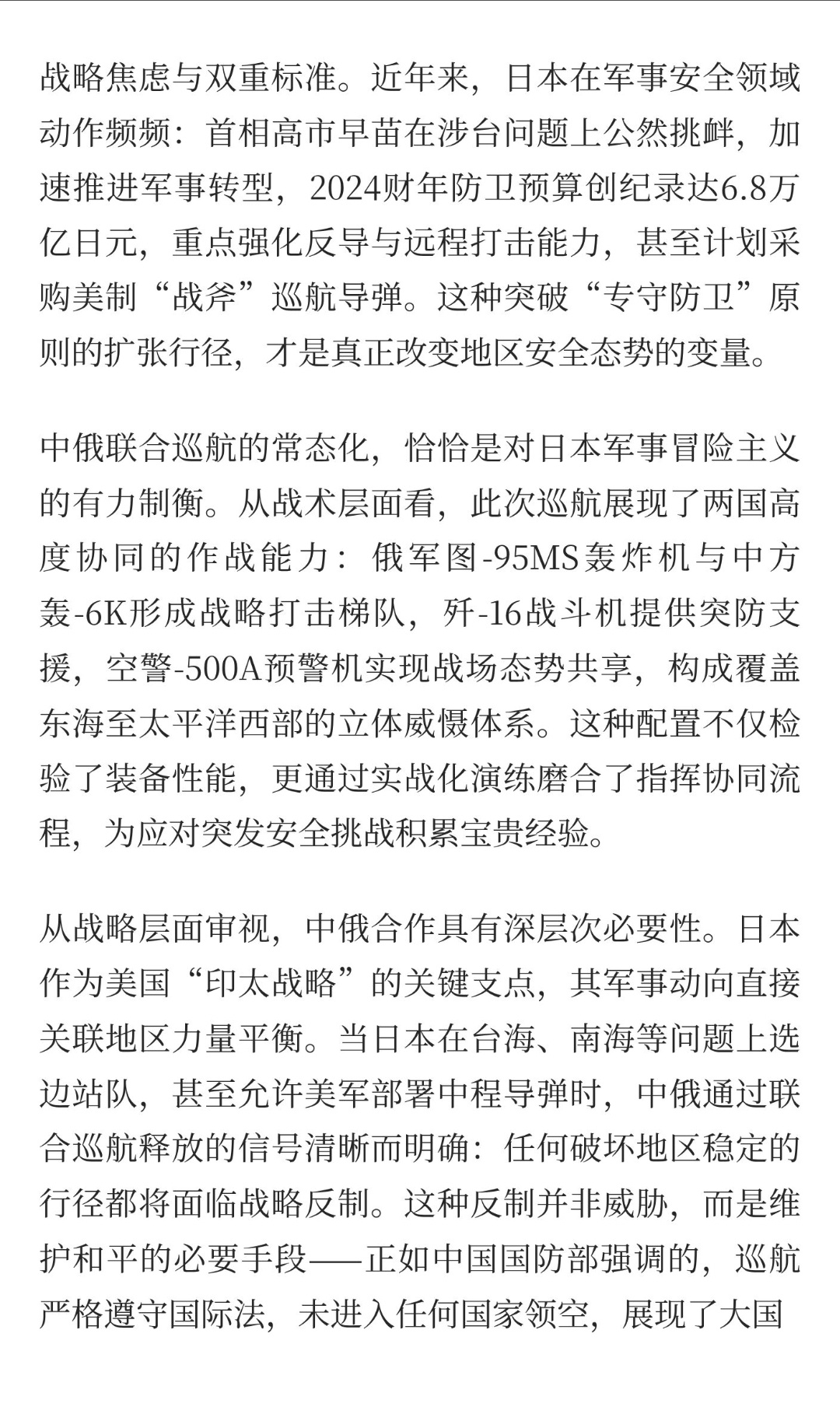 | 2025年12月9日,中俄两国空军组织实施第10次联合空中战略巡航,这一行动引发日本方面高度关注。从事件本质看,此次巡航是两国年度合作计划内的常规项目,核心目的在于检验远洋联合行动能力、提升联合作战水平,同时向地区传递维护和平稳定的明确信号。日本对此反应强烈,防卫大臣小泉进次郎在社交媒体宣称这是“针对日本的示威行动”,这种解读暴露了其战略焦虑与双重标准。近年来,日本在军事安全领域动作频频:首相高市早苗在涉台问题上公然挑衅,加速推进军事转型,2024财年防卫预算创纪录达6.8万亿日元,重点强化反导与远程打击能力,甚至计划采购美制“战斧”巡航导弹。这种突破“专守防卫”原则的扩张行径,才是真正改变地区安全态势的变量。中俄联合巡航的常态化,恰恰是对日本军事冒险主义的有力制衡。从战术层面看,此次巡航展现了两国高度协同的作战能力:俄军图-95MS轰炸机与中方轰-6K形成战略打击梯队,歼-16战斗机提供突防支援,空警-500A预警机实现战场态势共享,构成覆盖东海至太平洋西部的立体威慑体系。这种配置不仅检验了装备性能,更通过实战化演练磨合了指挥协同流程,为应对突发安全挑战积累宝贵经验。日本作为美国“印太战略”的关键支点,其军事动向直接关联地区力量平衡。当日本在台海、南海等问题上选边站队,甚至允许美军部署中程导弹时,中俄通过联合巡航释放的信号清晰而明确:任何破坏地区稳定的行径都将面临战略反制。这种反制并非威胁,而是维护和平的必要手段——正如中国国防部强调的,巡航严格遵守国际法,未进入任何国家领空,展现了大国军事行动的克制性与专业性。历史经验表明,军事对抗升级往往源于误判与猜忌。中俄联合巡航的常态化,恰恰通过透明化的军事互动降低了战略误判风险。当日本将中俄正常军事活动解读为“威胁”时,或许更应反思:是谁在不断突破战后国际秩序?是谁在将地区推向军备竞赛的深渊?答案不言自明。中俄用行动证明,真正的安全不是通过扩军备战获得的,而是通过对话合作构建的。这种理念,才是破解地区安全困境的钥匙。