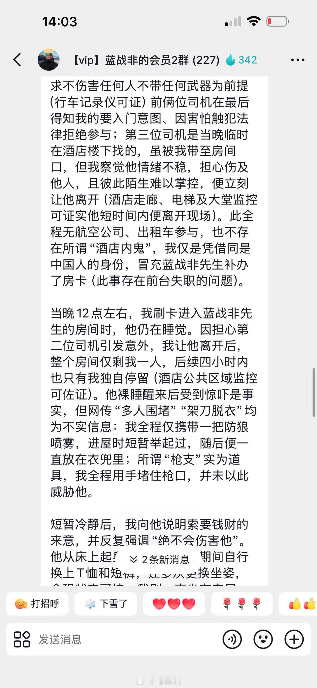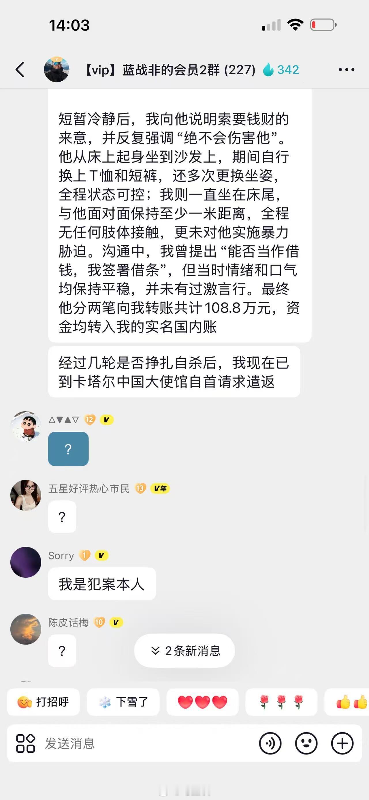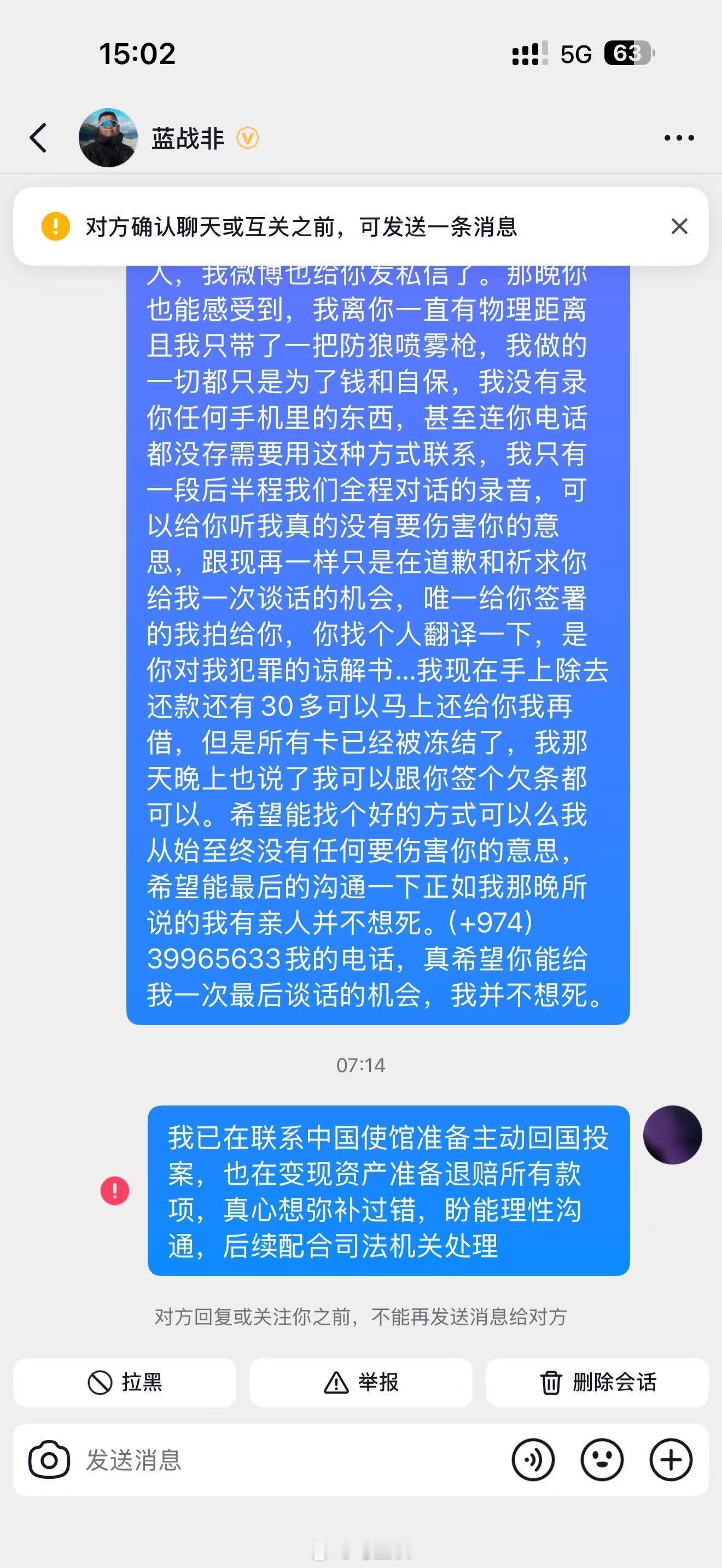 疑似劫持蓝战非的男子自首了?这是真的还是恶作剧?看他文字曝光的细节挺多,甚至还疑似有蓝战非签的协议和转账记录,这剧情发展太快了…我大使馆回应蓝战非被胁迫转账南非当地警方调查蓝战非案 蓝战非称被绑架热点现场