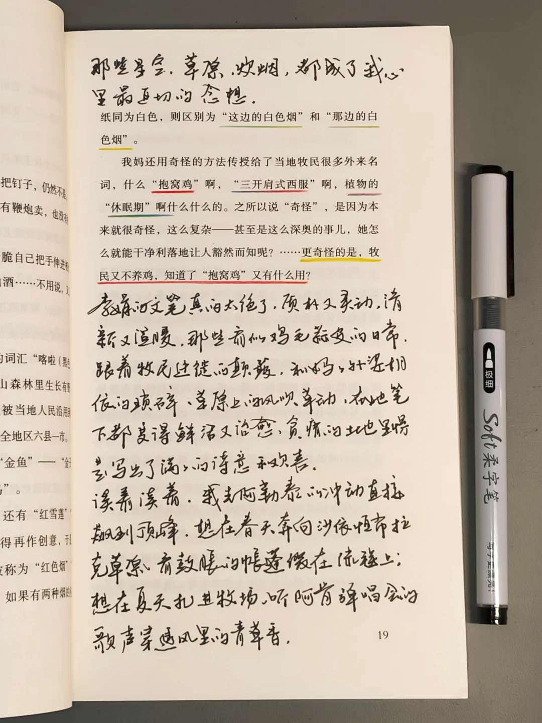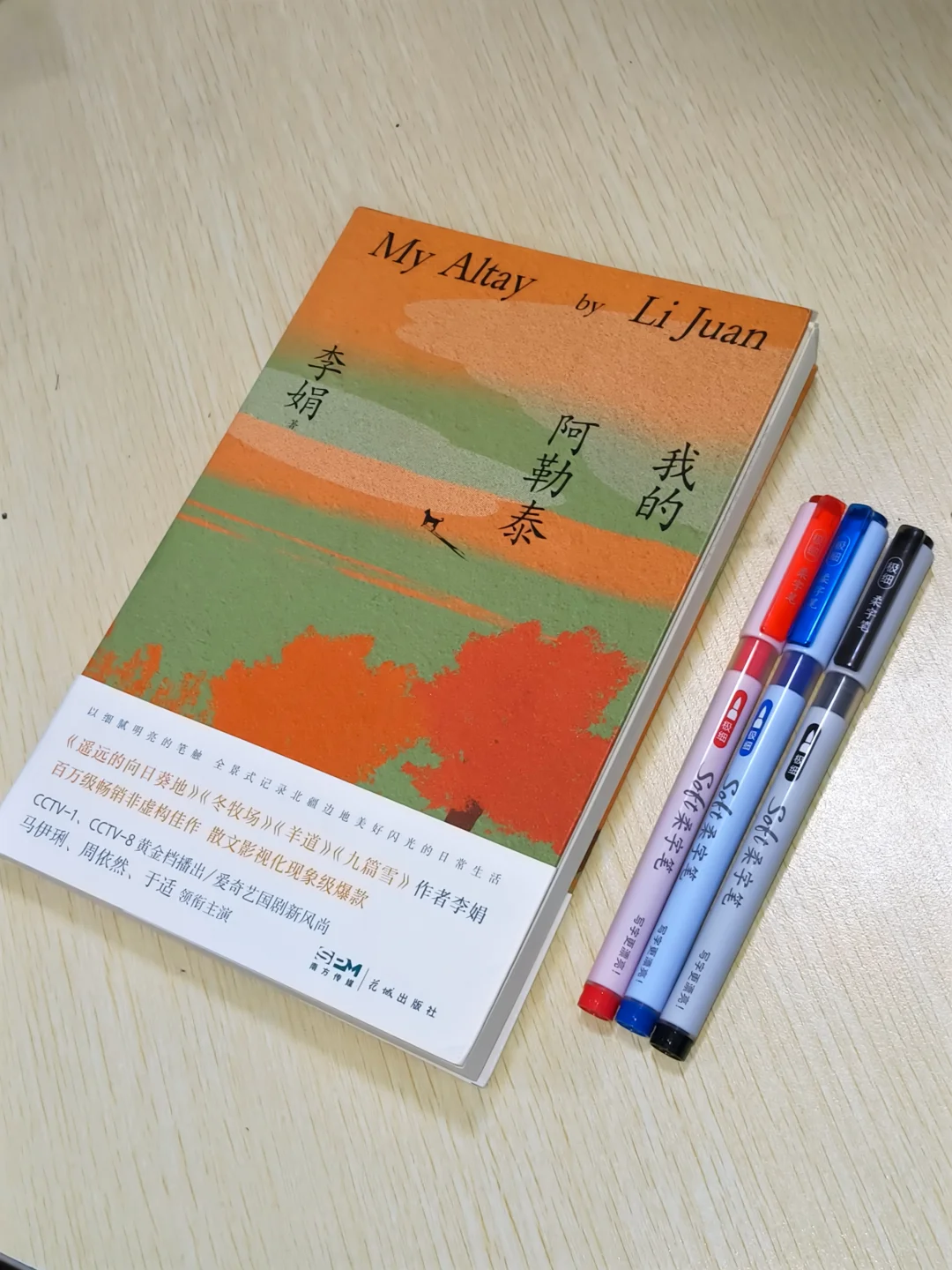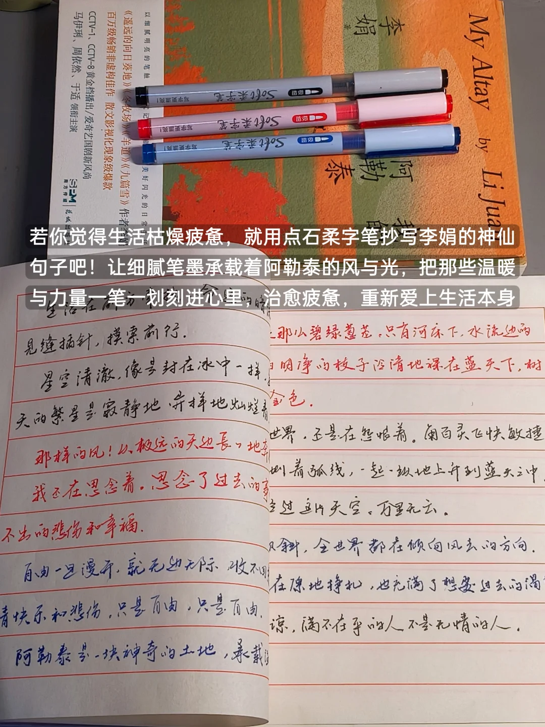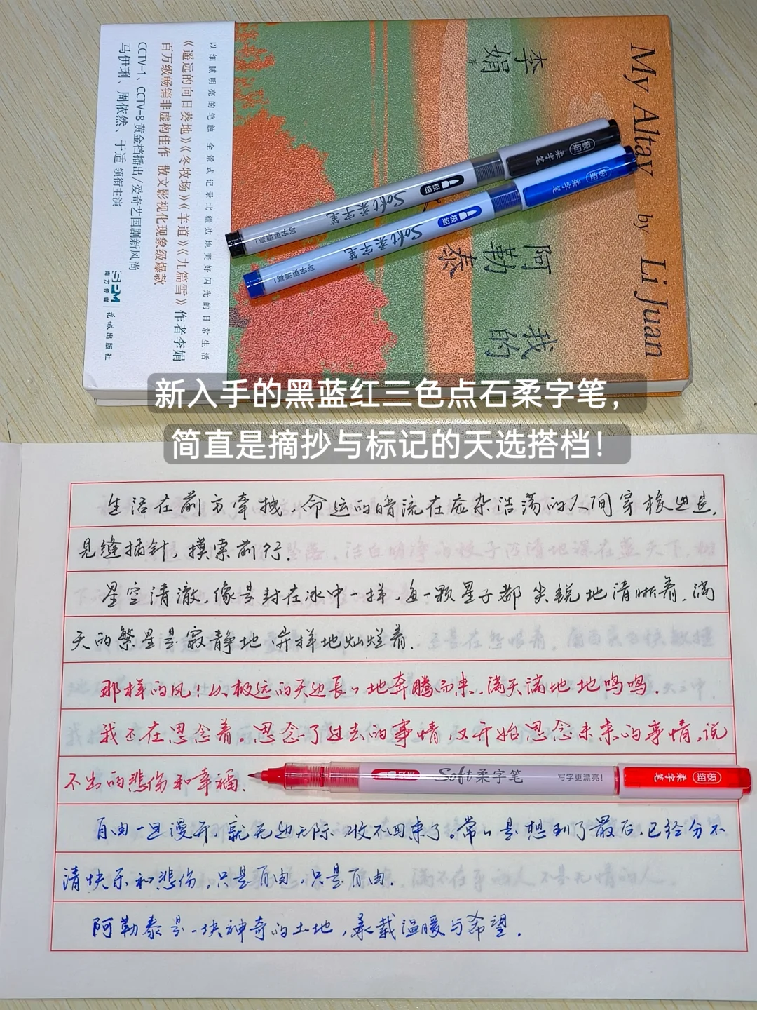 / 董宇辉说:“李娟的文字里有生命力,有对生活最本真的热爱,读她的书,仿佛能闻到草原的青草香,看到雪山的白月光”。 ㅤ 这话真的说到我心坎里了! 谁能不爱李娟啊😭, 这个把阿勒泰写活了的宝藏作家,就像阿勒泰草原上的一株格桑花🌼,她的文字我能循环读一百遍都不腻! - 之前读《羊道》系列就被狠狠圈粉,这次翻开《我的阿勒泰》,直接被治愈到原地起飞! ㅤ 她的文笔真的太绝了,质朴又灵动,清新又温暖,那些看似鸡毛蒜皮的日常,跟着牧民迁徙的颠簸、和妈妈外婆相依的琐碎、草原上的风吹草动,在她笔下都变得鲜活又治愈,贫瘠的土地里愣是写出了满满的诗意和欢喜😭! ㅤ 读着读着,我去阿勒泰的冲动直接飙到顶峰!! 想在春天奔向沙依恒布拉克草原,看鼓胀的帐篷缀在绿毯上; 想在夏天扎进牧场,听阿肯弹唱会的歌声穿透风里的青草香; 想在冬天踏上北疆白迢迢的雪路,看戈壁、森林、雪山连成一片纯净的白,和牧人、骏马一起定格成画…… 那些星空、草原、炊烟,都成了我心里最迫切的念想! / ✍️那些戳中我的神仙句子必须分享: 🌿“生活是一场漫长的迁徙,我们都在寻找属于自己的草原。” 🌿“外婆说,人活着,就是要多看看太阳,多晒晒月亮,心里就亮堂了。” 🌿“星空清澈得像倒过来的海,每一颗星子都在闪,仿佛在说,别怕,总有光亮在等你。” 🌿“痛苦会被风带走,疲惫会被阳光晒干,唯有对生活的热爱,会像草原上的花,一茬接一茬地开。” - 指尖翻过书页,目光掠过那些被标记的心动句子,忽然觉得读书的幸福,就藏在这些细碎的仪式感里~ 新入手的黑蓝红三色点石柔字笔,简直是摘抄与标记的天选搭档! ㅤ 直液式软头设计太懂书写需求,下墨顺滑不卡顿,大容量又耐用。最惊喜的是落笔自带自然笔锋,原本平平无奇的字迹,瞬间变得灵动有质感,连自己回看摘抄本都忍不住心动~ - 如果你觉得生活枯燥又疲惫,就用点石柔字笔抄写李娟的神仙句子吧!让细腻笔墨承载着阿勒泰的风与光,把那些温暖与力量一笔一划刻进心里,治愈疲惫,重新爱上生活本身。 ㅤ