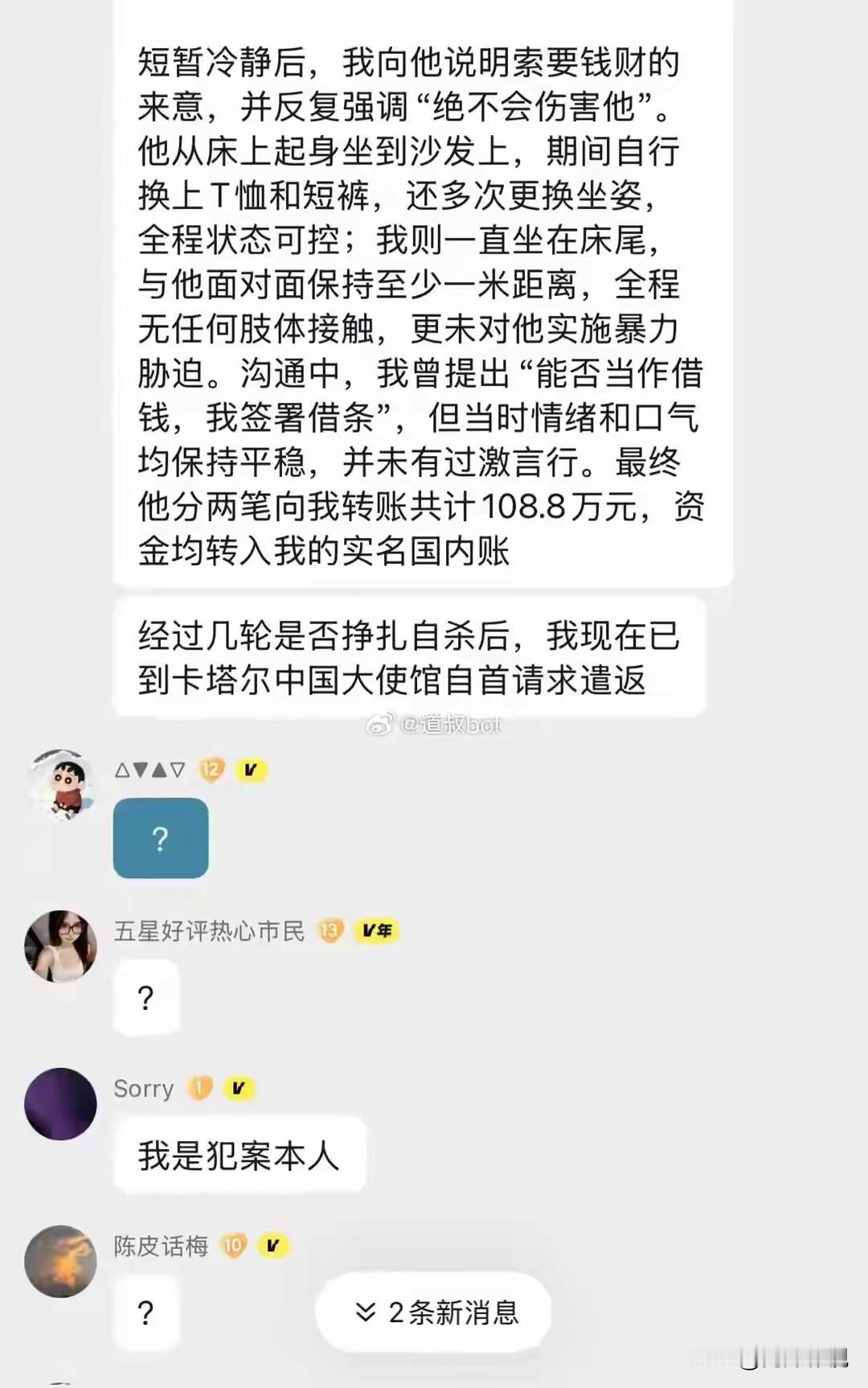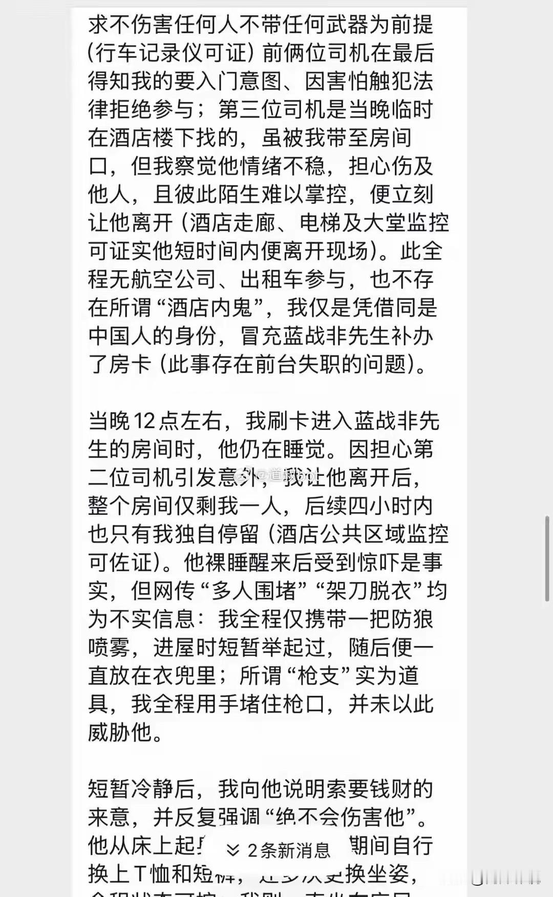 那个抢劫了蓝战非的人主动在网上自首了。自称作案者在网上发声,没想到,他的描述与蓝战非此前的说法出现了多个关键矛盾点。 根据其自述: 1. 动机与策划:自称因炒股和消费负债,提前三天到开普敦踩点,本想找当地黑车司机合伙但未果。 2. 作案手段:声称独自一人,通过冒充蓝战非在酒店前台补办房卡进入房间,只带了防狼喷雾,未持刀,全程没有肢体接触,只是“恳求”对方给钱应急。 3. 金额与过程:承认最终收到两笔转账,合计108.8万元。并称拿到钱后曾向蓝战非下跪磕头道歉,试图将其行为描述为“向网红讨钱脱困”。 4. 事后态度:看到事件发酵后,曾私信蓝战非希望退钱私了,未获回应后,声称已准备向中国驻卡塔尔大使馆自首。 两边表述的现场版本有较大偏差,蓝战非说自己醒来刀架脖子上,自首哥说自己没带刀。蓝战非说有2个黑人,自首哥说就自己一个人进去的。蓝战非说被挟持,自首哥说全程没身体接触。蓝战非说对方要300万,自己转账加撸网贷,自首哥说108.8万。 至于要精液这事有,不过蓝战非说侮辱人,拒绝了。最逗的是自首哥说拿到钱后跪下来给蓝战非磕过一个,中间一直在表达歉意,他可能觉得自己的行为是找网红讨一笔钱脱困,搞笑吧? 对此事,您有什么看法呢?欢迎交流!