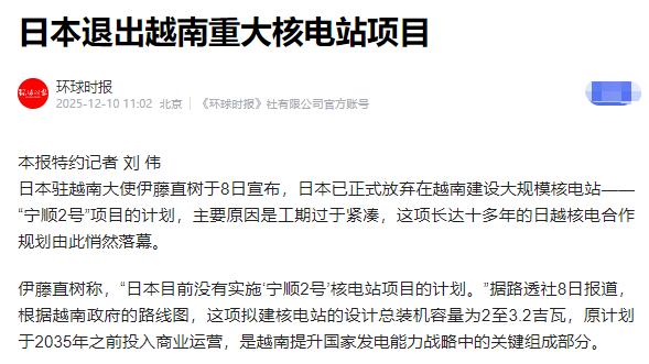 日本退出越南重大核电站项目   日本驻越南大使伊藤直树于8日宣布,日本已正式放弃在越南建设大规模核电站——“宁顺2号”项目的计划,主要原因是工期过于紧凑,这项长达十多年的日越核电合作规划由此悄然落幕。   这事得从2009年说起,当时越南雄心勃勃规划在宁顺省建两座核电站,1号找俄罗斯,2号拉日本,总装机超4000兆瓦,计划2020年代投产。   谁也没想到,2016年越南突然以安全和预算为由暂停项目——原本100亿美元的预算,生生涨到270亿,相当于越南当年GDP的3%。   这一停就是七年,直到2024年越南电力短缺加剧,三星、富士康等工厂因停电损失惨重,才又想起重启核电。   河内的算盘打得响:2035年要让两座核电站并网,解决每年8%的用电增长。但日本接手时发现,这时间表根本不现实。   首先是技术断档。2016年项目暂停后,越南核电监管机构解散,上千名技术人员转行,连核安全法规都停留在2015年版本。日本东芝、日立等企业去考察发现,宁顺厂址的地质勘探数据还停留在2010年,连海水腐蚀测试都没更新。   更要命的是,日本自2011年福岛事故后,国内核电人才流失近半,剩下的主力都在处理核污水和重建福岛,根本抽不出团队搞海外大项目。2025年2月日本官员访越时交底:最快2036年才能动工,建成起码2040年——比越南要求的2035年晚了整整五年。   工期矛盾的背后,是两国对核电的认知错位。越南把核电当“救命稻草”,2024年全国缺电12%,河内街头电动车都要限充,恨不得明天就合闸发电。但日本明白,核电站不是搭积木。   以韩国在阿联酋的阿布扎比核电站为例,从签约到投产用了12年,越南却要求日本在10年内完成从设计到运营的全流程——而日本自福岛后,国内新建核电站审批都要5年起步。   更别说越南的基建底子:2024年宁顺省连500千伏输电线路都没建好,混凝土搅拌站还是临时搭的,这种条件下强行赶工,安全隐患堪比定时炸弹。   还有成本的无底洞。2016年越南暂停项目时,日本企业已经垫了15亿日元的前期费用,如今重启意味着要重新做环境评估、重新培训越南工人。   越南专家算过账,按2025年物价,宁顺2号单台机组造价可能突破180亿美元,远超越南财政部每年30亿美元的基建预算。   日本商社私下嘀咕,越南连电费都不敢涨——居民电价十年没变,工业用电补贴占财政支出2%,这种商业模式下,核电站建成后能不能收回成本都是未知数。   更深层的矛盾藏在历史恩怨里。2016年越南暂停项目时,日本吃了哑巴亏:当时东芝刚收购美国西屋电气,正想借越南项目打开东南亚市场,结果越南一句“安全担忧”就让百亿投资打水漂。   福岛事故后,日本核电企业本就背着“不安全”的骂名,越南民众的反核游行更是火上浇油——2024年宁顺省民调显示,63%的居民反对建核电站,理由是“不想变成第二个福岛”。这种舆论压力下,日本企业根本不敢冒险加速施工。   现在回头看,日本退出是止损的明智选择。越南不是没给缓冲期,2025年9月河内甚至松口说“可以接受2036年投产”,但日本算的是细账:就算现在动工,光培养越南本地焊工就得三年——核电管道焊接需ISO认证,越南目前只有37人持证。   更别说设备运输,宁顺港连100吨的吊车都没有,反应堆压力容器运进来得临时修码头。这些细节堆起来,工期只会越拖越长,最终变成第二个印度库丹库拉姆核电站(俄罗斯帮建,工期超14年)。   最讽刺的是,日本退出后,越南不得不面对更现实的困境:俄罗斯至今没表态接盘,法国、韩国虽然感兴趣,但开出的条件更苛刻——法国要捆绑可再生能源项目,韩国要求控股51%。而越南自己,连核电监管机构都没重建,2025年11月国会才通过新的《原子能法》,比原计划晚了三年。   这场持续十五年的核电博弈,最终暴露的是发展中国家追赶能源需求时的残酷现实:电力缺口不会等你准备好,而核电这种超级工程,差一天准备就是差一个时代的安全。