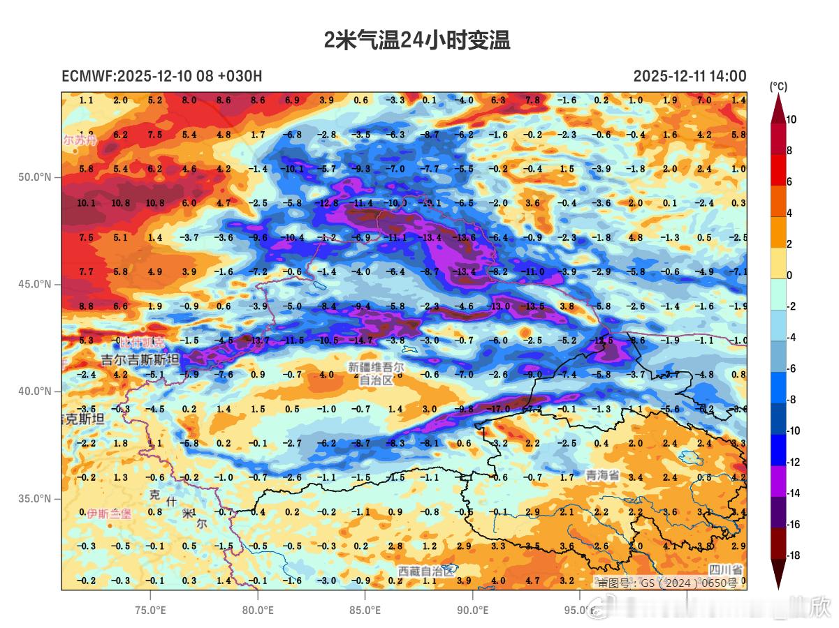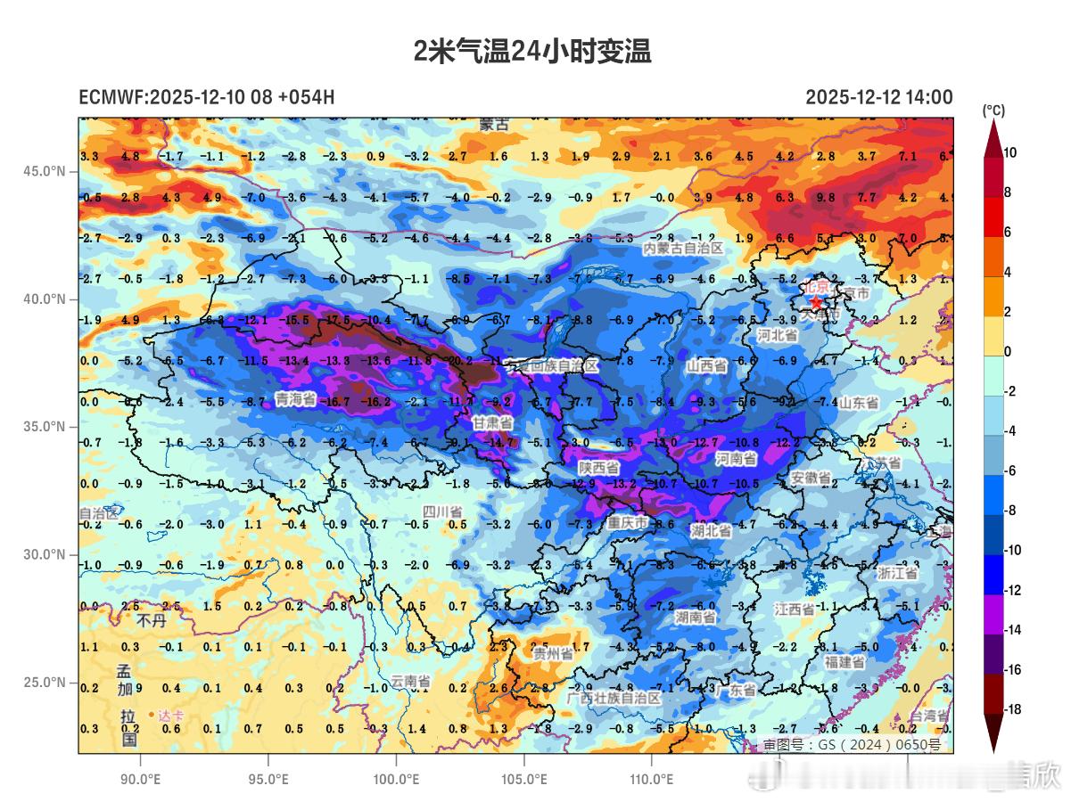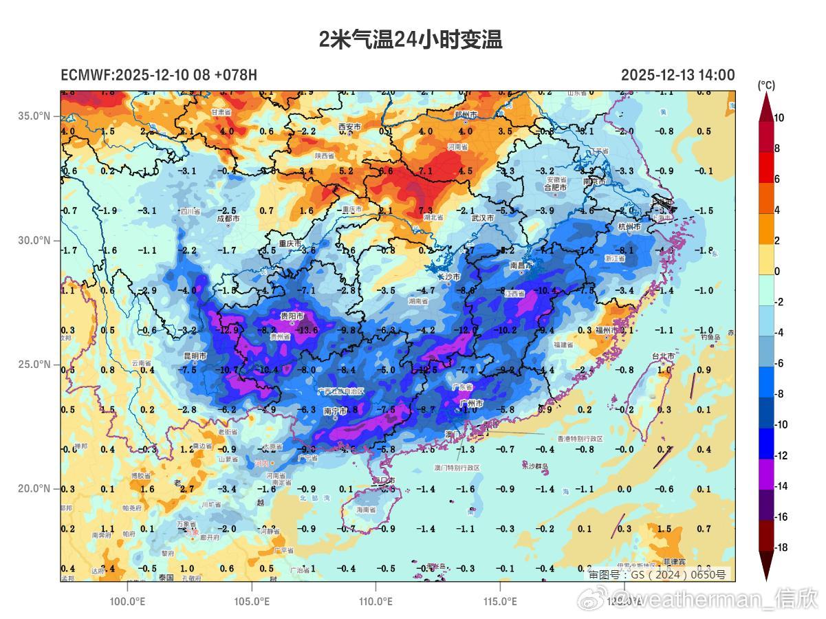 【寒潮来袭】受寒潮影响,预计12月10日夜间至13日,我国大部地区将自西向东出现大风降温,日平均或最低气温普遍下降6~10℃,新疆北部、吉林东部局地降温超14℃。12月14日早晨,最低温度0℃线将南压至浙江南部、江西北部、湖北南部一带。如果对比14时的变温,冷空气导致的降温可能会更强。因为这次降温伴随雨雪,光照因素的差异会使得白天或者说最高气温的下降幅度会大于平均气温或最低气温。明天寒潮主体重点影响新疆和甘肃西部,部分地区可能见到12℃以上的降温。另外,明天在辽宁东部和吉林东部,降温可能超14℃。这一带是因为从寒潮主体里有部分冷空气先快速东移到贝加尔湖后,直接南下,导致明天形成一东一西两片明显降温区。后天东北的冷空气南下并向西回流,和西边的寒潮主体合并。后天在甘肃大部、青海北部、宁夏、陕西、山西、河南、湖北北部等地可能出现10-18℃降温。13日白天寒潮继续南下,江南华南以及贵州和云南西部多地也将出现明显降温。不过这次寒潮降温迅猛,离开后的升温也明显,很多城市气温呈现V型走势。比如济南今天最高15℃、13日0℃、15日9℃。郑州今天最高17℃、13日4℃、15日11℃。武汉明天最高21℃、13日11℃、16日18℃。南京今天最高18℃、14日最高8℃、16日最高18℃。上海今天最高19℃、14日8℃、16日18℃。长沙明天最高22℃、13日最高11℃、16日最高20℃。因此这轮寒潮可能使得华北到长江中下游多地气温创出立冬后新低,但冷的时间不会很长,随后很多城市气温又会回到正常甚至再次转为偏高。