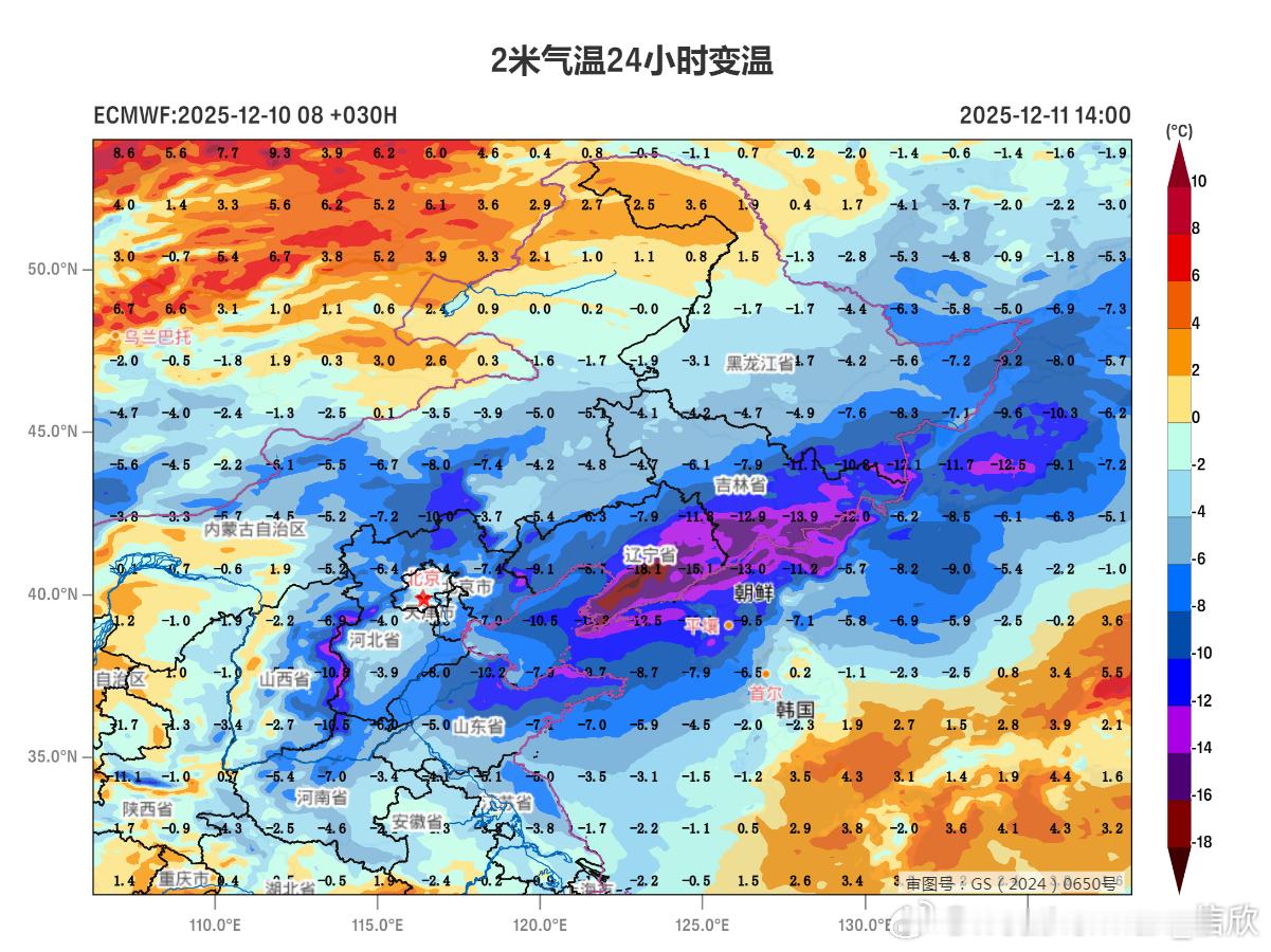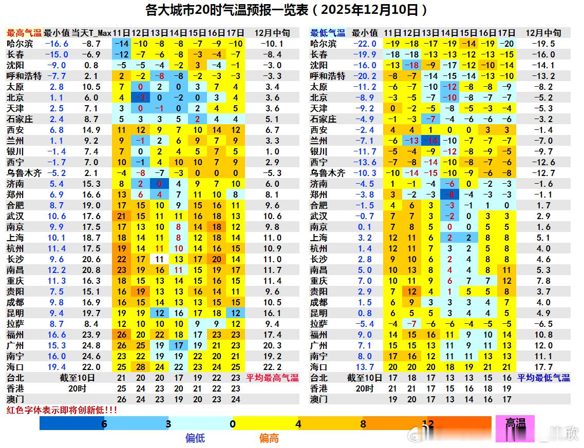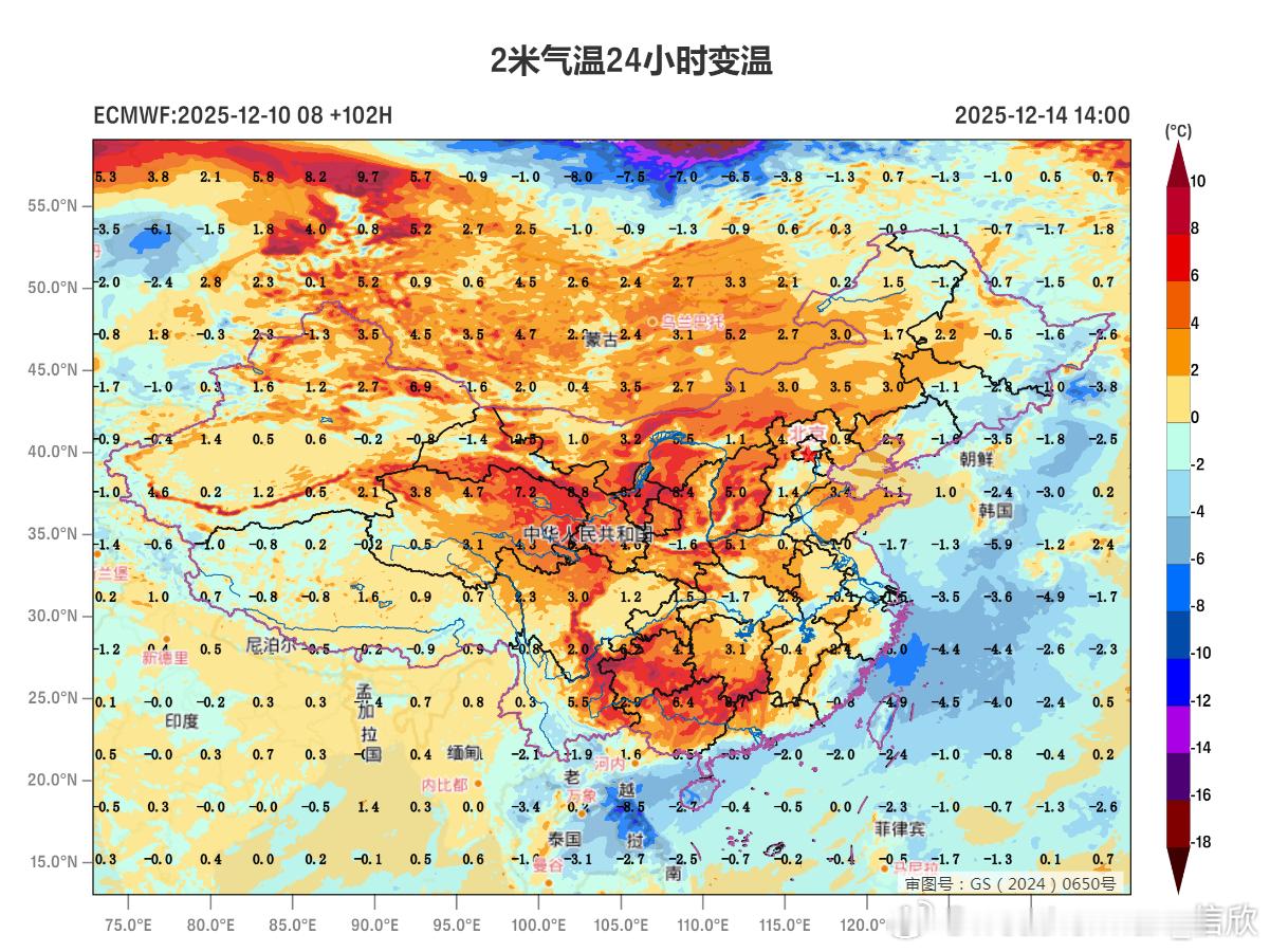 【寒潮来袭】受寒潮影响,预计12月10日夜间至13日,我国大部地区将自西向东出现大风降温,日平均或最低气温普遍下降6~10℃,新疆北部、吉林东部局地降温超14℃。12月14日早晨,最低温度0℃线将南压至浙江南部、江西北部、湖北南部一带。如果对比14时的变温,冷空气导致的降温可能会更强。因为这次降温伴随雨雪,光照因素的差异会使得白天或者说最高气温的下降幅度会大于平均气温或最低气温。明天寒潮主体重点影响新疆和甘肃西部,部分地区可能见到12℃以上的降温。另外,明天在辽宁东部和吉林东部,降温可能超14℃。这一带是因为从寒潮主体里有部分冷空气先快速东移到贝加尔湖后,直接南下,导致明天形成一东一西两片明显降温区。后天东北的冷空气南下并向西回流,和西边的寒潮主体合并。后天在甘肃大部、青海北部、宁夏、陕西、山西、河南、湖北北部等地可能出现10-18℃降温。13日白天寒潮继续南下,江南华南以及贵州和云南西部多地也将出现明显降温。不过这次寒潮降温迅猛,离开后的升温也明显,很多城市气温呈现V型走势。比如济南今天最高15℃、13日0℃、15日9℃。郑州今天最高17℃、13日4℃、15日11℃。武汉明天最高21℃、13日11℃、16日18℃。南京今天最高18℃、14日最高8℃、16日最高18℃。上海今天最高19℃、14日8℃、16日18℃。长沙明天最高22℃、13日最高11℃、16日最高20℃。因此这轮寒潮可能使得华北到长江中下游多地气温创出立冬后新低,但冷的时间不会很长,随后很多城市气温又会回到正常甚至再次转为偏高。