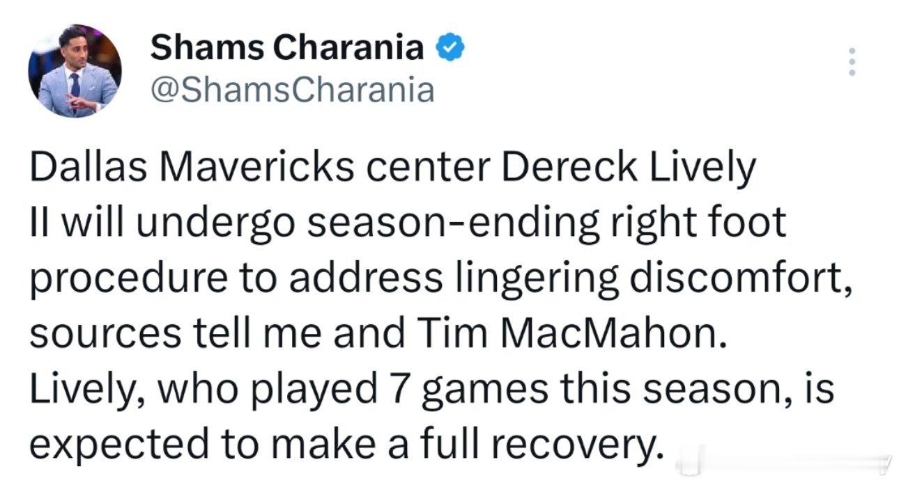 Shams:莱夫利将接受右脚手术,赛季报销。本赛季,莱夫利仅出战7场比赛。