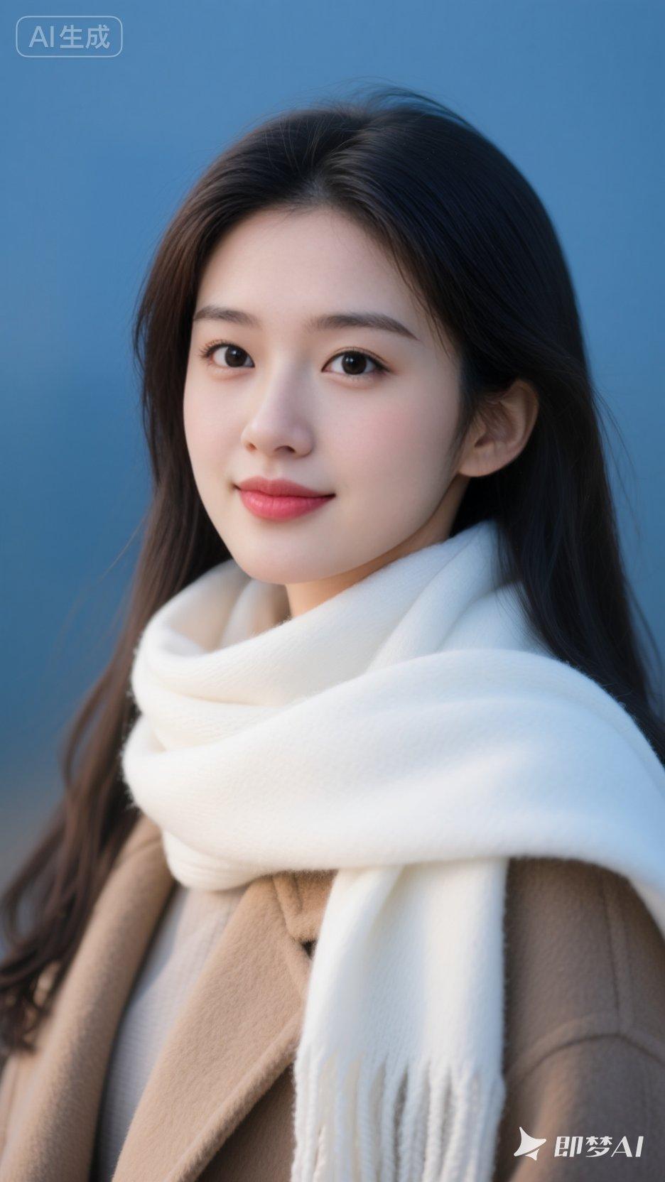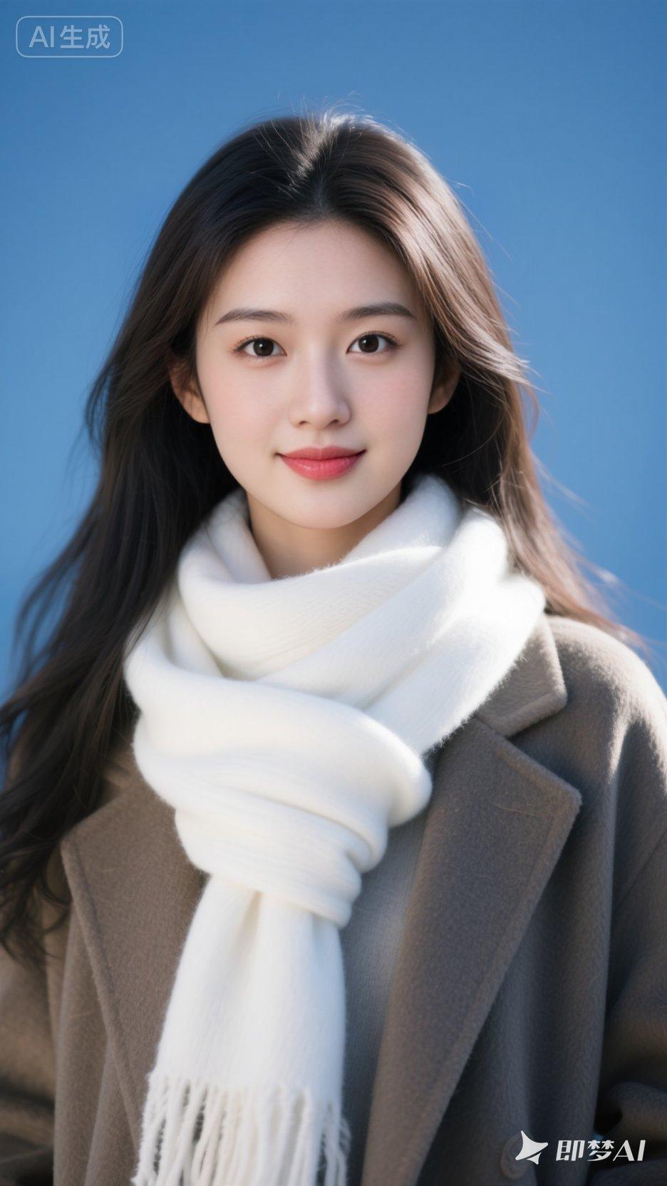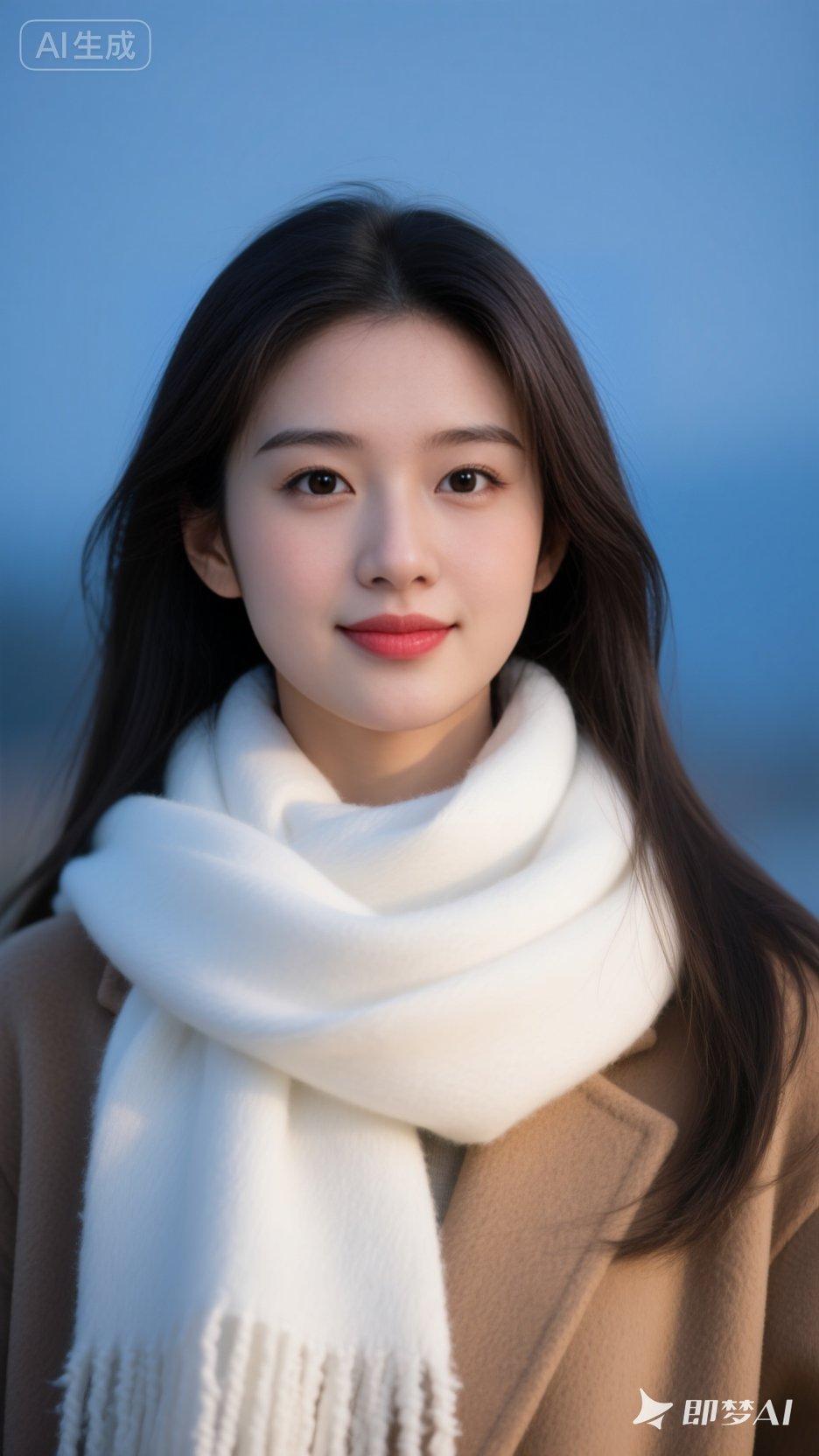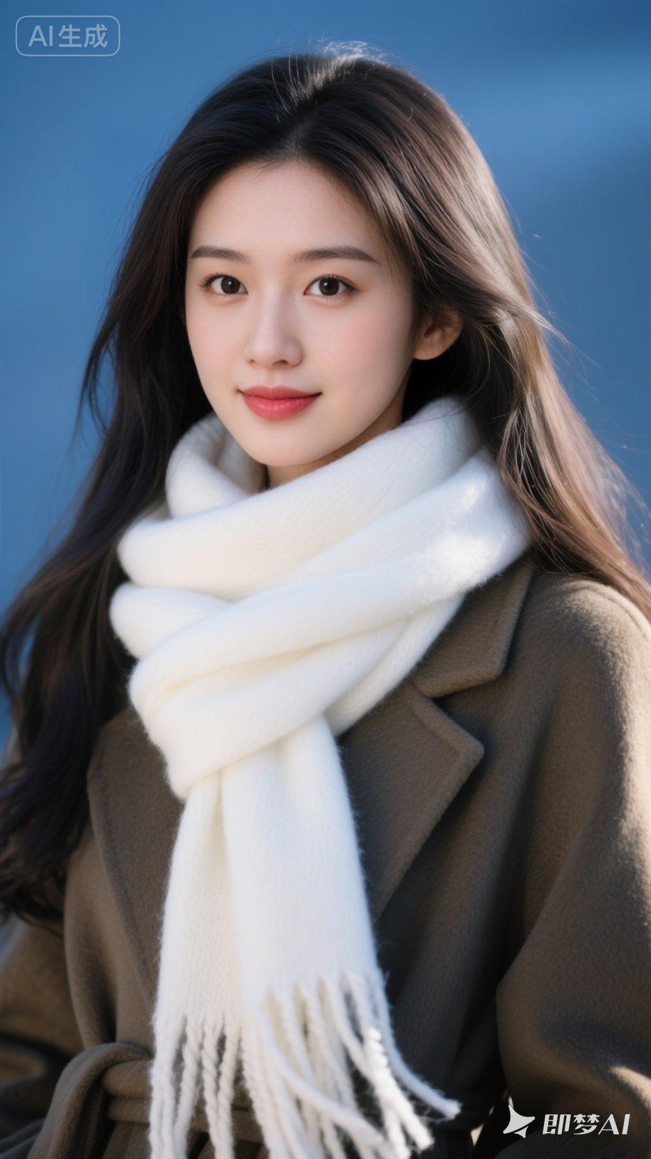 冬日暖阳下的温柔微笑,白色围巾与棕色大衣的完美搭配,尽显冬日时尚感。