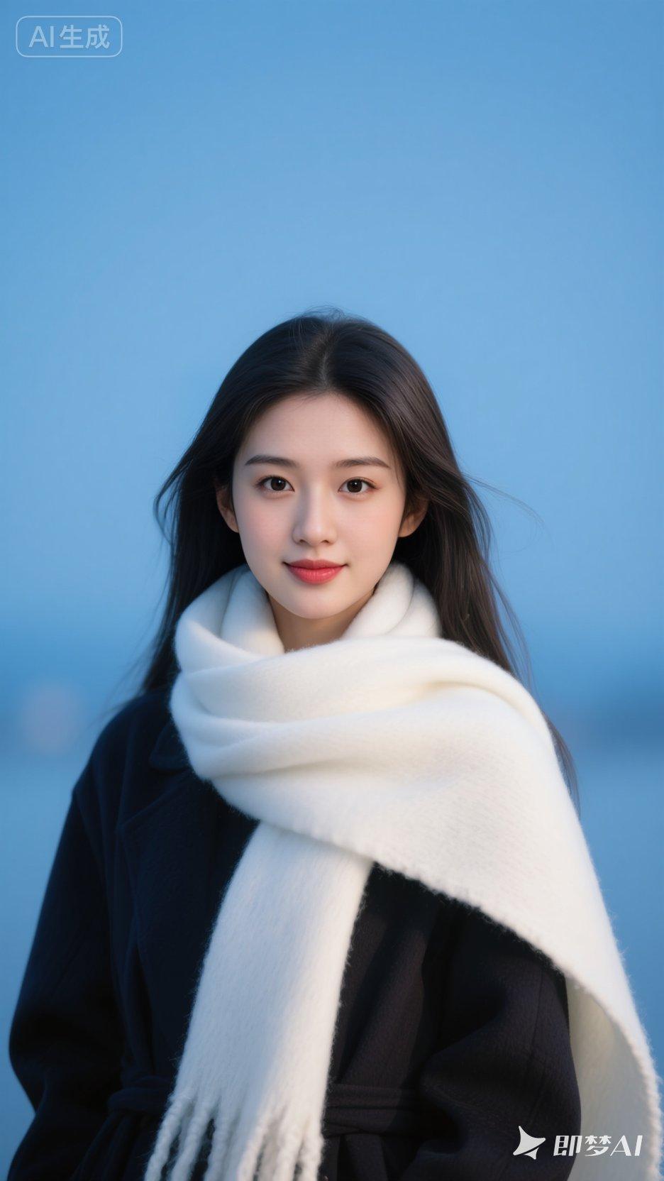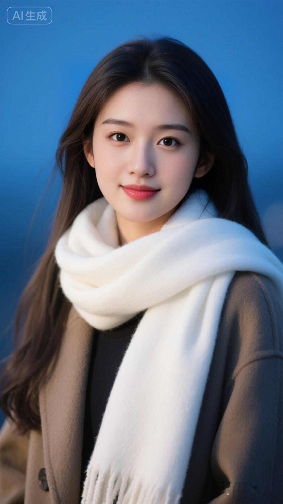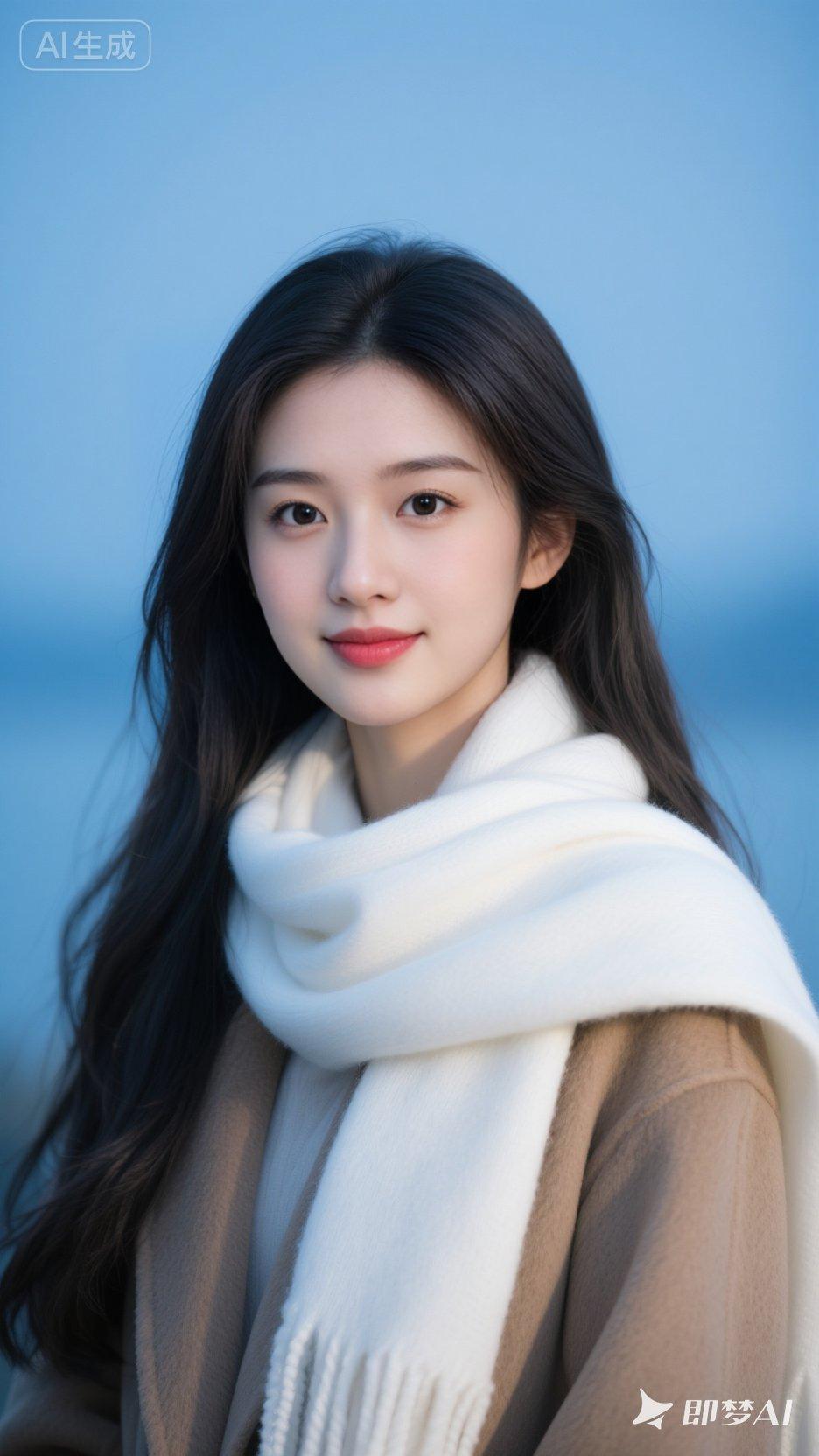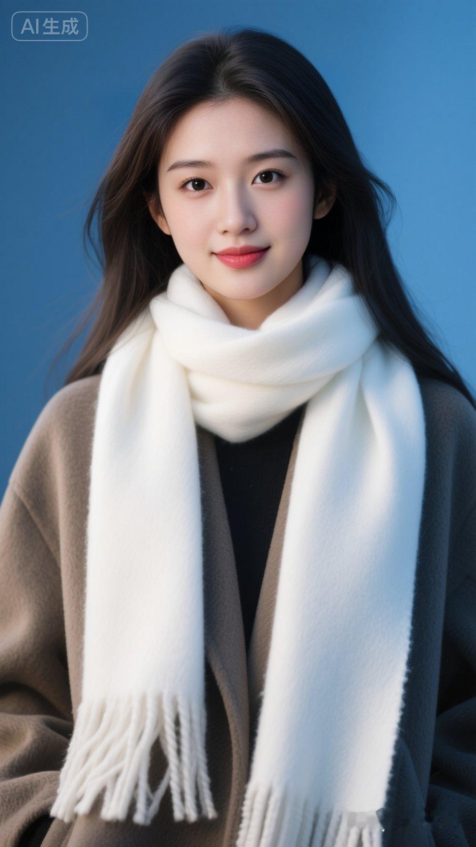 冬日暖阳下的温柔微笑,白色围巾与棕色大衣的完美搭配,尽显冬日时尚感。