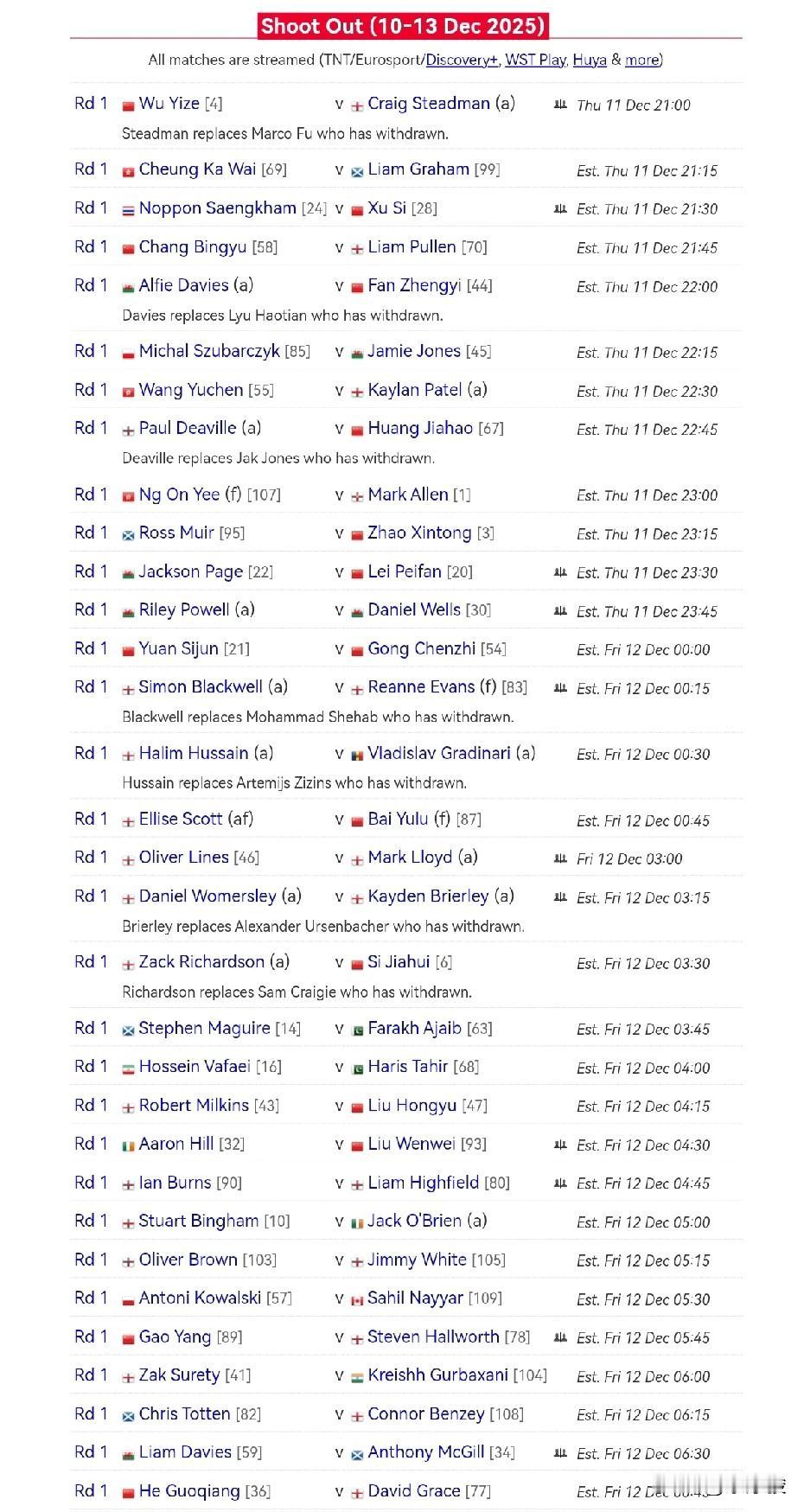 随着周跃龙89-0战胜布拉德福德,单局限时赛首个比赛日结束,中国球员9人出战,只有庞俊旭、蓝裕豪、许医尘、周跃龙4人晋级。欣喜的是,许医尘72-3击败塔猜亚。塔猜亚是快枪手,准度不错,也曾经获得过单局限时赛冠军。今晚明晨,18名中国球员出战,其中一场德比。 今晚明晨18名中国球员包括赵心童、吴宜泽、斯佳辉、袁思俊、雷佩凡、贺国强、徐思、范争一、刘宏宇、巩晨智、王雨晨、常冰玉、黄佳浩、张家玮、高阳、刘文炜、白雨露、吴安仪等,其中袁思俊和巩晨智上演一场德比。具体比赛时间见图。 祝中国球员好运!