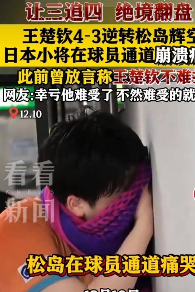 2025年12月11日WTT总决赛,王楚钦与松岛辉空这场比赛太刺激。赛前松岛辉空成绩亮眼,亚锦赛赢过王楚钦,还拿了法兰克福冠军赛男单冠军,甚至觉得王楚钦不算特别厉害。 比赛中松岛辉空2 - 0、3 - 1领先,第四局拿下时他满脸喜悦,以为稳赢。哪料王楚钦状态回升,连赢三局完成逆转。17岁的松岛辉空瞬间心态崩了,赛后面无表情离开,走下赛场靠着墙用毛巾捂着脸大哭。这一哭,有人觉得搞笑,也有人心疼,但球迷倒是释然了,还调侃松岛辉空没哭自己都睡不着。不得不说,竞技体育就是这么充满变数!