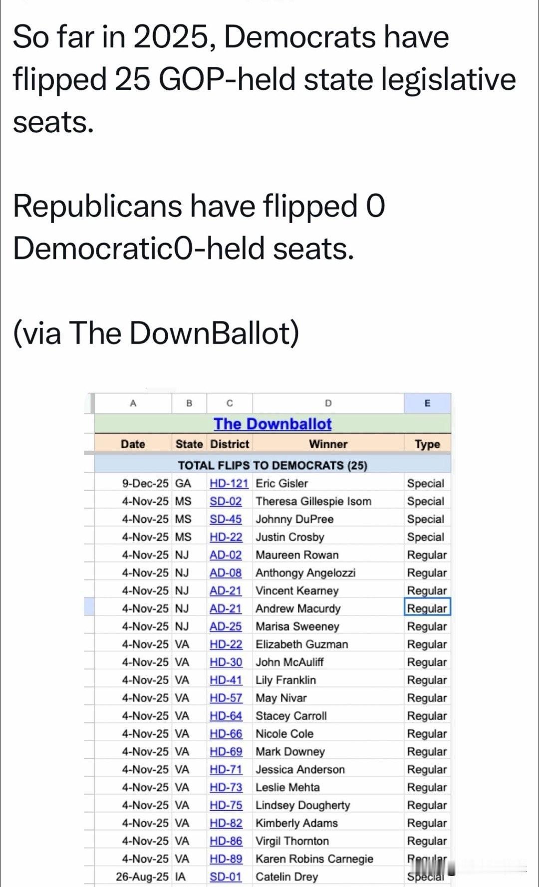 截至2025年,民主党已翻转25个原由共和党掌控的州议会席位。 共和党翻转的民主党席位:0。