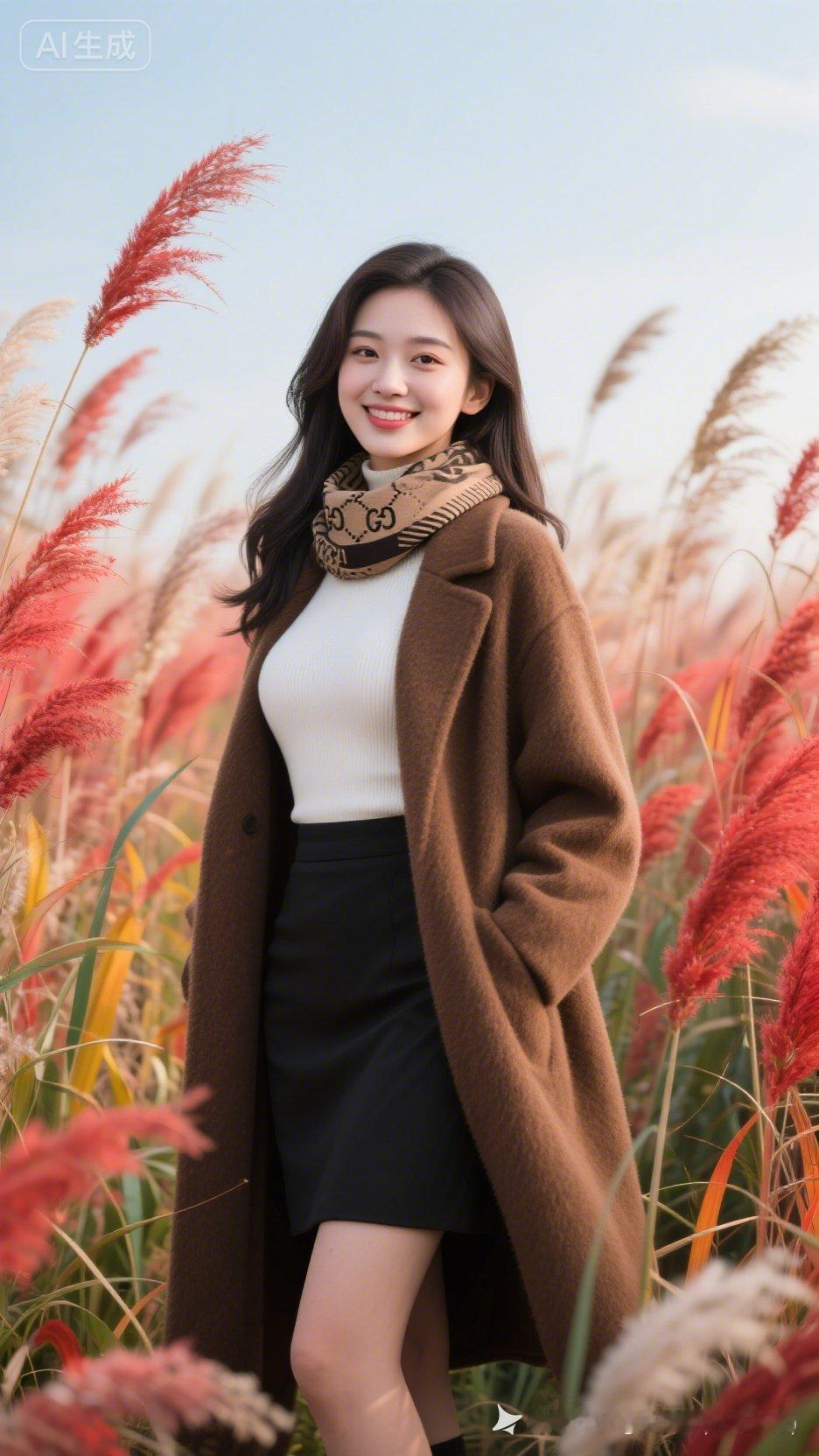 秋日暖阳下,红叶丛中,甜美笑容绽放,时尚穿搭尽显优雅。