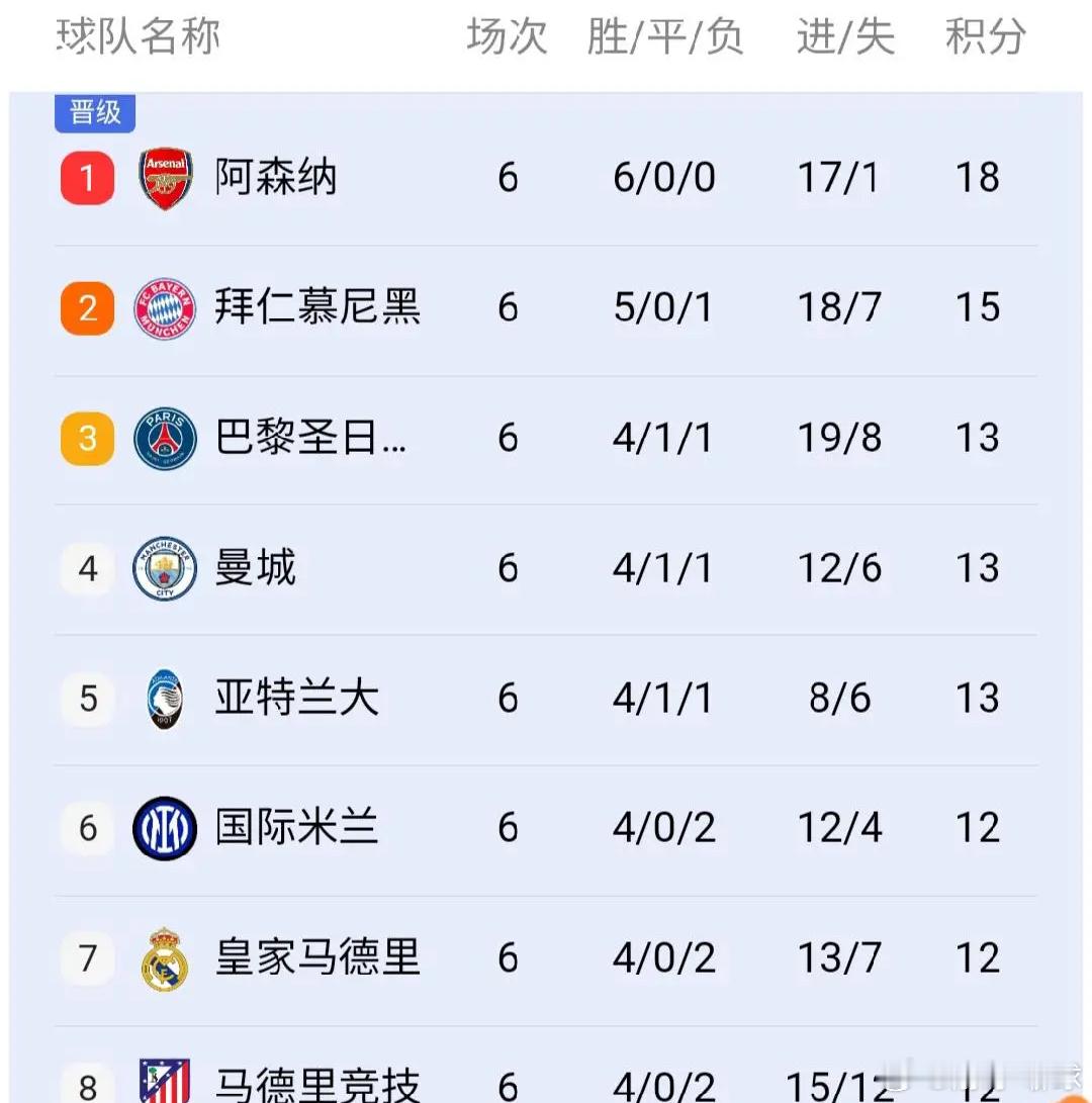 欧冠战报:皇马1-2,巴黎圣日耳曼0-0,阿森纳3-0,欧冠最新积分榜出炉今天凌晨,曼城做客2-1掀翻皇马,尤文主场2-0完胜帕福斯,多特主场2-2博德闪耀,阿森纳做客3-0布鲁日,本菲卡主场2-0那不勒斯,勒沃库森主场2-2纽卡,大巴黎做客0-0毕尔巴鄂竞技,比利亚雷亚尔主场2-3哥本哈根,卡拉巴赫主场2-4阿贾克斯。比赛结束之后,我们可以看到阿森纳一枝独秀,6连胜强势领跑,拜仁落后阿森纳3分紧随其后,大巴黎排名第三。曼城冲到了第4的位置。意甲两支球队在前八,分别是亚特兰大和国际米兰,皇马和马竞这两支西甲球队也在前八,可以看到英超也是2支球队在前八。德甲仅拜仁一支球队在前八,法甲也是一支球队。可以说五大联赛的球队还是比其他联赛的球队更具竞争力,毕竟实力摆在那里。第9到第20的球队距离前八最大分差仅3分,所以这些球队都还有较大希望获得前八,穆帅执教的本菲卡落后附加赛区1分,本菲卡依然有较大希望晋级。