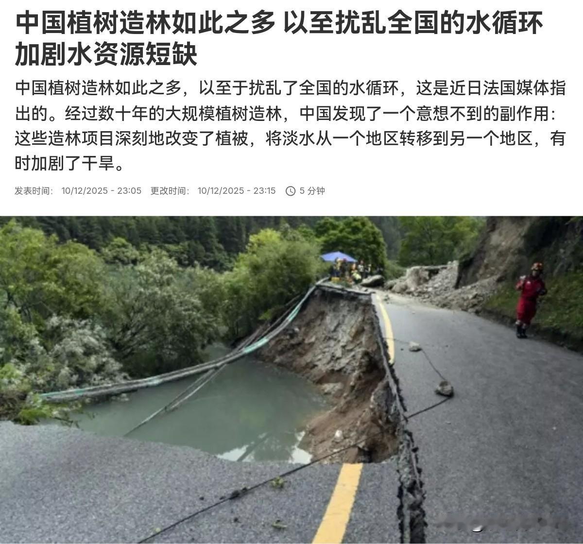 法媒对我们进行批评!法媒声称,中国植树造林过多,以至扰乱全国的水循环,加剧水资源短缺!12月11日,法新社刊文表示,中国植树造林如此之多,以至于扰乱了全国的水循环。经过数十年的大规模植树造林,中国发现了一个意想不到的“副作用”:这些造林项目深刻地改变了植被,将淡水从一个地区转移到另一个地区,有时加剧了干旱。 法媒声称,中国通过植树造林和恢复草原来减缓土地退化和气候变化的努力,已经深刻地改变了水循环。 植被覆盖的变化导致东部季风区和西北部干旱地区的人类和生态系统可利用的淡水减少。说实话,我们植树造林这事,都能够引起法媒的批评,这简直是骇人听闻。 那依法媒来看,为了不扰乱全国的水循环,不加剧水资源短缺,我们应该停止植树造林,请问是这个意思吗?中国植树造林的核心区域本就是干旱、半干旱的生态脆弱区,这些地方过去水土流失、土地沙化才是加剧干旱的元凶。植树造林带来的植被恢复,恰恰是在修复被破坏的水循环,而不是扰乱它。 事实上,植被根系能涵养水源、减少地表径流,森林更是天然的“蓄水池”,法媒连这种常识都不知道吗?因为中国植树造林成绩最突出,就颠倒黑白,鸡蛋里面挑骨头,对于中国植树造林的贡献选择性无视,这样搬弄是非的媒体,无疑非常的让人鄙视。这样的批评,只能说法媒对我们除了偏见,剩下的依旧全是偏见。