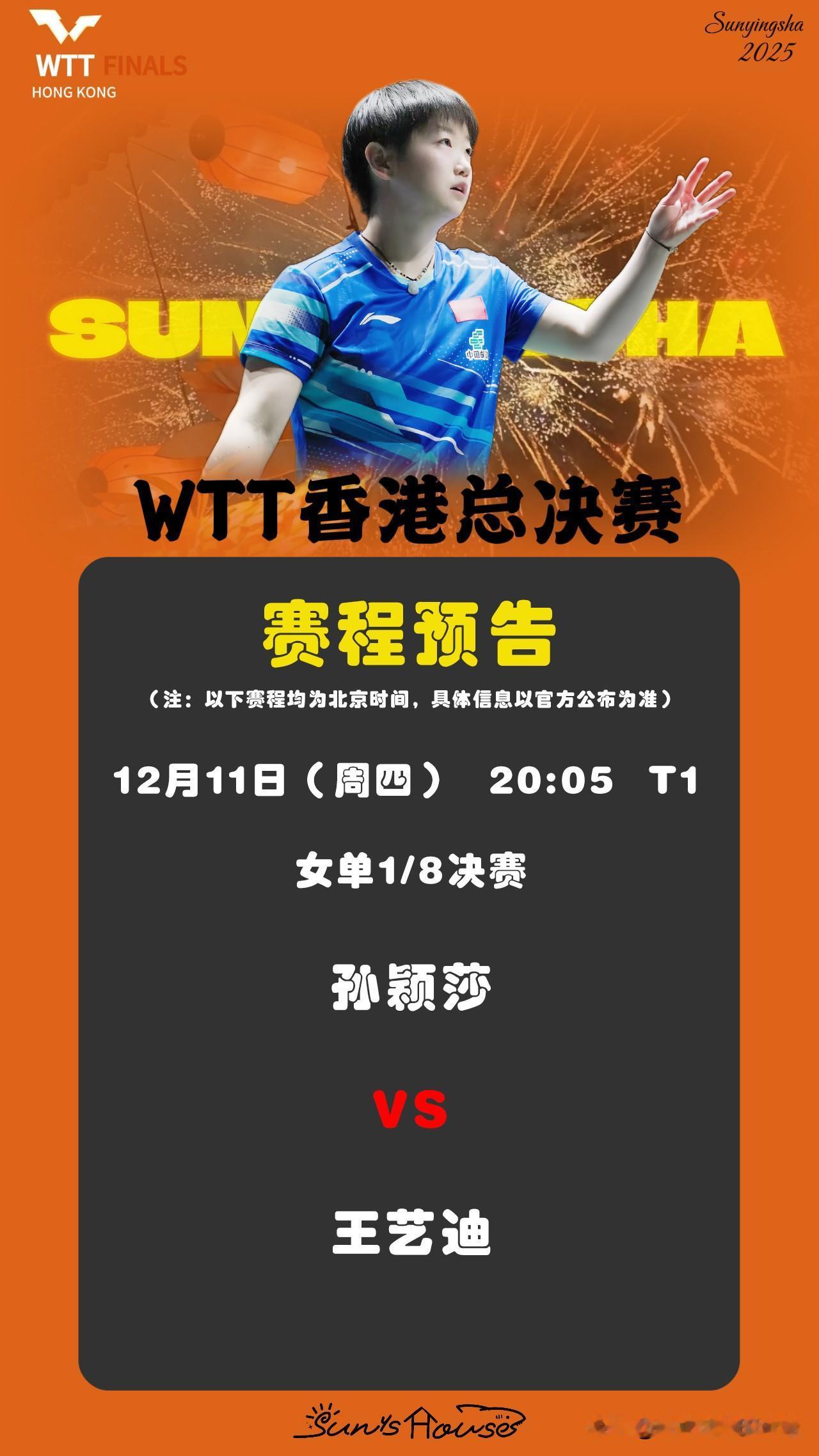 孙颖莎今日赛程预告:两场“内战” 1、12月11日(周四)14:40 混双小组循环赛: 王楚钦/孙颖莎🇨🇳VS林诗栋/蒯曼🇨🇳 2、12月11日(周四)20:05 女单1/8决赛: 孙颖莎🇨🇳(世界第一)VS王艺迪🇨🇳(世界第五)