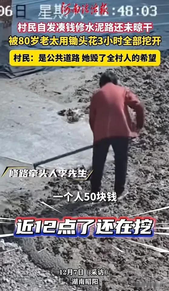 [发怒]80岁老人怒挖村路引众议:是蛮不讲理还是权益受损?真相藏着人性的复杂…… 80岁老太太用锄头花3小时全部挖开。老太太:你们修路占了我家的地!负责人:“这不是她家的地,公家的路还给她留了两米,可她就是要把修好的路给挖了,报案都没用,全村的希望都被她毁了!” 一边是年过八旬、手持锄头护地的老人,一边是满心委屈、指责老人毁了全村希望的负责人,双方各执一词,这事瞬间引发热议。有人骂老人固执自私,好好的村路说挖就挖,耽误全村出行,不顾集体利益;也有人替老人发声,若不是权益真受了损,谁会一把年纪费力气做这种招骂的事,或许是沟通出了纰漏。 村路本是惠及全村的民生工程,承载着大家出行便利的期待,被挖断确实可惜,负责人的焦急不难理解。但老人的坚持,背后大概率藏着对土地的执念——老一辈人对土地感情深厚,若认定自家地被占用且未得到合理说法,难免会用极端方式维权,这是人性里对自身权益的本能守护,而非单纯的蛮不讲理。 这事看似是个人与集体的冲突,本质上是沟通缺位和权益界定的问题。修路前若能提前和老人充分沟通,把土地归属、补偿方案说清讲透,打消老人的顾虑,或许就不会闹到这般地步。报案没用的背后,也藏着基层治理中处理邻里纠纷、权益纠纷的难题,既要维护集体利益,也不能忽视个体的合理诉求。 全村的希望不该因一场纠纷落空,老人的权益也该被正视。期待后续能有第三方介入,查清土地归属真相,搭建沟通桥梁,既妥善解决老人的诉求,也尽快修复村路,让民生工程真正惠及大家。你觉得这事谁更有理?评论区说说你的看法~ 乡村修路 乡村修路纠纷
