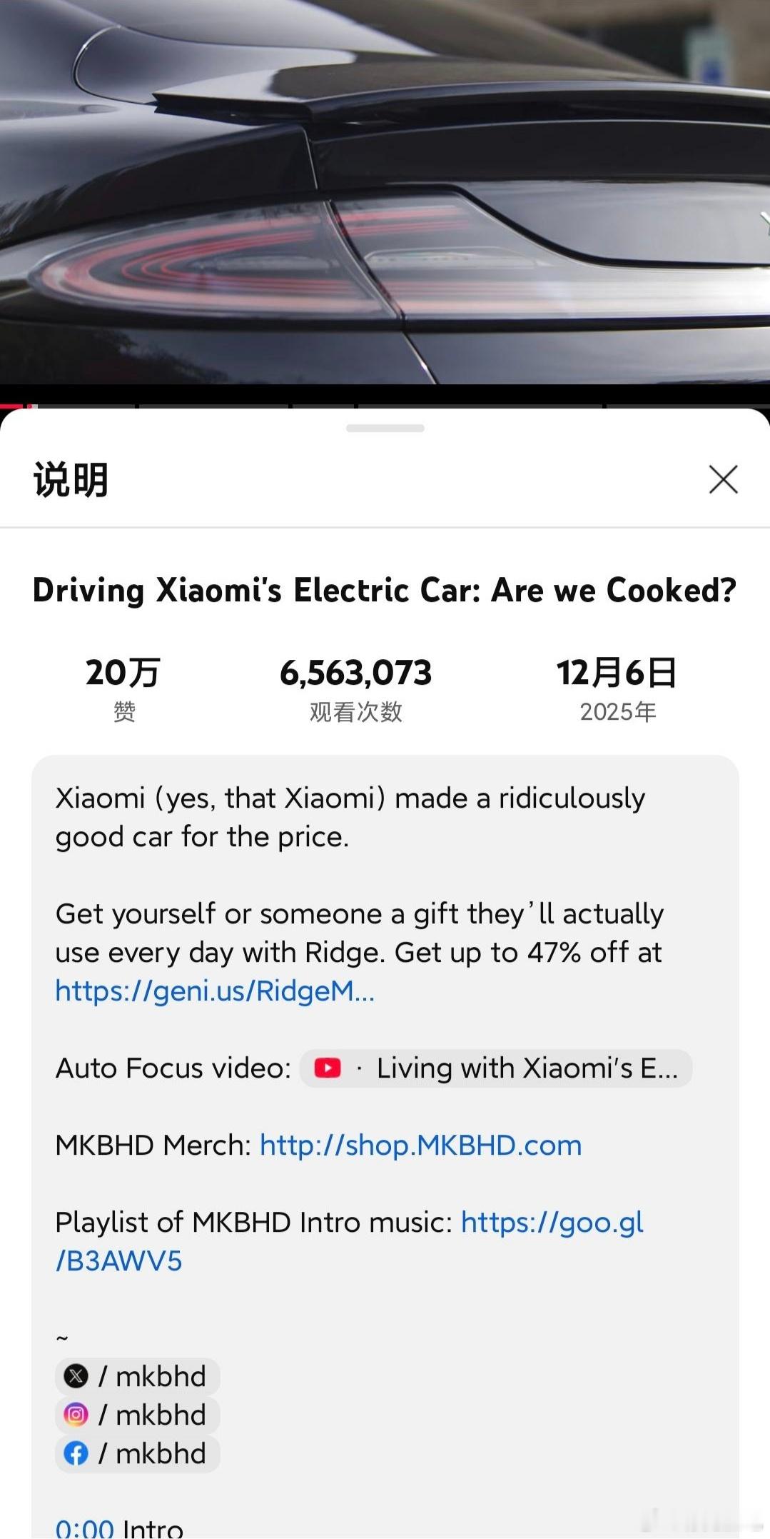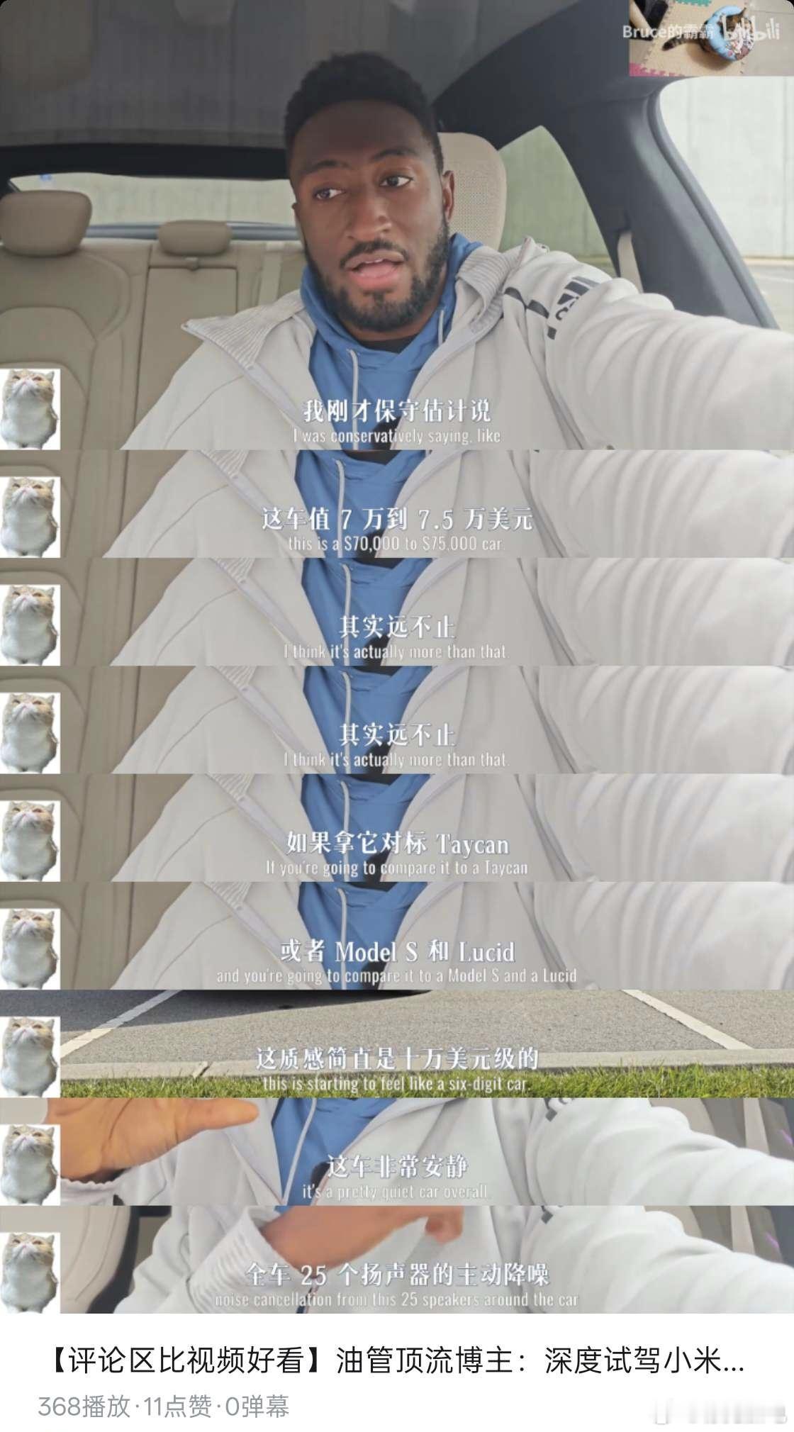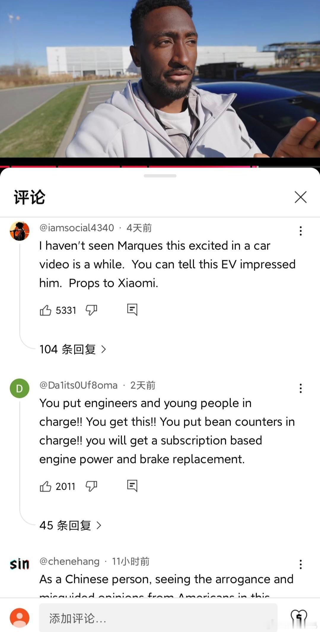 全球最大的数码博主MKBHD测评小米su7拥有656万播放量,认为应该卖到7.5万刀以上,并且视频底下热评基本都是夸赞小米,开个几个星期,又在汽车子频道称值10万刀。科普一下mkbhd:被谷歌前副总裁vic gundotro称为全球最好的数码测评up之一,youtube关注超2060万,x也有超600万粉丝,是全球流量最大的数码博主之一我看了这哥们的视频,给人的感觉是真专业啊,从策划表达拍摄到制作。表达极其流畅,优缺点很中肯和准确,各个方面和其他近似车型会有比较一起说。国内能达到这个水准的,真不多。