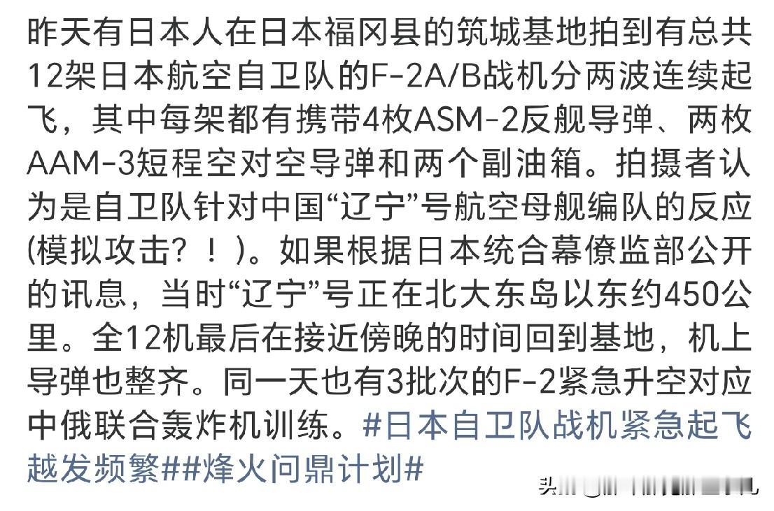 打不过归打不过,不过看得出,本子确实有想攻击的想法。 就和当年轰六挂着鹰击6冲美航母战斗群一样,懂军事的都知道什么结果。 除了神风小队实在不知道该如何把这170公里的弹送到投放点。 估计半路先收到的是PL15的WIFI信号了。一架J15就能带6-8枚PL15,一个双机组合就能让这12架F2全去捞鱼,还一脸懵逼。