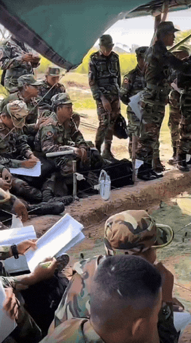 按照以往的惯例,能在前线看到这样的场面,基本上可以确定,接下来有大仗要打了。 你别看柬埔寨军队武器装备落后,但整沙盘地图这方面还是像模像样的。 但我认为他们真的太掉以轻心了。在现代战争中,几十个军官集中在一起,明目张胆在户外摆沙盘研究战术,风险实在太大,很容易被对方给“一锅端”掉。 更重要的是,泰方具备这个能力。