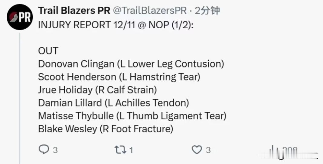 开拓者对阵鹈鹕内线门户大开,杨翰森临危受命再次带伤首发出战? 挑战鹈鹕队13号状态爆炸的奎因?这场对于杨翰森来说既是机遇更多的是挑战! 开拓者中锋全都伤了!克林根(左腿挫伤)、罗威(生病)、杨翰森(面部挫伤加流感)! 开拓者最新发布报告显示,开拓者6人确定缺席明天的比赛,他们是克林根(左腿挫伤)、亨德森(左腿腿筋撕裂)、朱-霍勒迪(右腿小腿拉伤)、利拉德(左腿跟腱伤势)、塞布尔(左手拇指韧带撕裂)和韦斯利(右脚骨折)。 被列为出战成疑的除了瀚森,还有罗威(生病)。