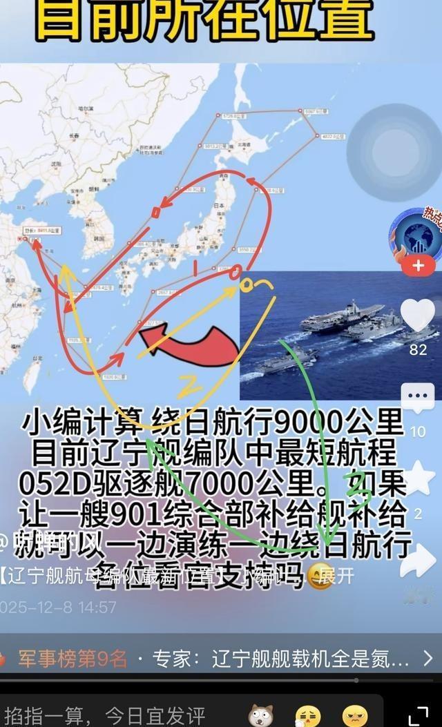 这次辽宁舰没带补给舰,我预测了三种可能性:1.红线路线,在琉球南侧执行军事任务,并等待琉球北侧的903a综合补给舰编队到达后沿着津轻海峡环日本航行,在东京以南七八百公里甚至五百公里左右起飞战机j15进行军事任务,进行威慑东京。之后沿着日本海岸线继续北上在津轻海峡一侧进入日本海。 辽宁舰编队12月初从青岛出发,穿越宫古海峡进入菲律宾海,没有随行补给舰。编队包括055型驱逐舰鞍山舰和054A型护卫舰临沂舰,在琉球南侧海域开展训练。期间J-15舰载机起降超过100架次,日本F-15战机接近监视,中方战机使用火控雷达锁定日机持续数分钟。日本防卫省发布消息,称辽宁舰沿琉球群岛东侧北上,至喜界岛东约190公里海域。 预测第一种红线路线,辽宁舰在琉球南侧完成任务后,等待北侧903A型补给舰如东平湖舰汇合,通过津轻海峡绕日本航行。在东京南七八百公里或五百公里处起飞J-15执行任务,展示能力。随后沿海岸线北进,进入日本海,在新潟西五百公里处再次起飞战机,之后经对马海峡返回。 第二种黄线路线,不等补给舰,直接在琉球南完成威慑后,沿海岸线到东京南五百至七八百公里进行起降任务,然后返航。第三种路线,在琉球南等待补给舰,北上东京南完成任务后,南下至关岛西五百公里起降威慑关岛,再返航。这些路线基于补给舰航速22节的特点,需在指定点碰头补给,但补给时易受干扰,需驱逐舰警戒。 高市早苗称自卫队未干扰中方训练,但提出抗议,要求避免类似活动。她指示加强冲绳部署,推动在那国岛和宫古岛导弹阵地建设。中国国防部回应训练合法,敦促日方停止干扰。事件未升级冲突,中日关系保持紧张。