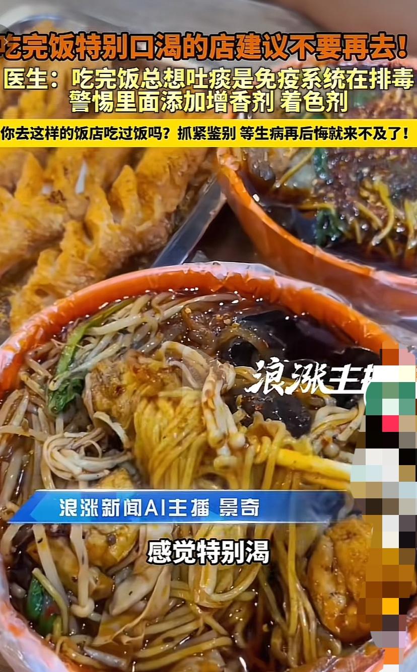 外面吃东西容易口渴?嘴巴告诉你有科技狠活 郑州大学第一附属医院肿瘤科医生李主任建议大家,在外面吃饭如果饭后口渴甚至总想吐痰,这家店再好吃也不要去了,尤其是吃完饭总想吐痰的,说明免疫系统在主动排毒。 这不是咸的原因,是食品中添加了增香剂、着色剂,单纯咸只会让你喝白水,不会让你想吐痰,如果经常摄入会对身体造成不可逆转的局面,等生病再后悔就来不及了。为了自己的身体健康还是要多注意。